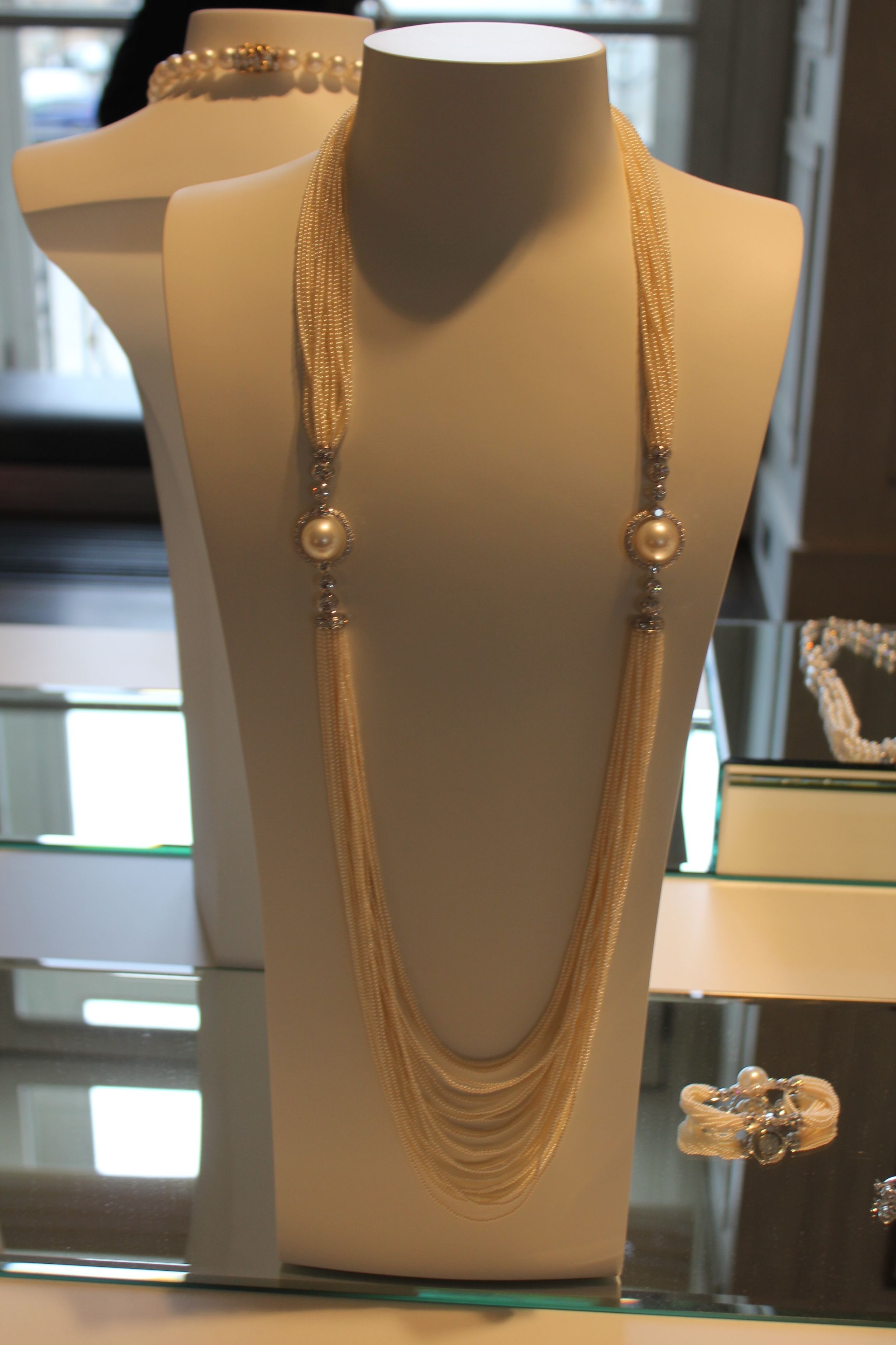 Mademoiselle Chanel aimait les perles à la folie. Elle les portait en toutes circonstances, le jour comme le soir, même en tenue de sport, sur un sweater et un pantalon masculin. Faire-valoir occulte de la part la plus féminine d’elle-même, elle avait avec elles des affinités secrètes et les portait comme un talisman.