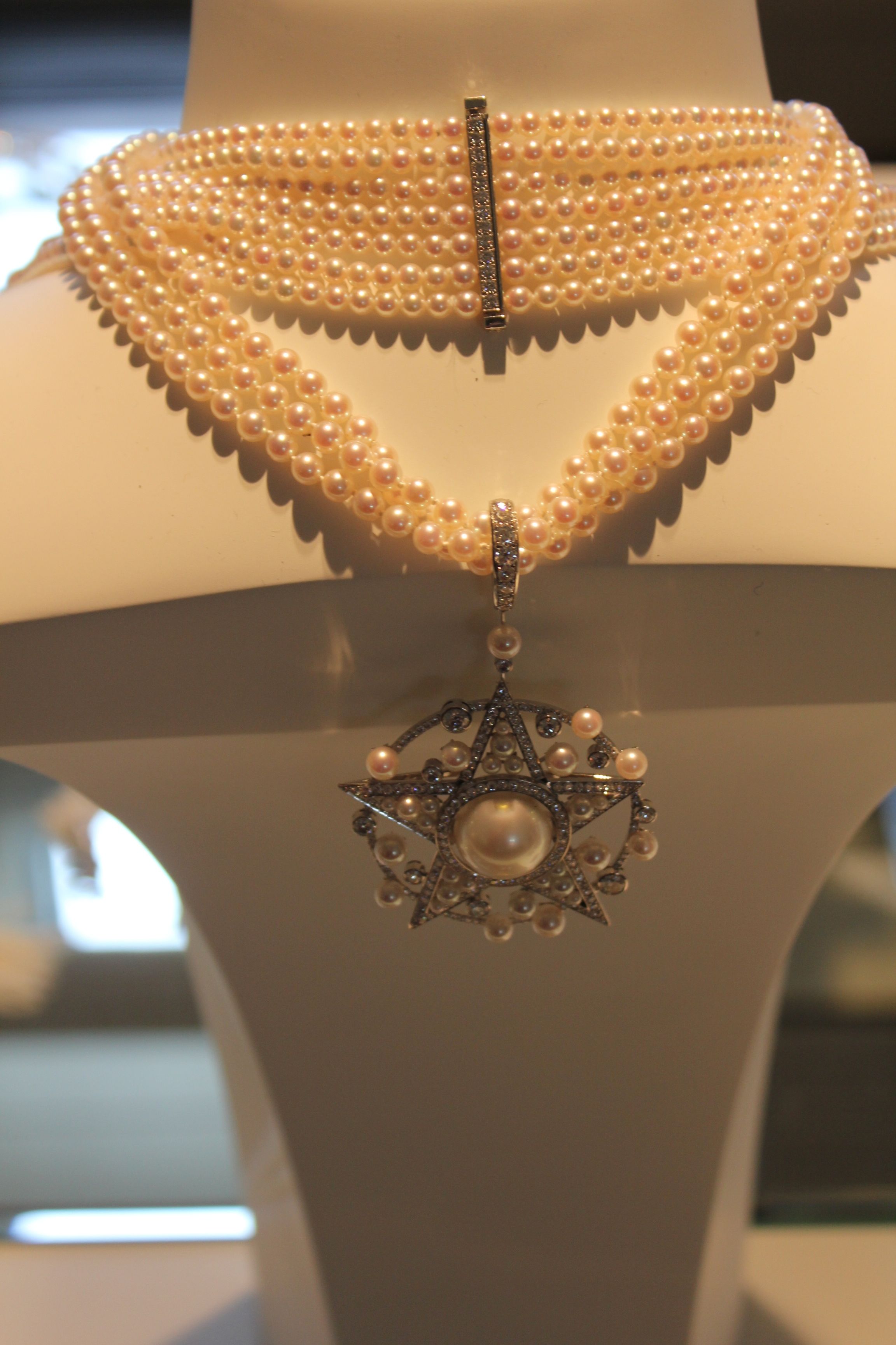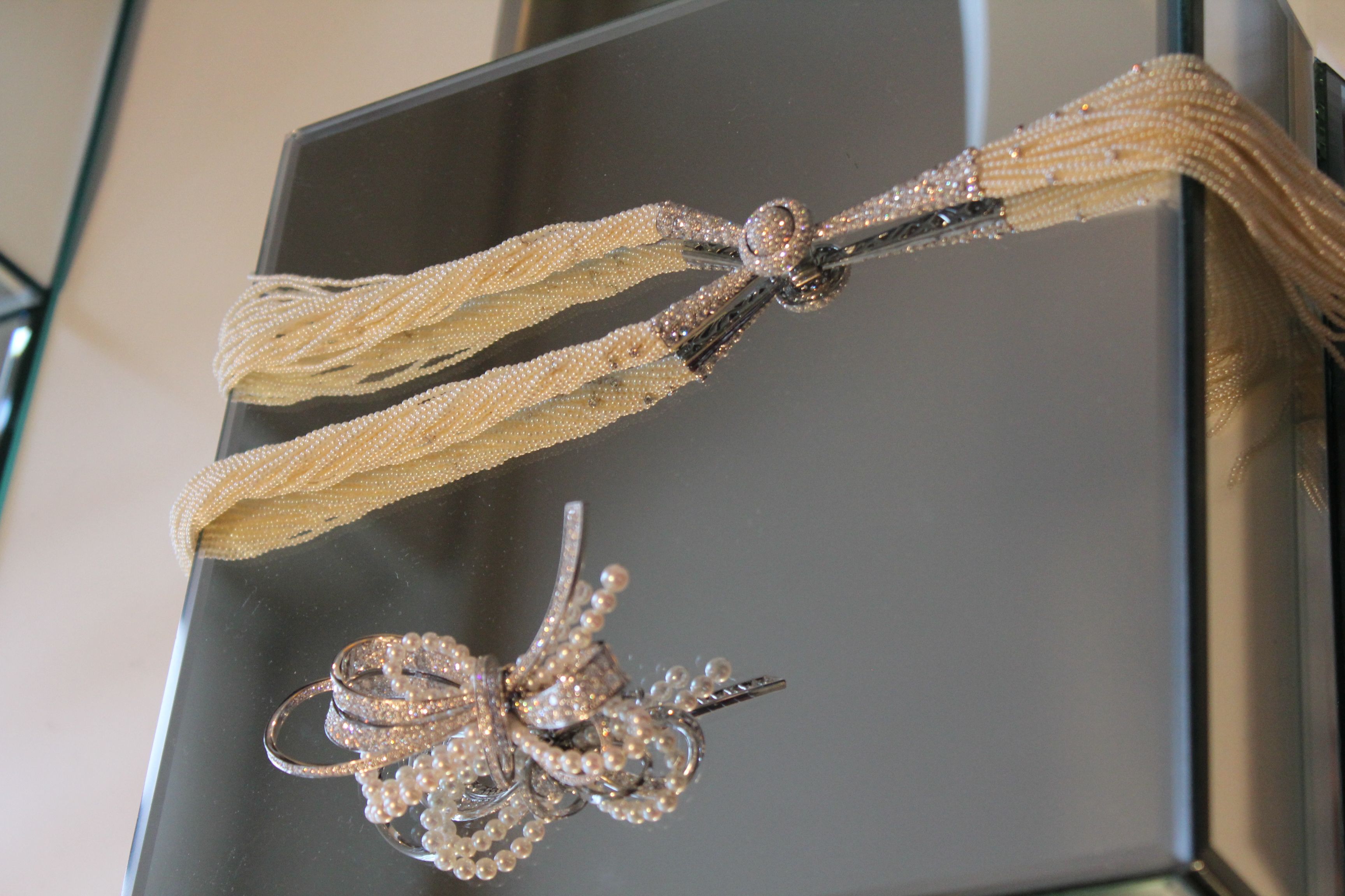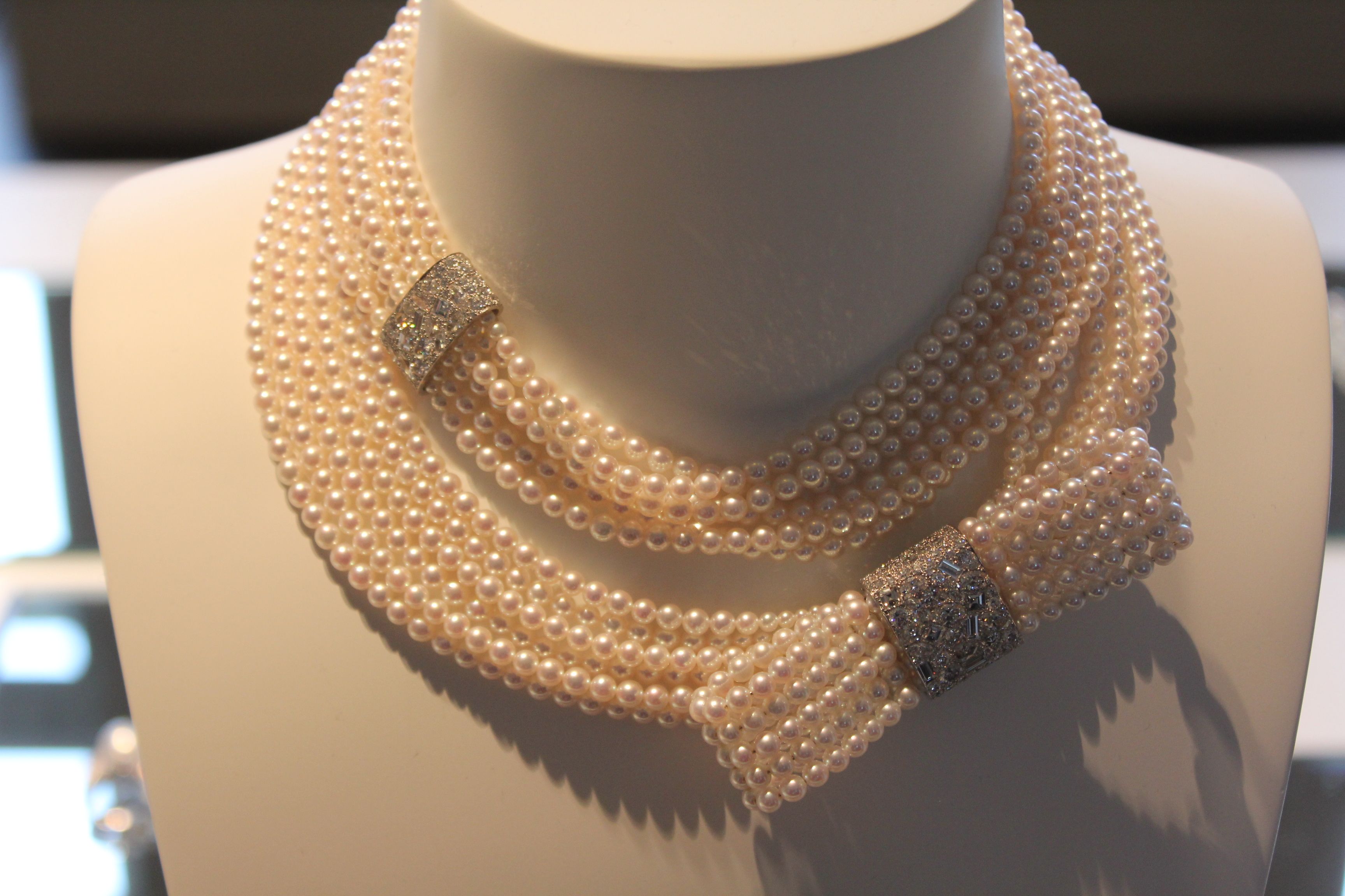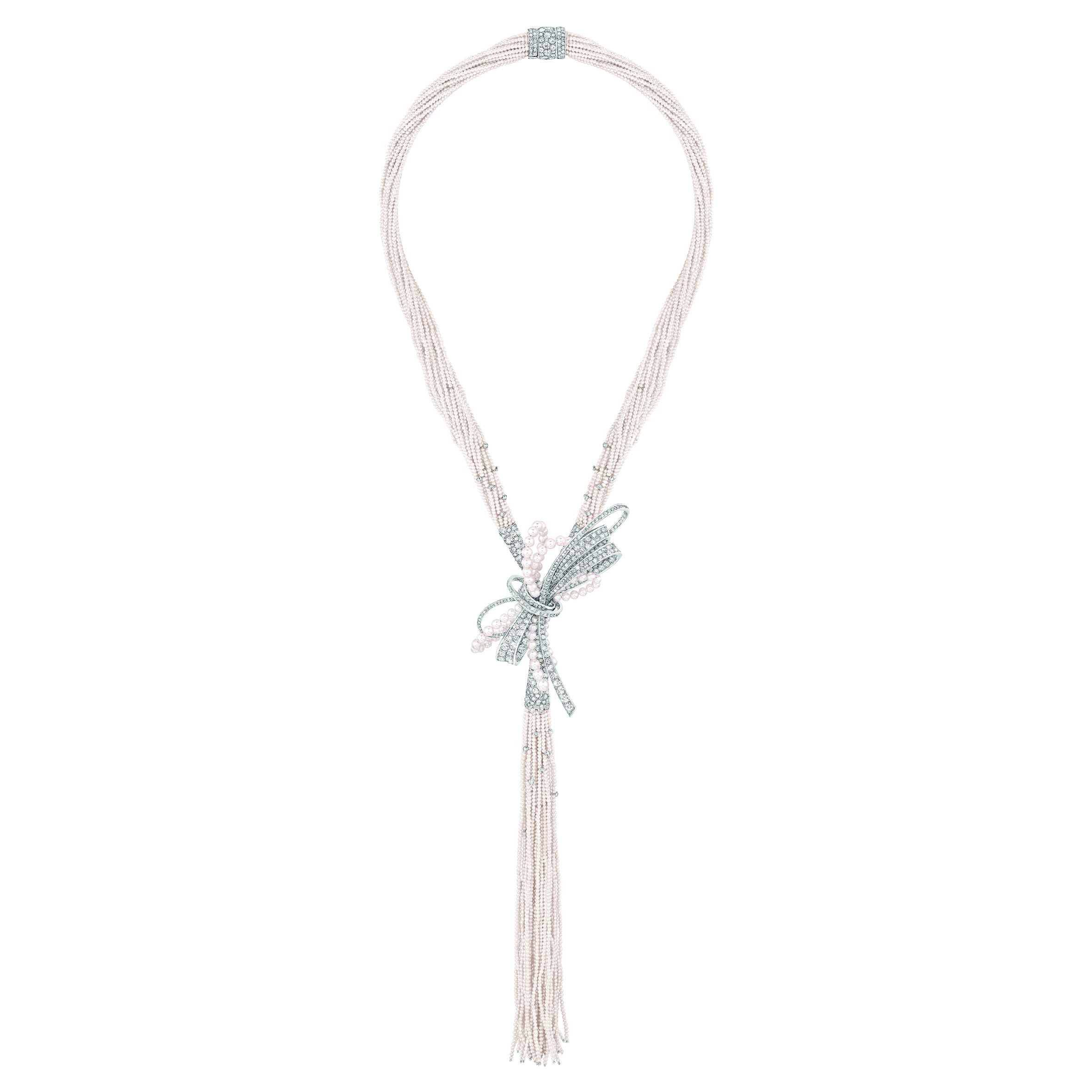 Collier « Perles de Couture » en or blanc 18 carats serti de 804 diamants taille brillant pour un poids total de 21,98 carats, 78 perles de culture du Japon de 3 à 5,2 mm de diamètre, 22 demi-perles fines et 44 rangs de perles fines. Motif nœud amovible, peut être porté en broche.