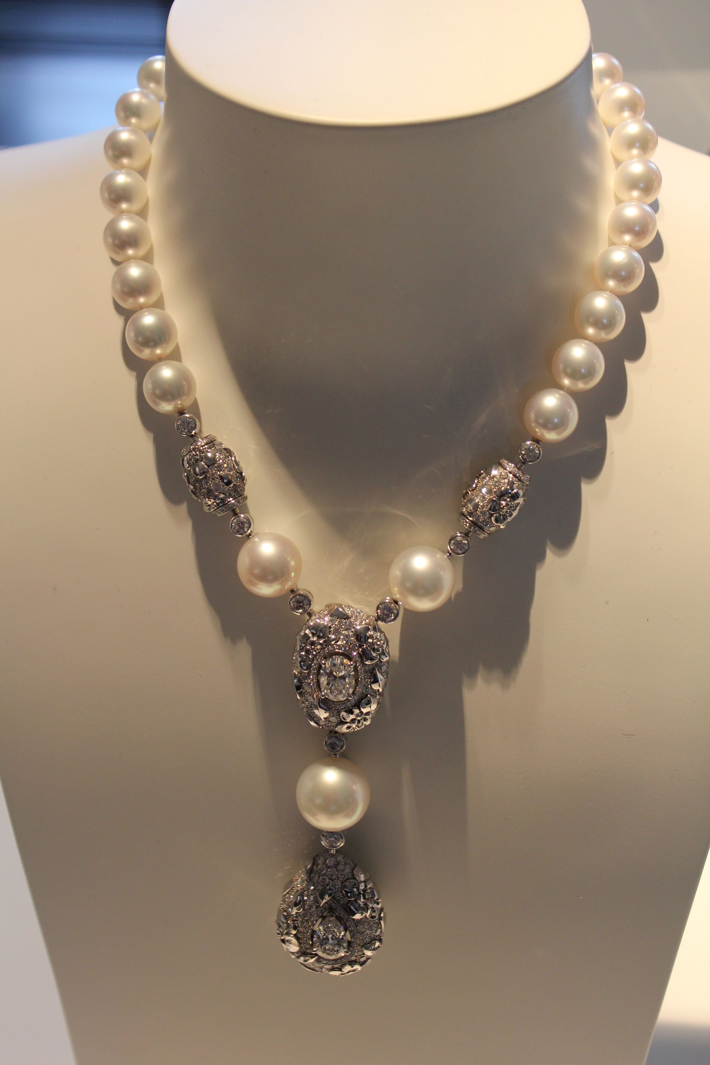 Collier «Comète Perlée» en or blanc 18 carats serti de 202 diamants taille brillant pour un poids total de 4 carats, 1 perle de culture des Mers du Sud de 15,3 mm de diamètre et 273 perles de culture du Japon.