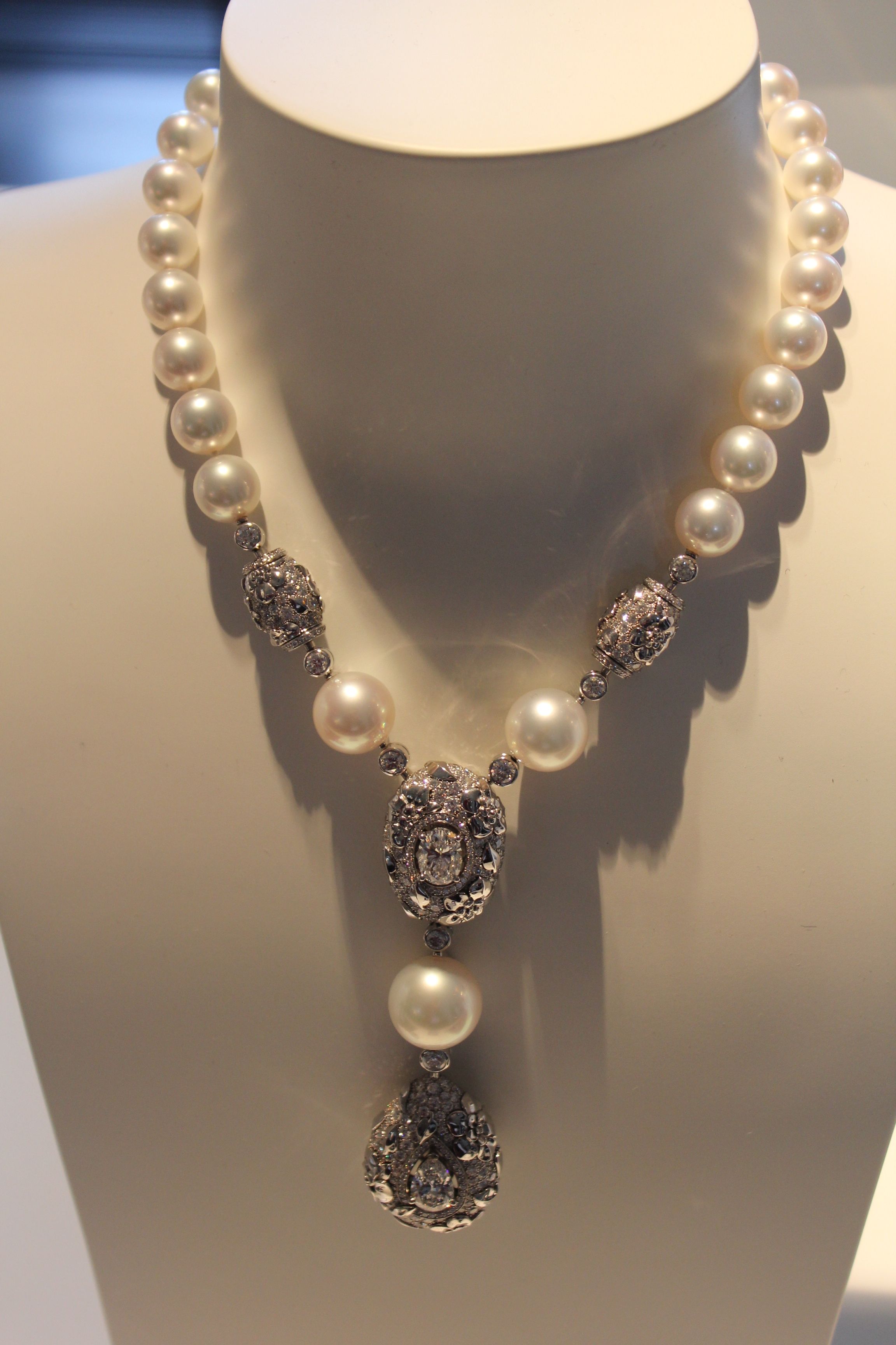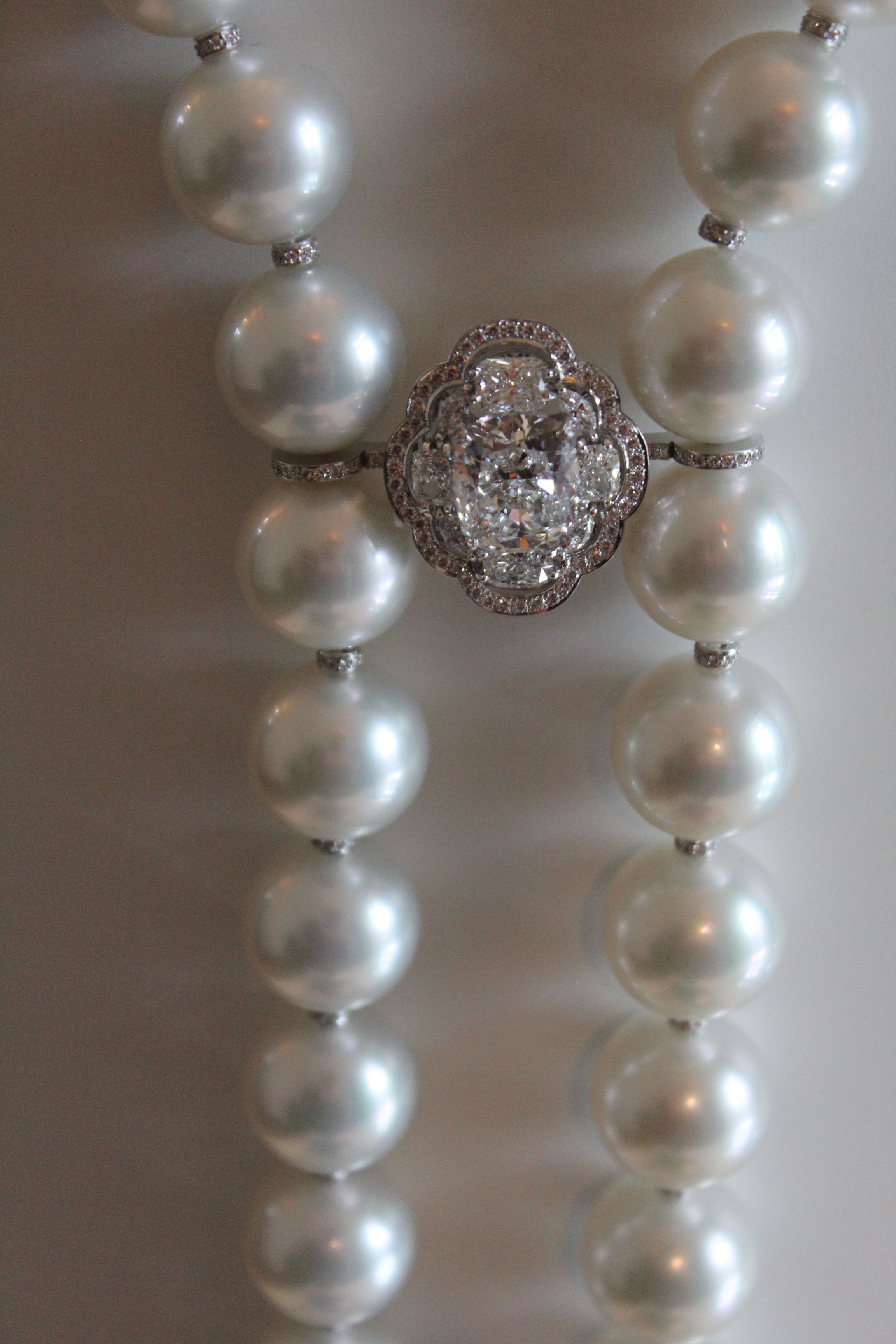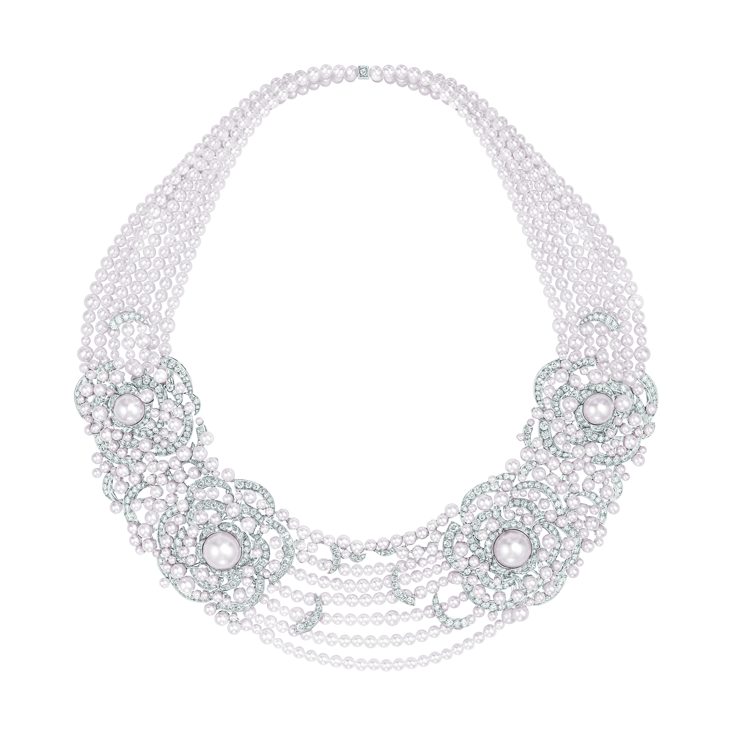 Collier « Rosée de Camélia» en or blanc 18 carats serti de 509 diamants taille brillant pour un poids total de 16,7 carats, 4 perles de culture des Mers du Sud de 10,4 à 12,5 mm de diamètre et 834 perles de culture du Japon de 2,4 à 5,7 mm de diamètre.