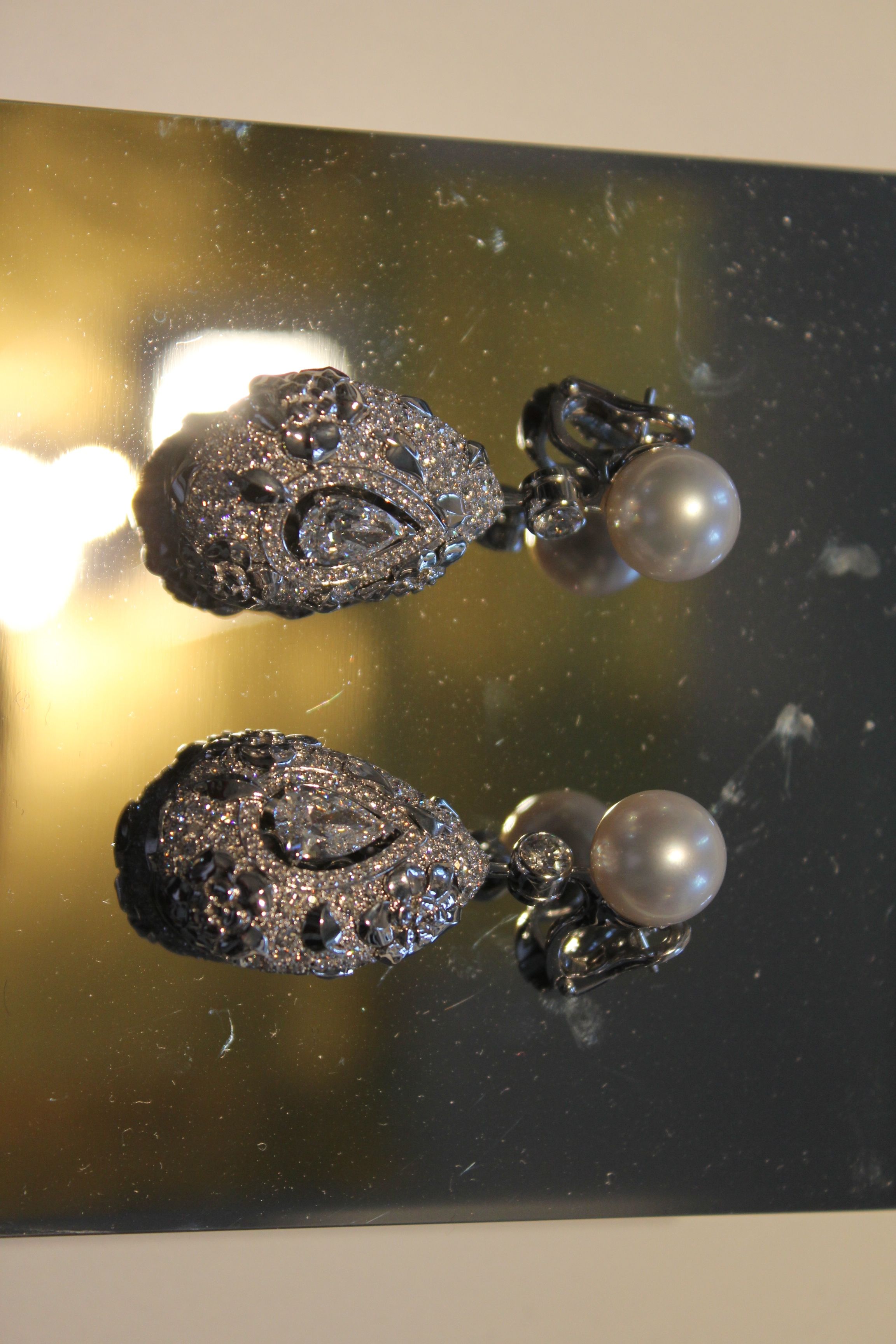 Boucles d’oreille «Comète Perlée» en or blanc 18 carats serti de 260 diamants taille brillant pour un poids total de 3,3 carats, 2 perles de culture des Mers du Sud de 10 mm de diamètre chacune et 46 perles de culture du Japon.