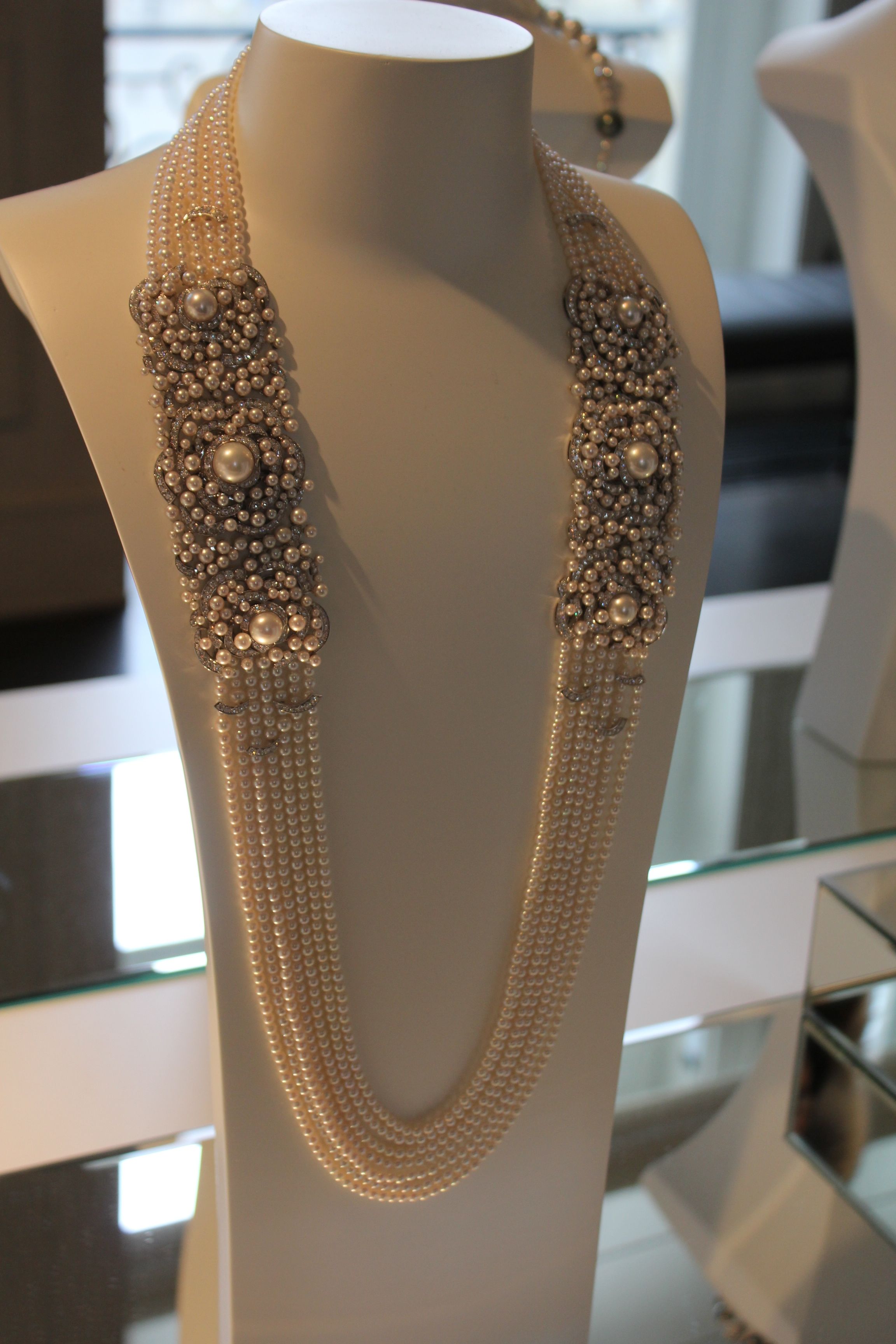 Collier « Plume Perlée de CHANEL» en or blanc 18 carats serti de 362 diamants taille brillant pour un poids total de 5 carats et 320 perles de culture du Japon de 2,8 à 9,5 mm de diamètre.
