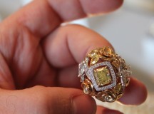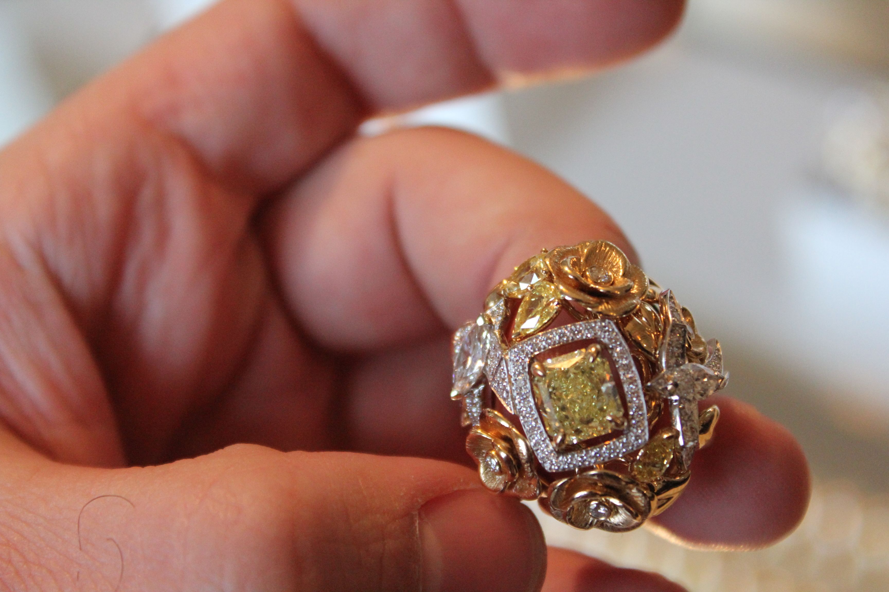 Bague Envolée Solaire en or blanc et jaune 18 carats sertis d’un diamant jaune taille radiant de 2 carats, 2 diamants blancs taille marquise, 68 diamants blancs taille brillant et 3 diamants jaunes taille poire.