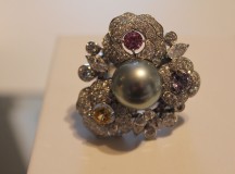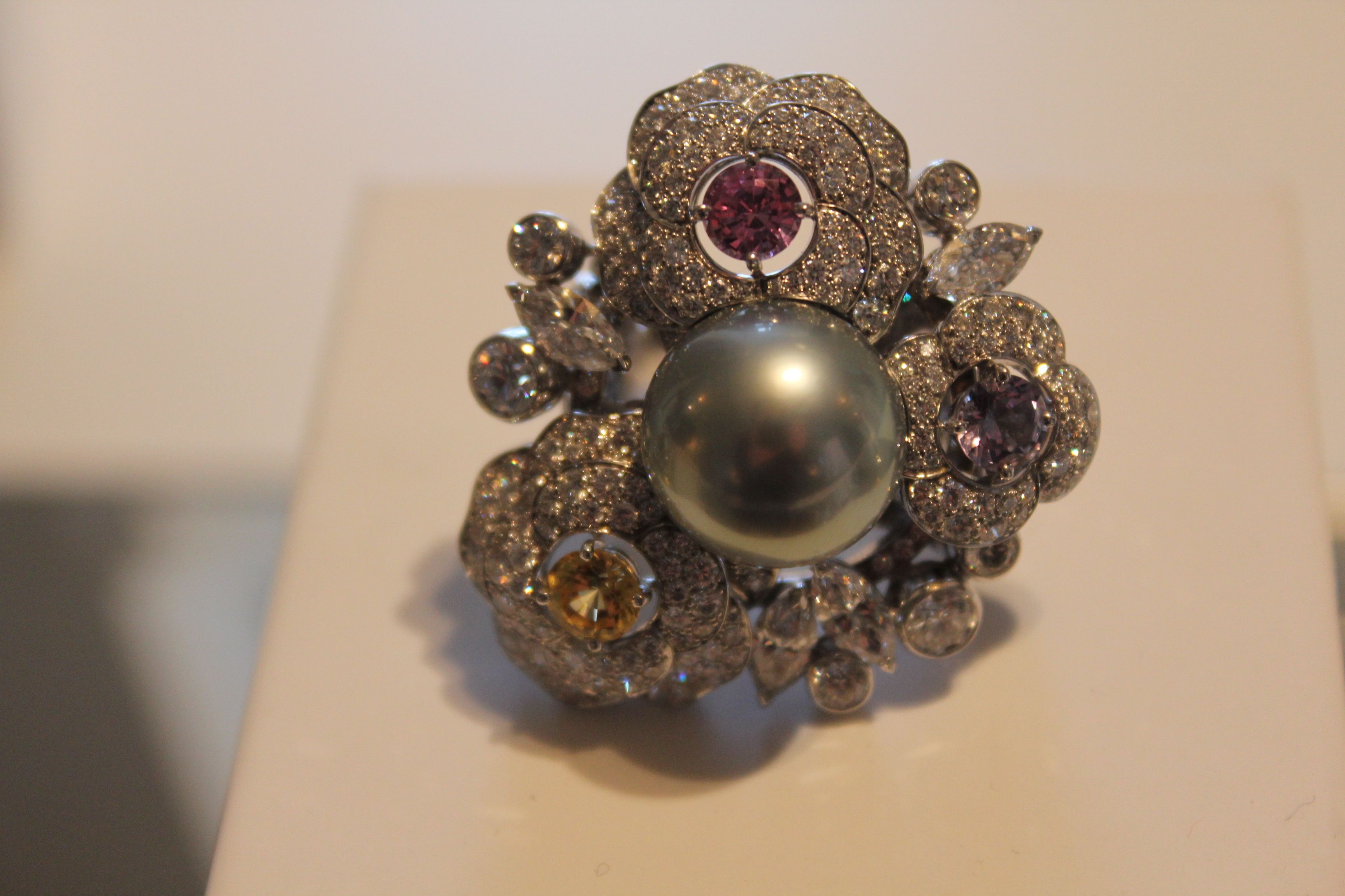 Bague « Printemps de Camélia » en or blanc 18 carats serti de 252 diamants taille brillant pour un poids total de 4,3 carats, 4 diamants taille marquise pour un poids total de 1,2 carat, 3 saphirs multicolores taille brillant pour un poids total de 1,7 carat et 1 perle de culture de Tahiti de 13,2 mm de diamètre.