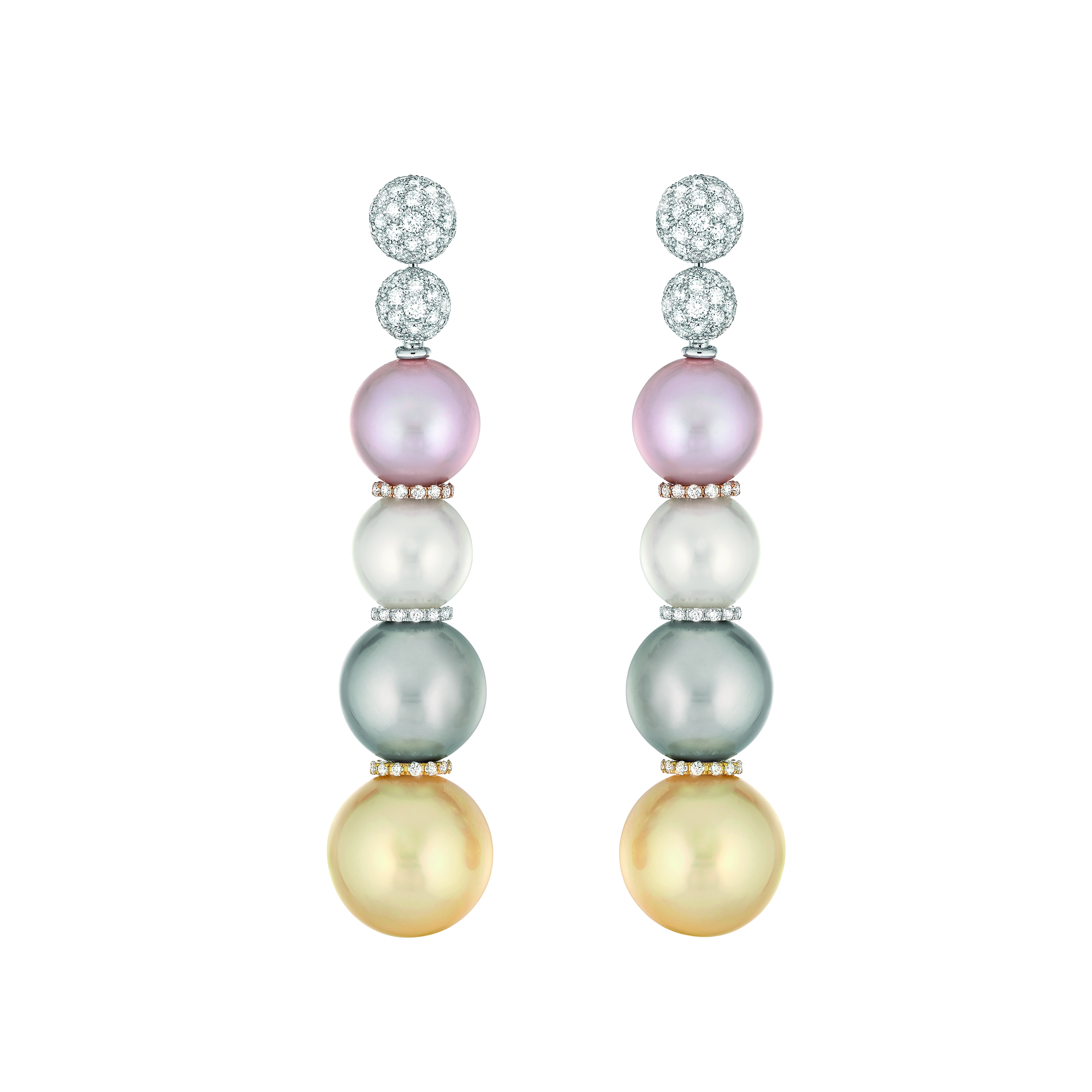 Boucles d’oreilles « Perles Swing » en or blanc, jaune et rose 18 carats, diamants, perles de culture des Mers du Sud, de Tahiti et d’eau douce.