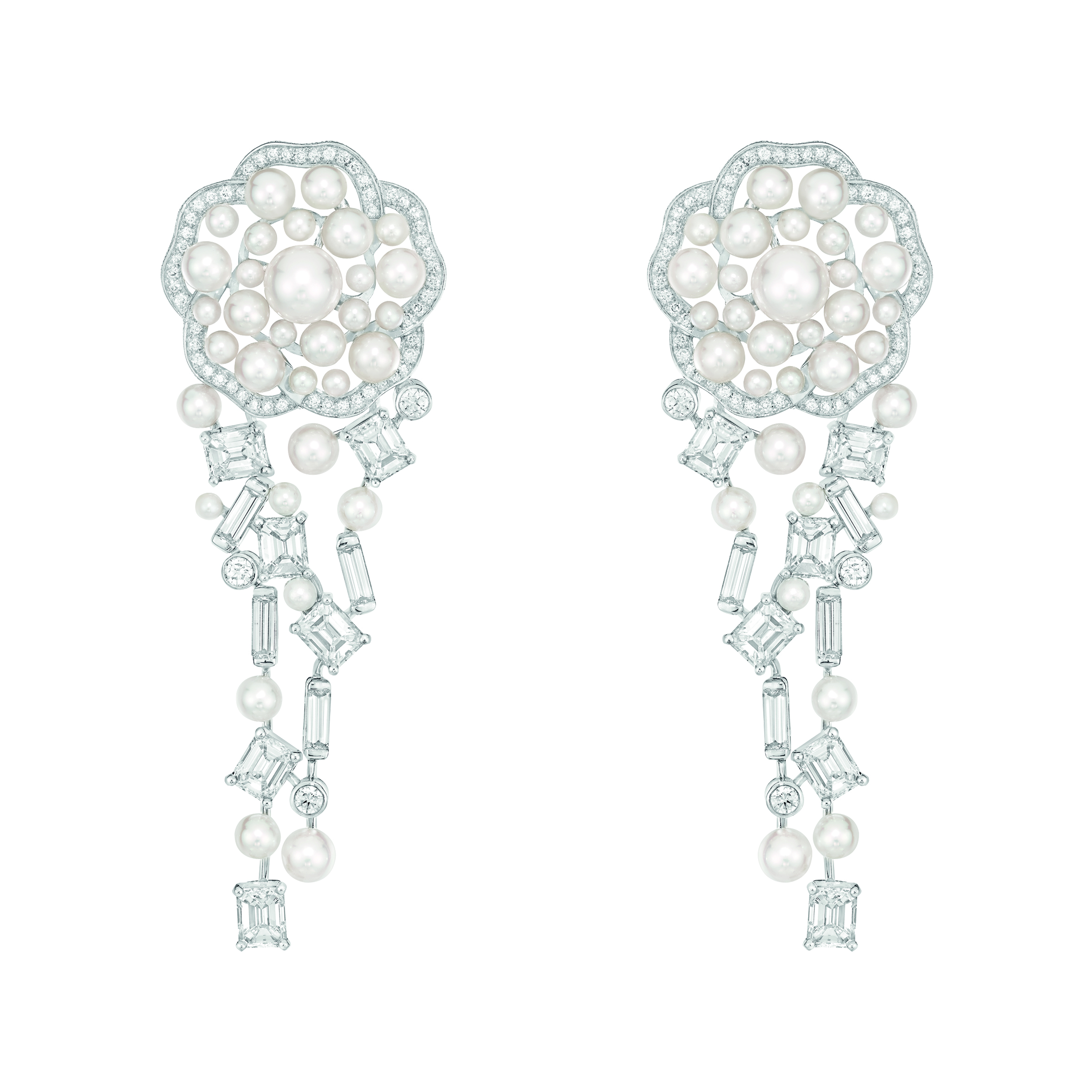 Boucles d’oreilles « Pluie de Camélia » en or blanc 18 carats serti de 20 diamants taille émeraude pour un poids total de 6,5 carats, 312 diamants taille brillant pour un poids total de 1,3 carat et 64 perles de culture du Japon.