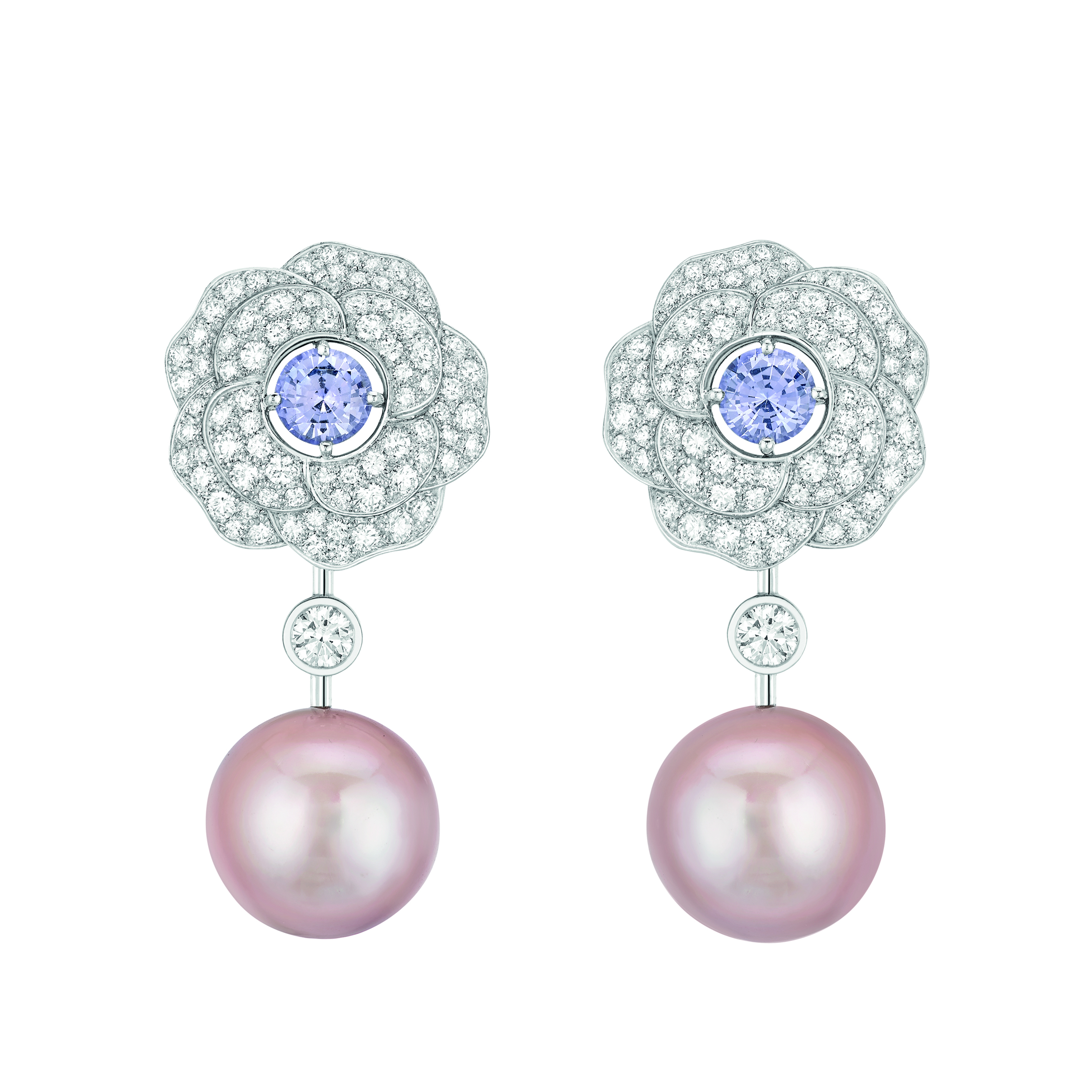 Boucles d’oreilles « Printemps de Camélia » en or blanc 18 carats serti de 176 diamants taille brillant pour un poids total de 1,6 carat, 2 saphirs violets taille brillant pour un poids total de 1,2 carat et 2 perles de culture d’eau douce de 12 mm de diamètre.