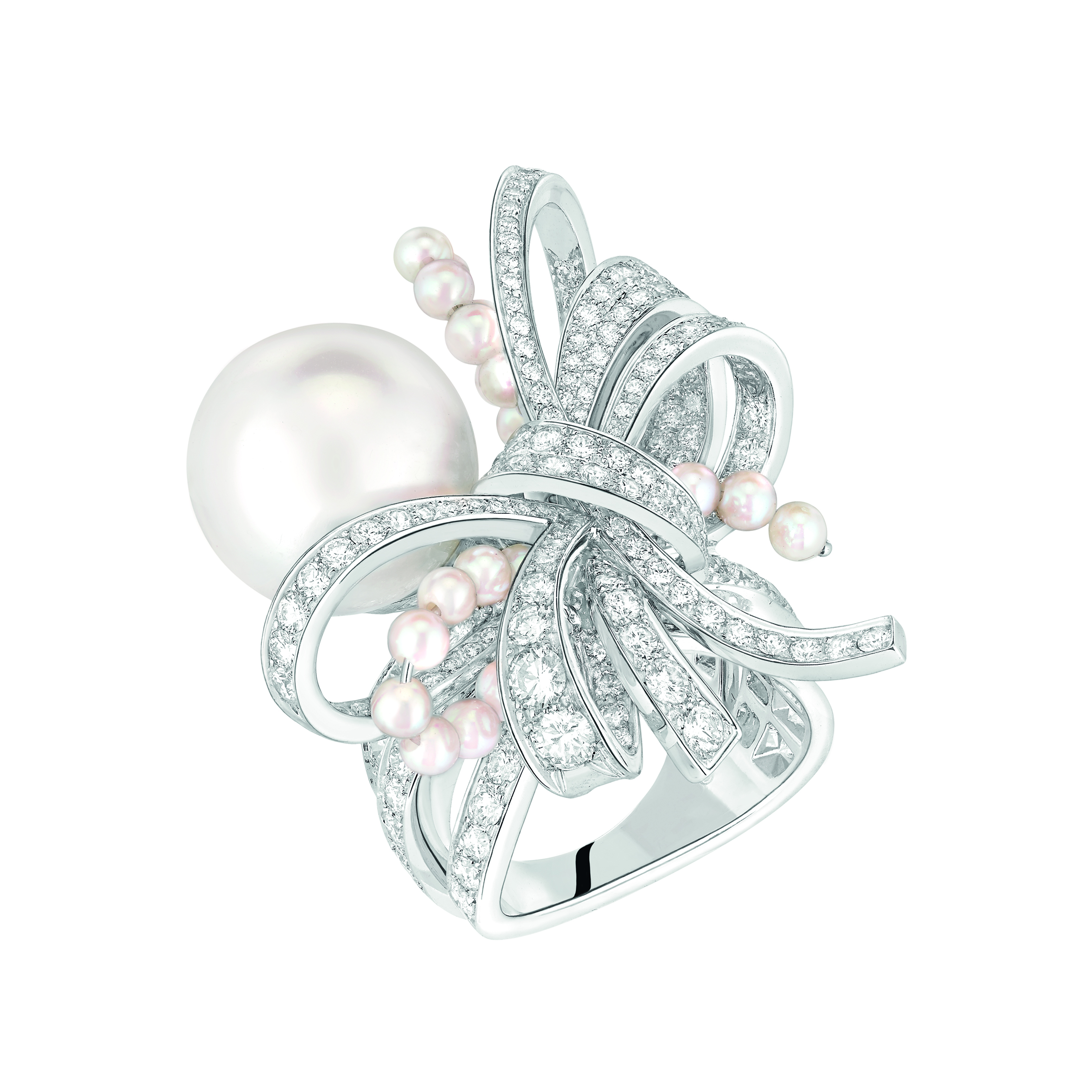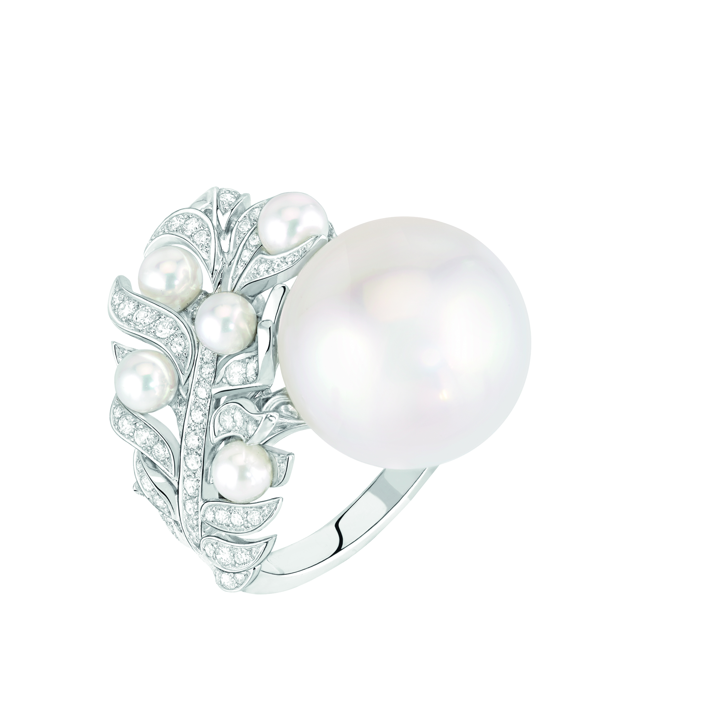 Bague « Plume Perlée de CHANEL » en or blanc 18 carats serti de 89 diamants taille brillant, 1 perle de culture des Mers du Sud de 14 mm de diamètre et 5 perles de culture du Japon.