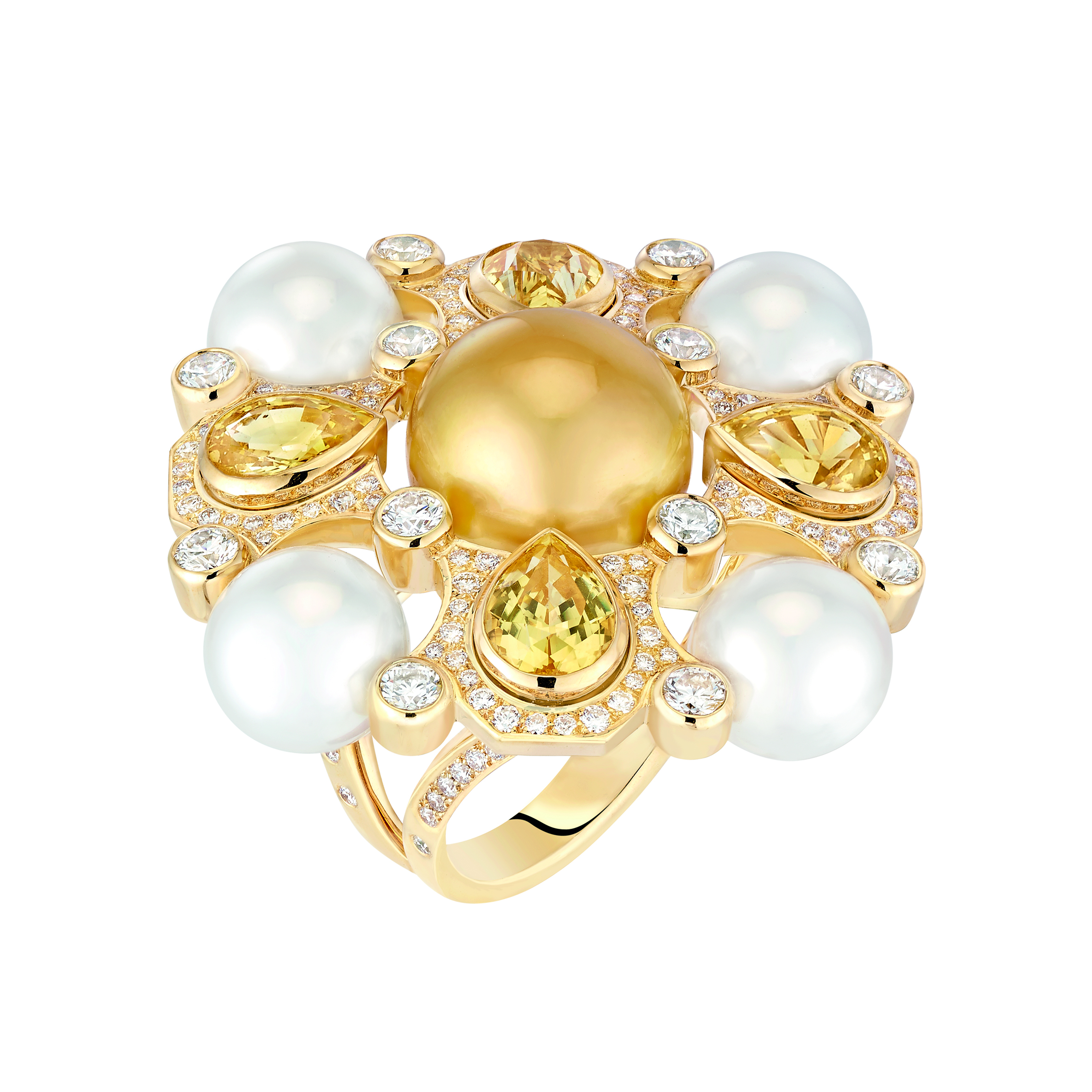 Bague « San Marco » grand modèle en or jaune 18 carats serti de 140 diamants taille brillant pour un poids total de 2 carats, 4 saphirs jaunes taille poire pour un poids total de 6,7 carats et 5 perles de culture des Mers du Sud dont une centrale de 13,5 mm de diamètre.