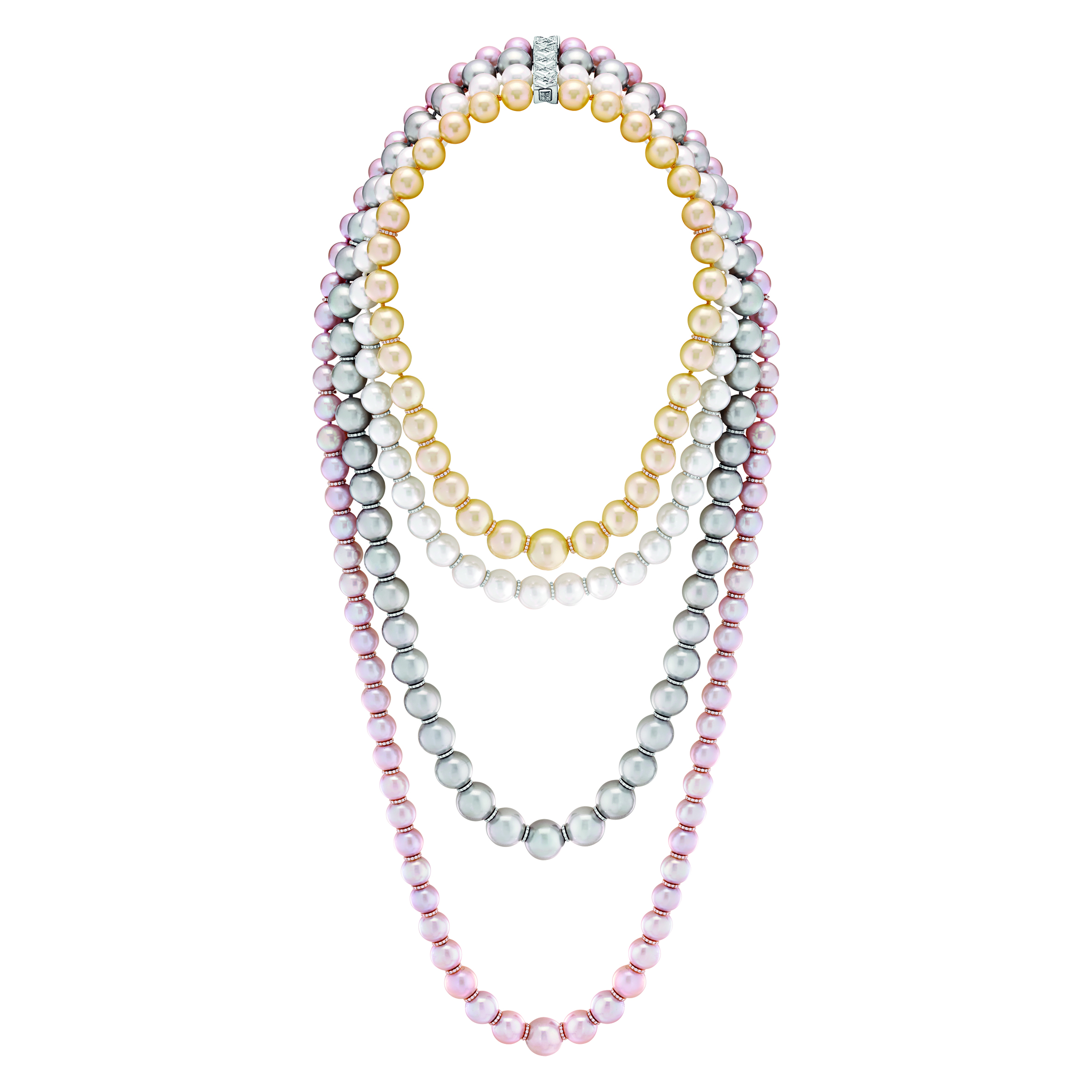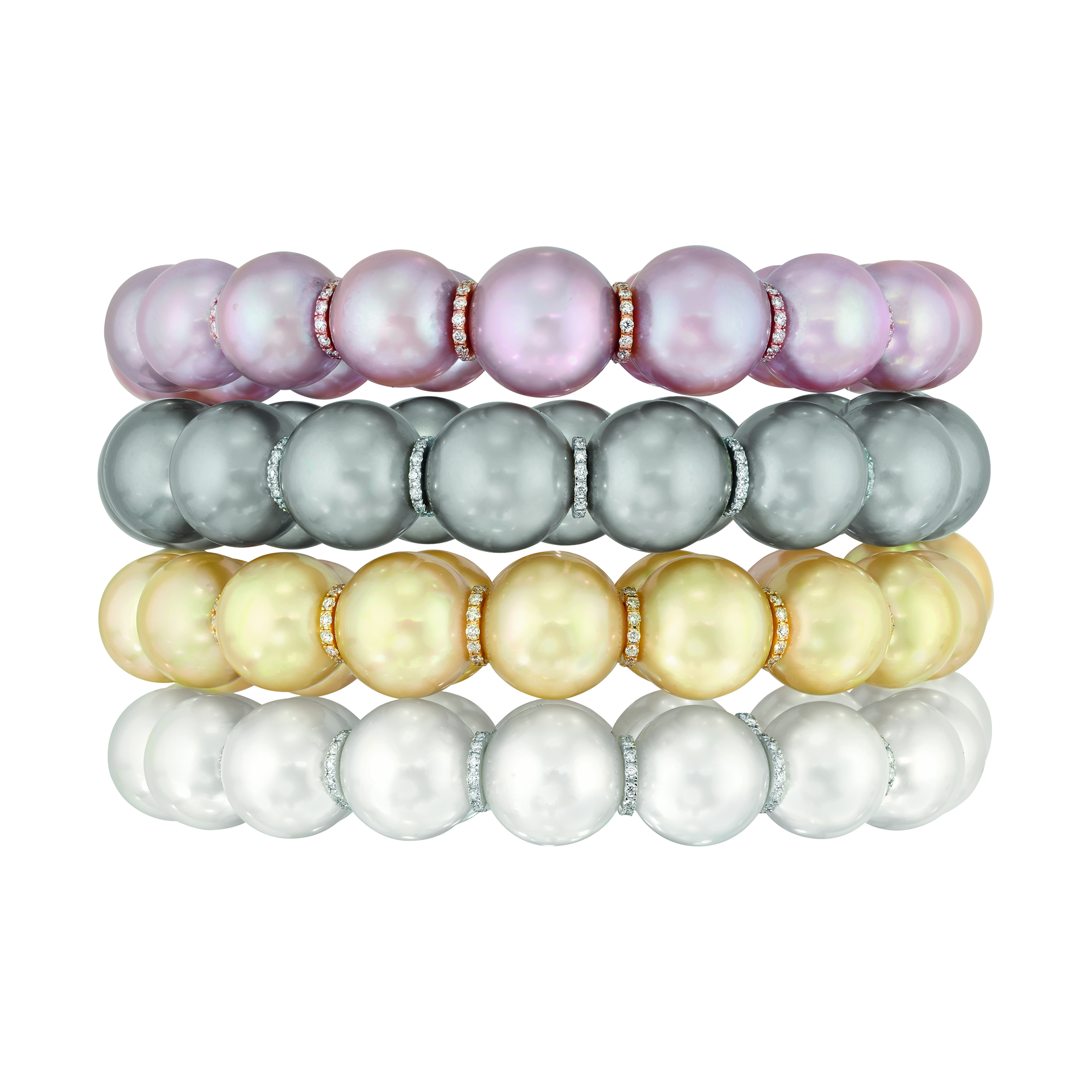 Bracelet « Perles Swing » en or blanc, jaune et rose 18 carats sertis de 884 diamants taille brillant pour un poids total de 4,8 carats, 32 perles de culture des Mers du Sud de 11 à 12,6 mm de diamètre, 15 perles de culture de Tahiti de 12 à 12,3 mm de diamètre et 17 perles de culture d’eau douce de 10 à 11,4 mm de diamètre.