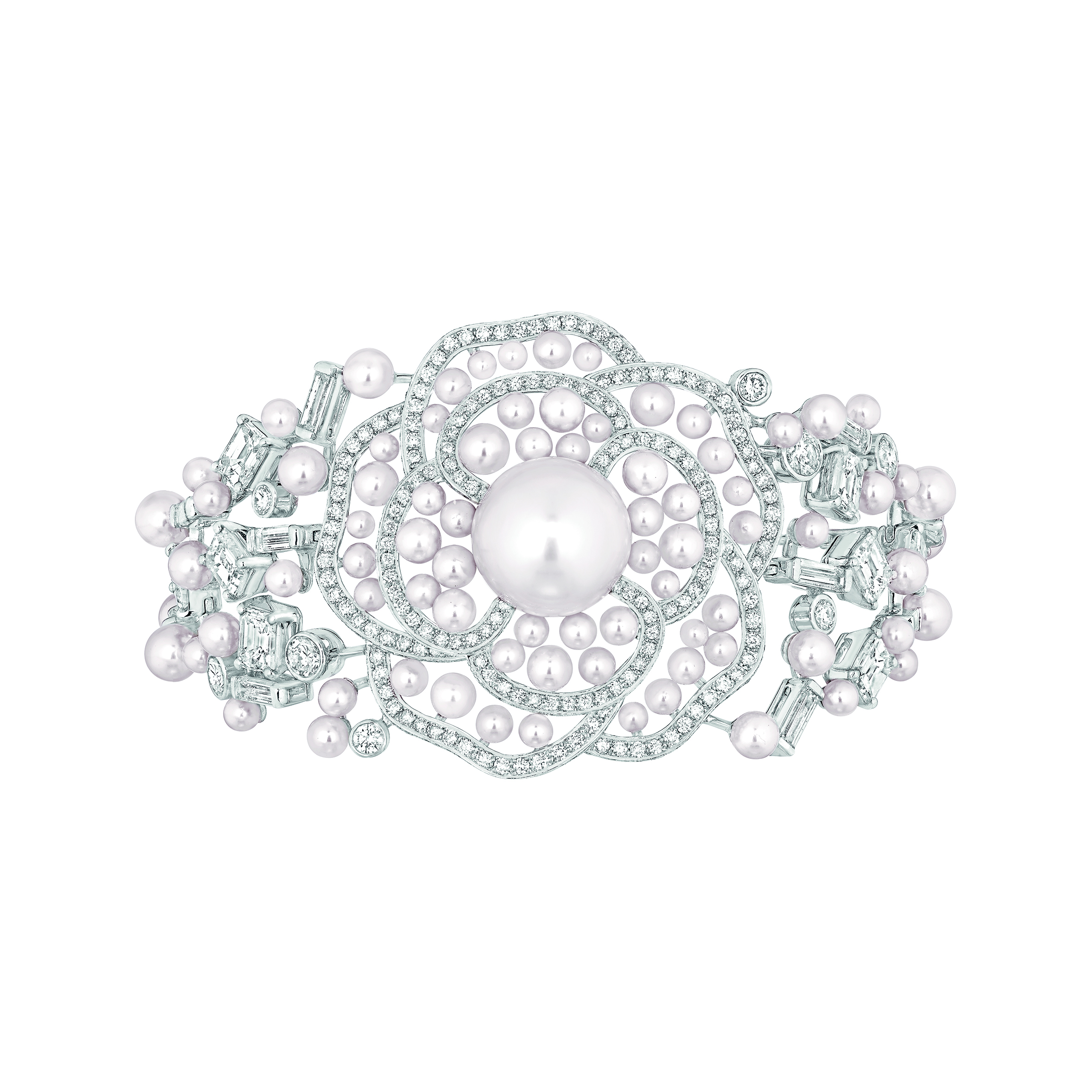 Bracelet « Pluie de Camélia » en or blanc 18 carats serti de 28 diamants taille éméraude pour un poids total de 6,9 carats, 563 diamants taille brillant pour un poids total de 3,6 carats, 1 perle de culture des Mers du Sud de 12,5 mm de diamètre et 104 perles de culture du Japon de 2 à 7,7 mm de diamètre.