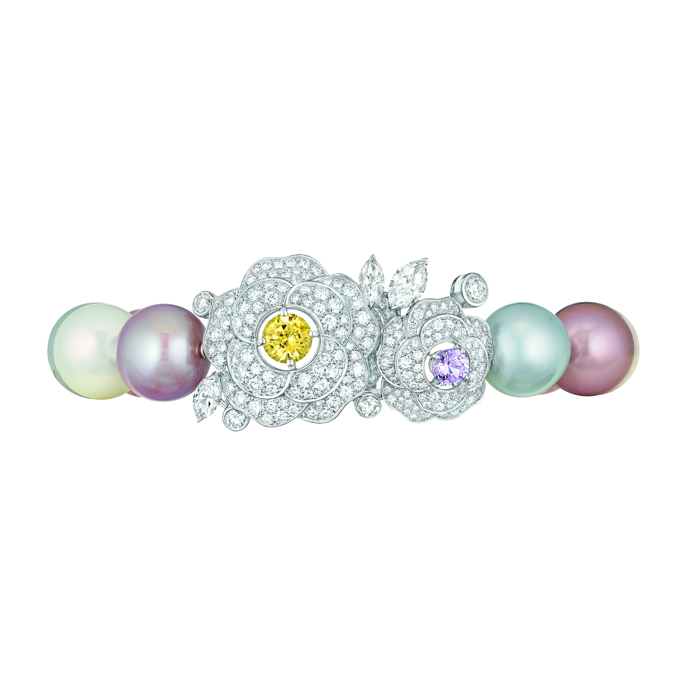 Bracelet « Printemps de Camélia » en or blanc 18 carats serti de 352 diamants taille brillant pour un poids total de 4,6 carats, 3 diamants taille marquise pour un poids total de 1,3 carat, 1 saphir jaune taille brillant de 1,3 carat, 1 saphir violet taille brillant et 10 perles de culture de Tahiti, des Mers du Sud et d’eau douce de 12,4 à 14 mm de diamètre.