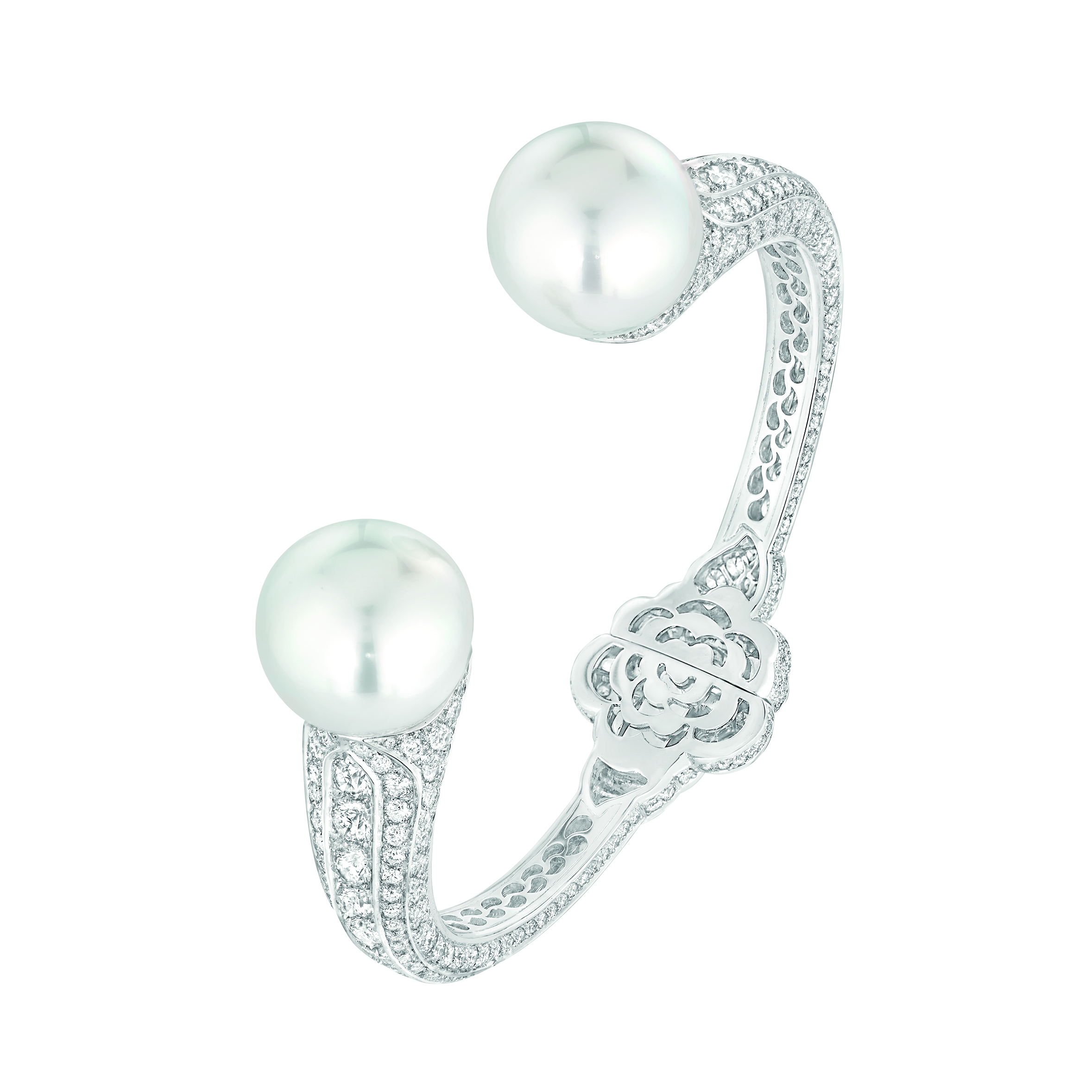 Bracelet « Camélia Secret » en or blanc 18 carats serti de 594 diamants taille brillant pour un poids total de 8 carats et 2 perles de culture des Mers du Sud de 15 mm de diamètre.
