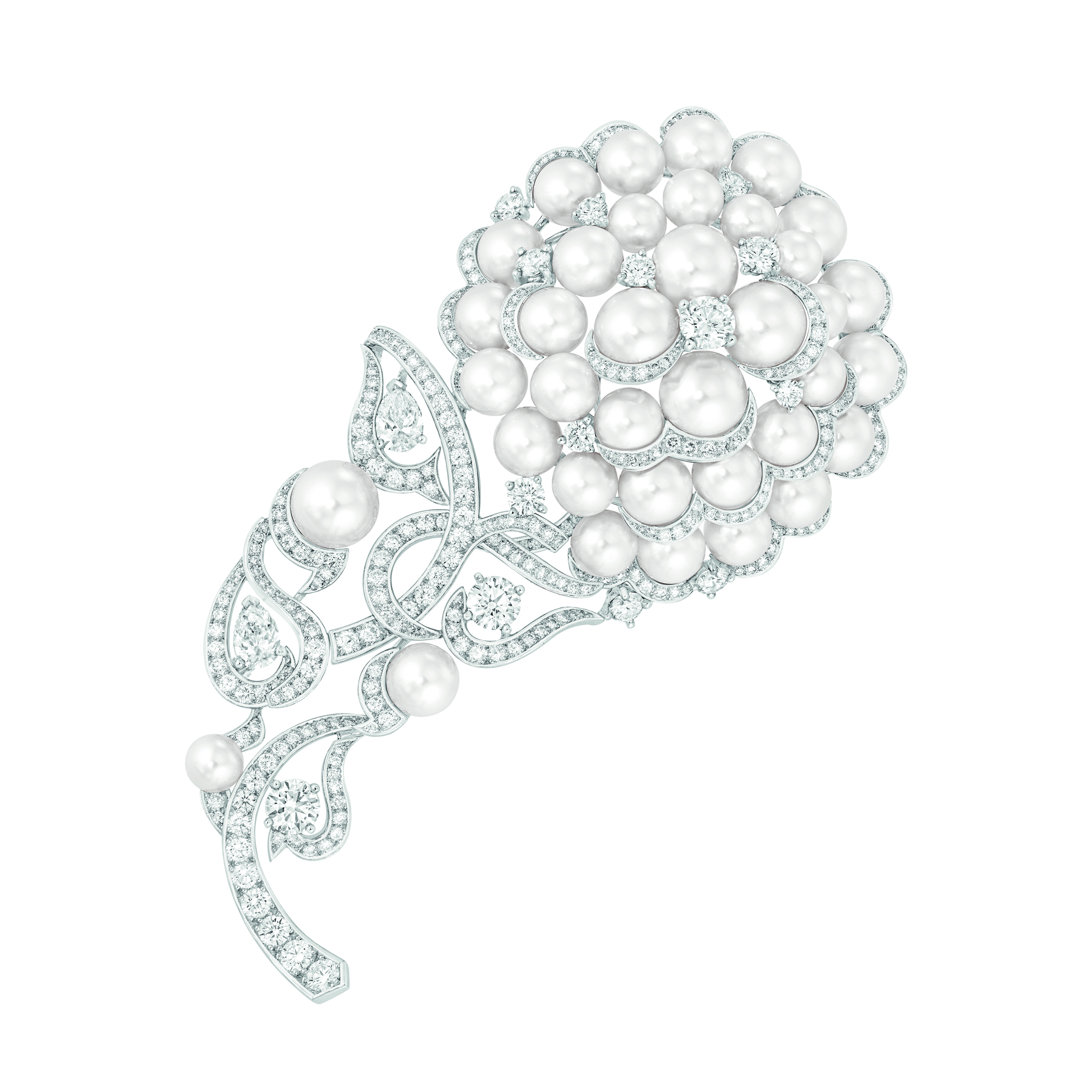Broche « Camélia Perlé » en or blanc 18 carats serti de 345 diamants taillle brillant pour un poids total de 9,9 carats, 2 diamants taille poire pour un poids total de 1,4 carat et 37 perles de culture du Japon de 6 à 9,5 mm de diamètre.