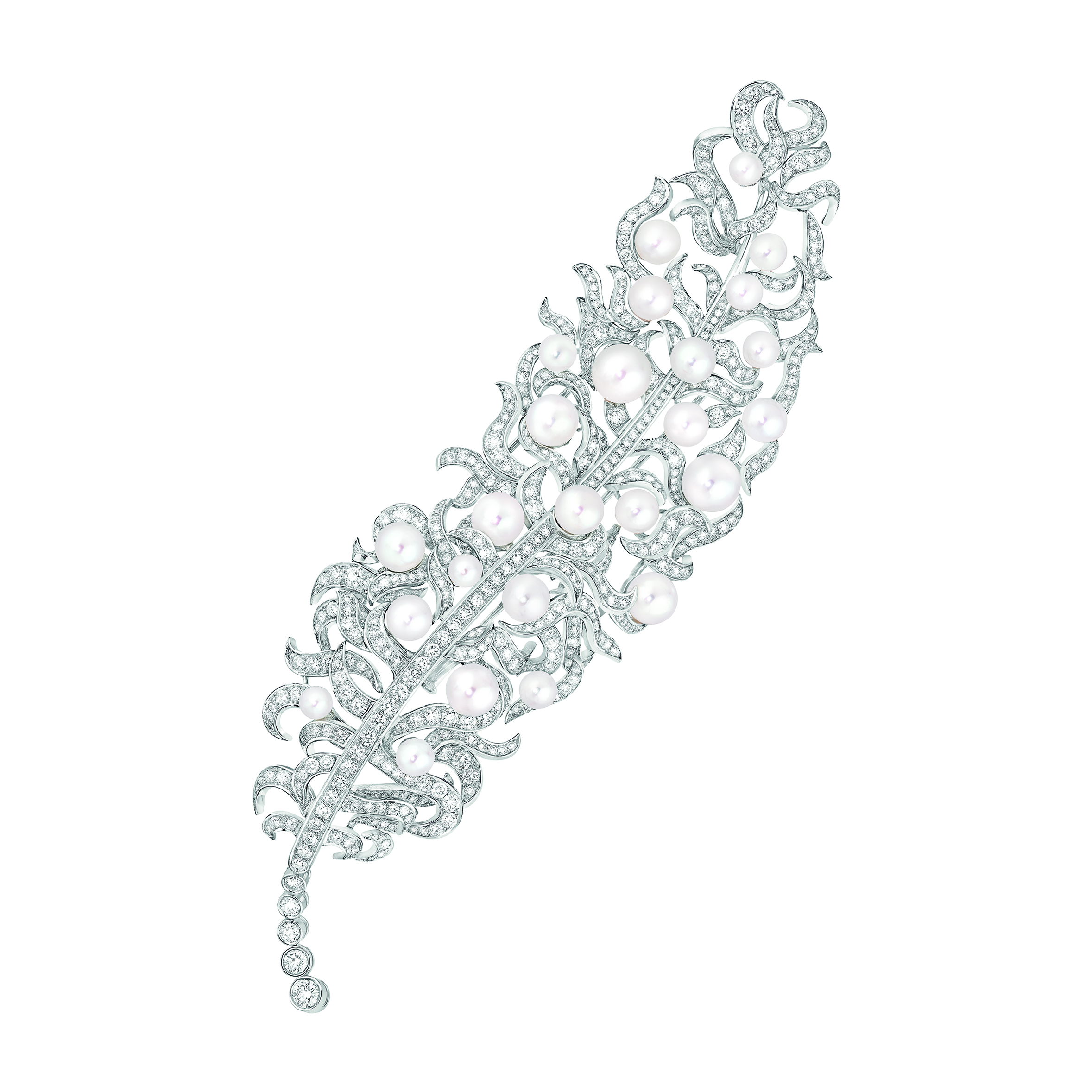 Broche « Plume Perlée de CHANEL» en or blanc 18 carats serti de 602 diamants taille brillant pour un poids total de 10,2 carats et 25 perles de culture du Japon de 4,4 à 7,9 mm de diamètre.