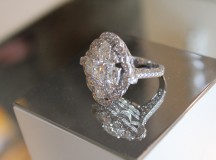 Bague « Perle Royale » en platine serti de 198 diamants taille brillant pour un poids total de 3 carats, 22 diamants taille baguette pour un poids total de 3,5 carats et 1 perle de culture des Mers du Sud de 15 mm de diamètre.