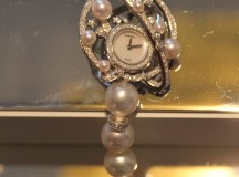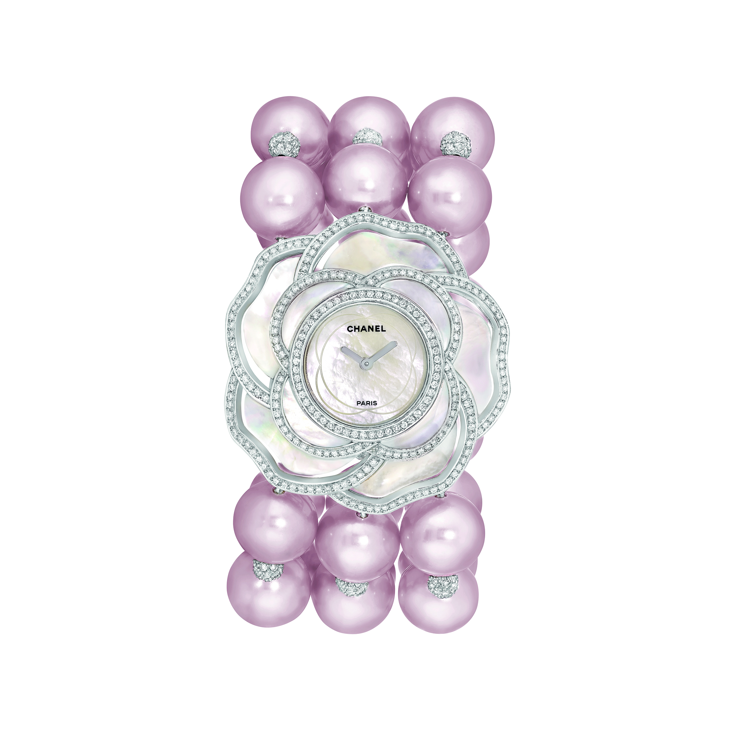 Montre « Camélia Nacré » en or blanc 18 carats serti de 563 diamants taille brillant pour un poids total de 2,9 carats, 34 perles de culture d’eau douce de 10 à 10,7 mm de diamètre et nacre sculptée.