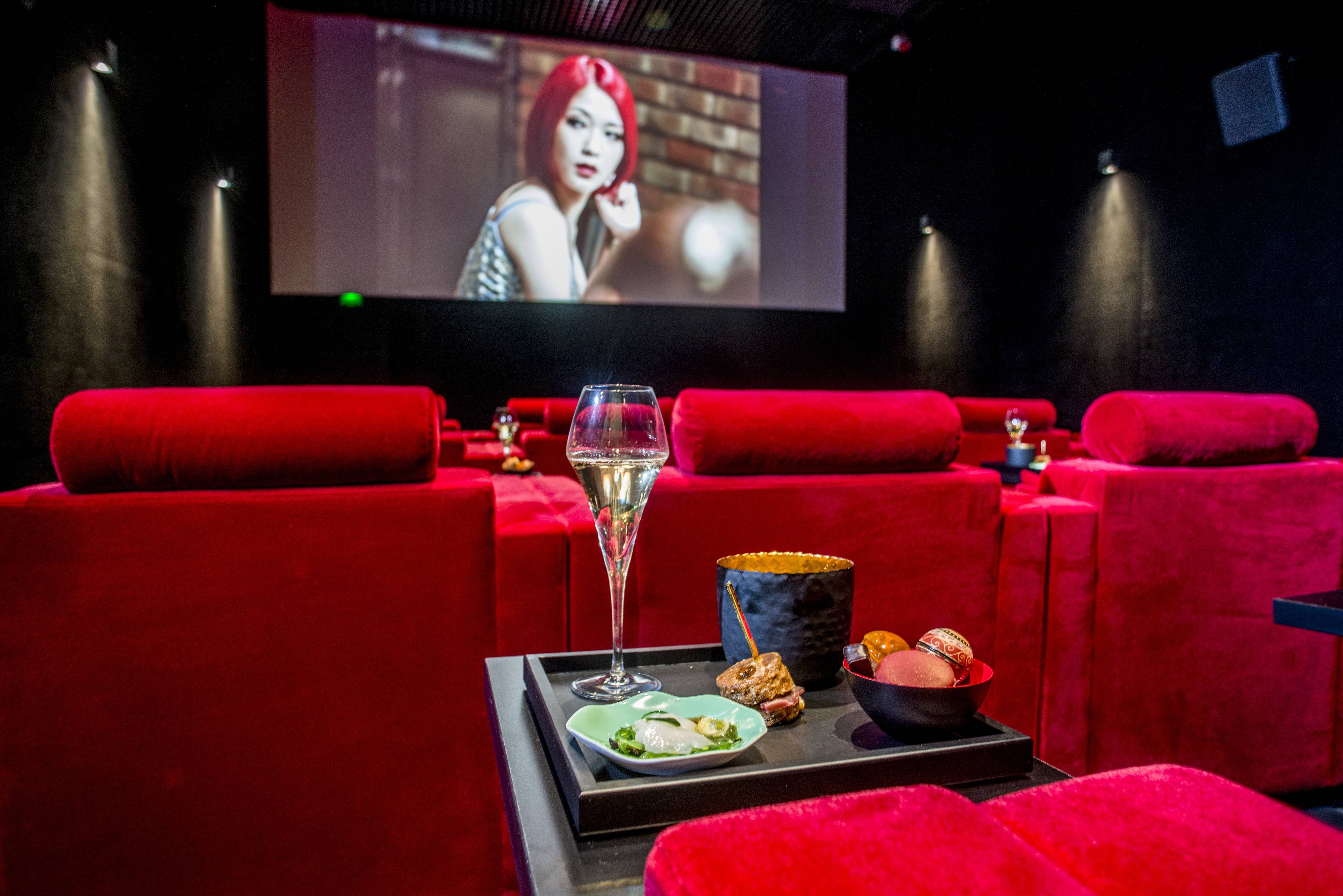 Mademoiselle Cinéma offre pour sa part 25 larges et confortables fauteuils en velours rouge dotés d’un repose pieds et d’un repose tête ainsi que d’une petite table où déposer son verre et déguster le dîner. Au fond de la salle, un bar tamisé accueille les invités.