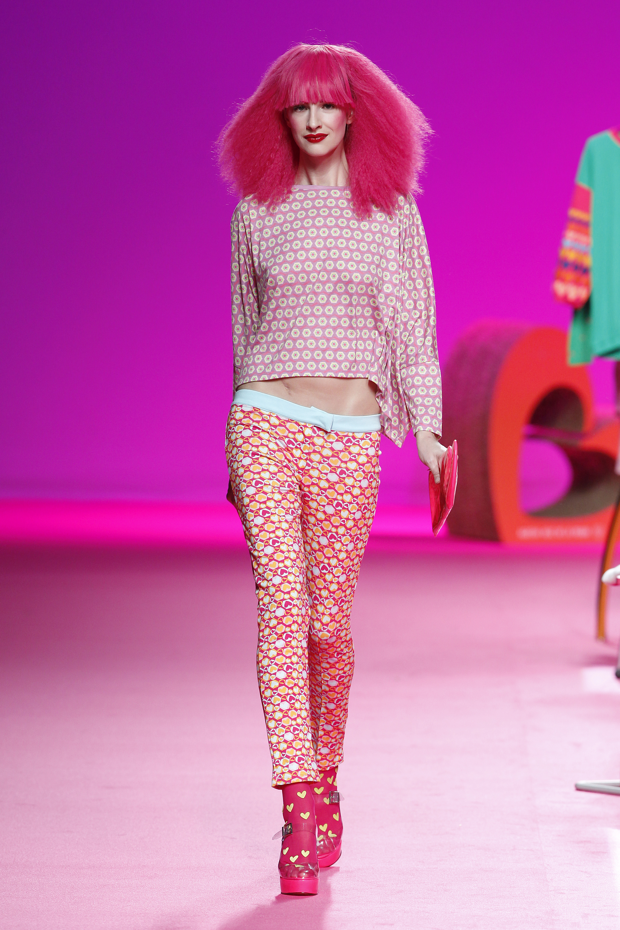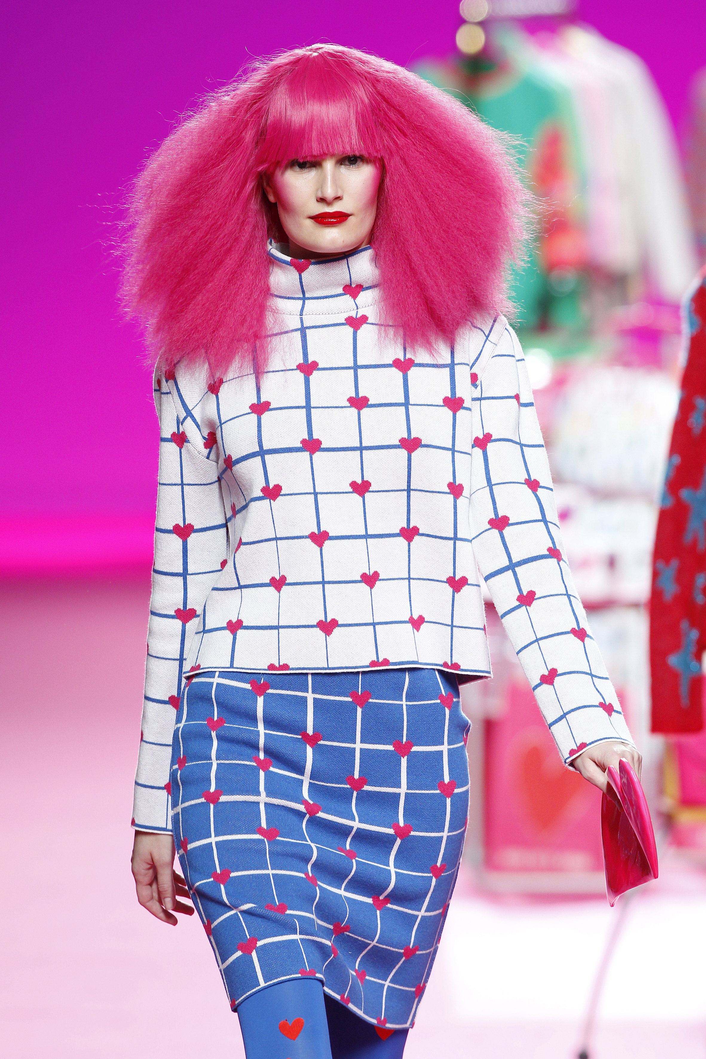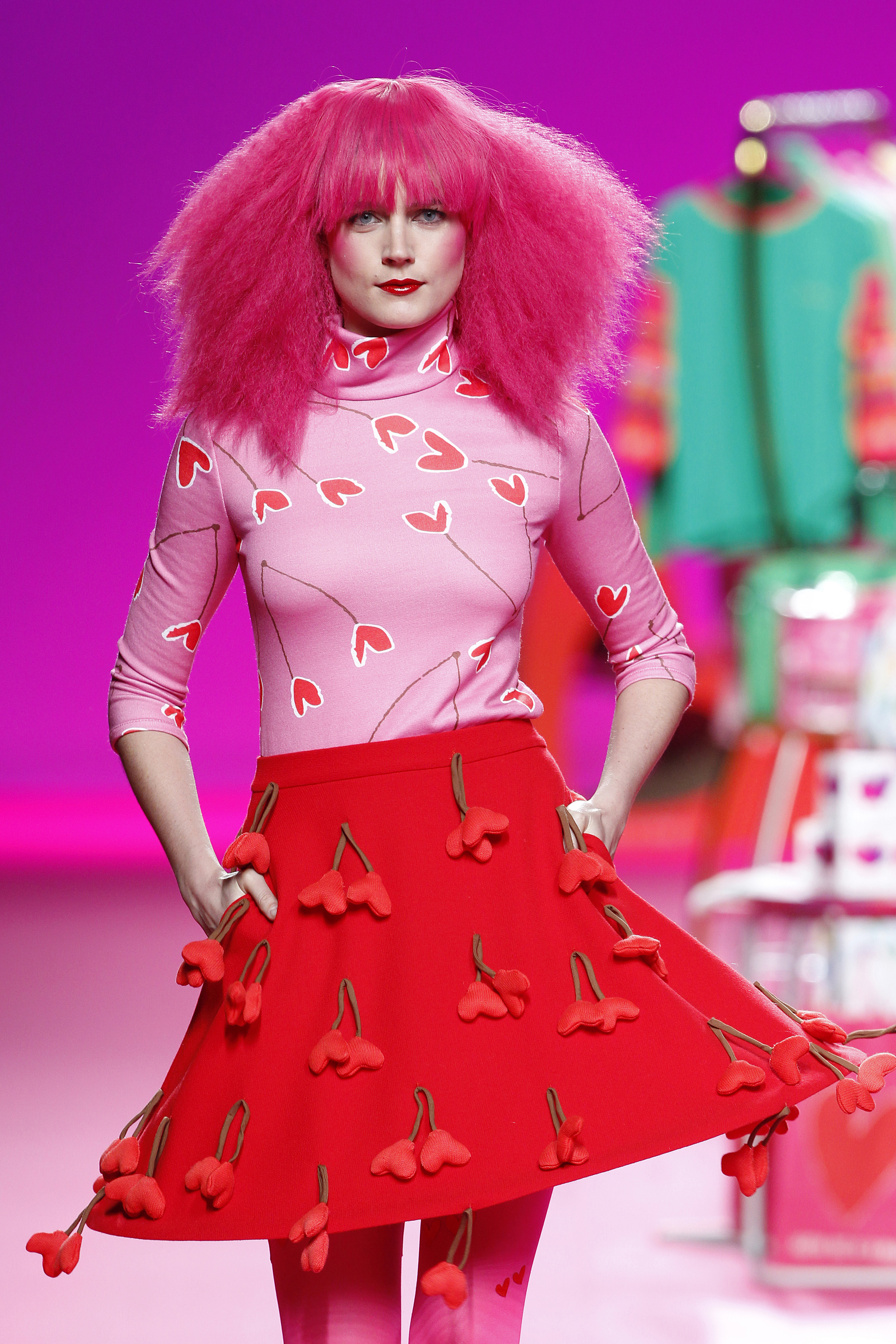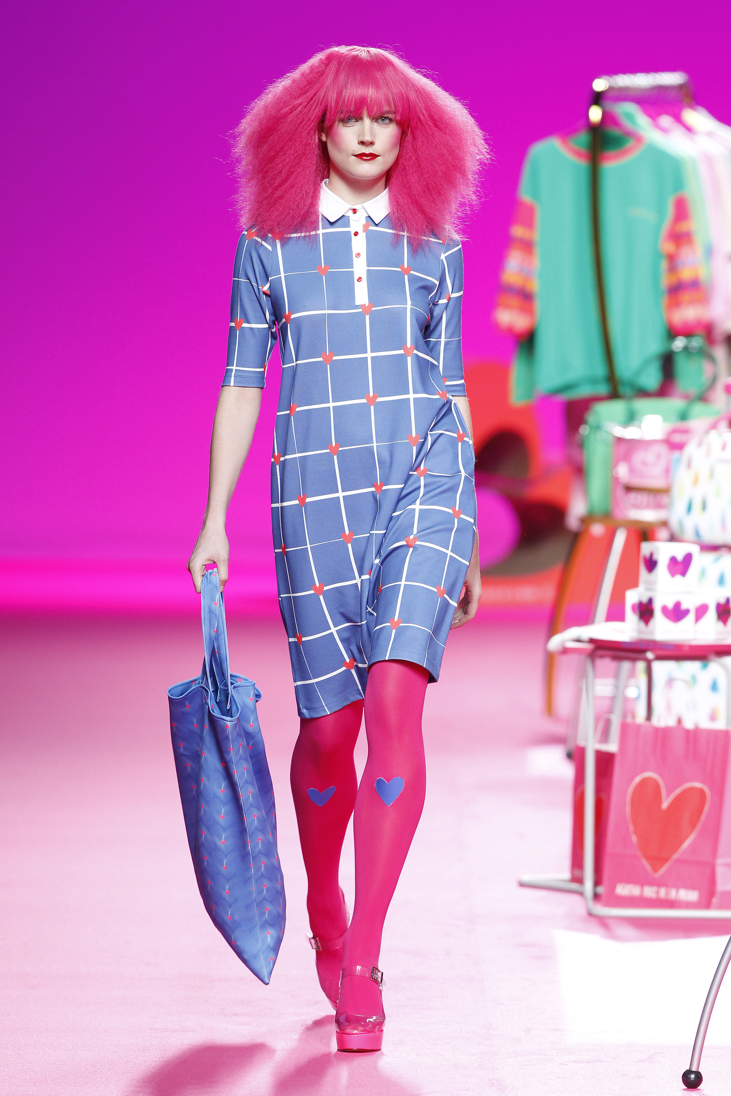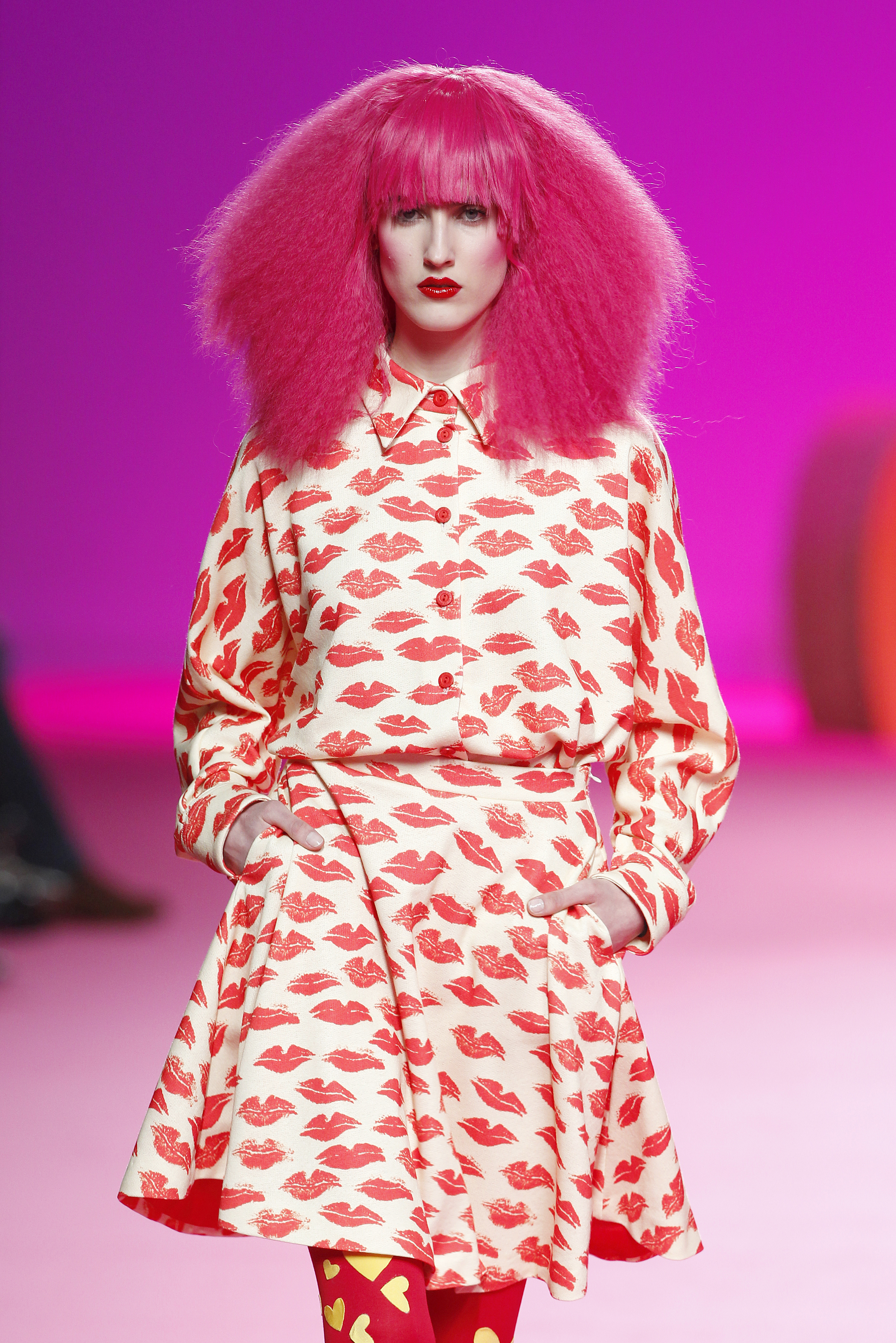 Le fuchsia, couleur fétiche de la maison, reste le fil conducteur cette saison à travers les vêtements ou les accessoires amusants. Ainsi, les chaussures transparents, qui prennent la couleur des bas, mais contrastent ou se mélangent avec les cales en cuir verni rose qui les servent de base. Les sacs avec des fenêtres transparentes ou les perruques drôles, faites main par Free Style pour Agatha Ruiz de la Prada.