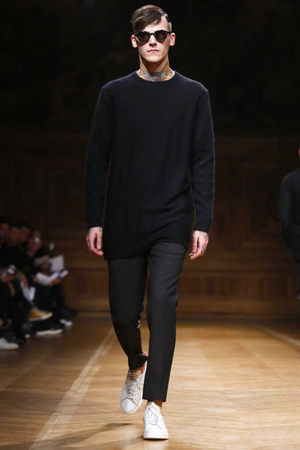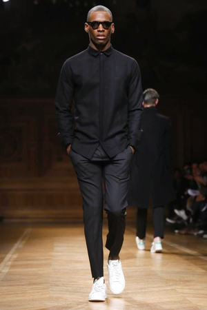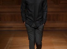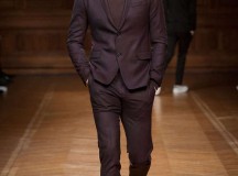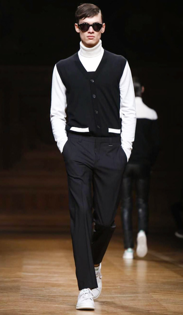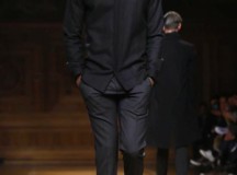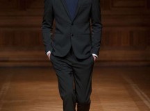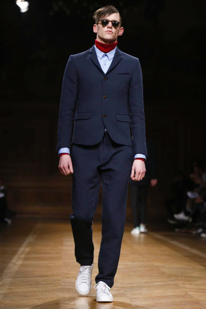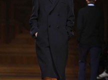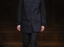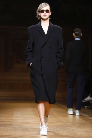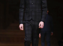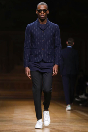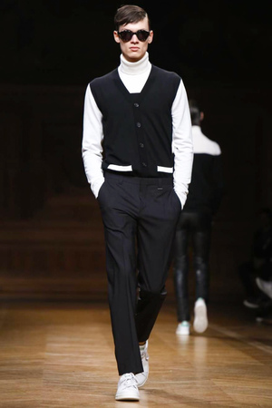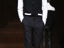 Les cols de chemises se superposent à ceux des cols roulés ou encore l’écharpe apparaît sous forme de croix, apportant à l’allure des détails visuellement impactants. Les couleurs principales sont le bleu, le noir et le blanc, ajoutant quelques gouttes de rouge pour affirmer la silhouette masculine.