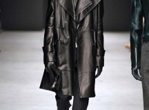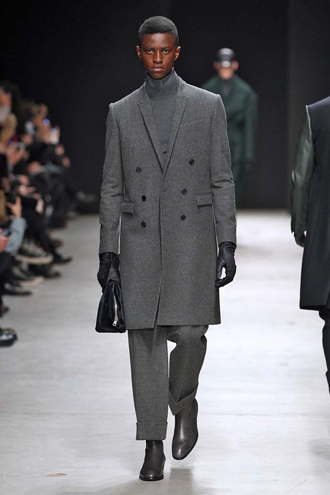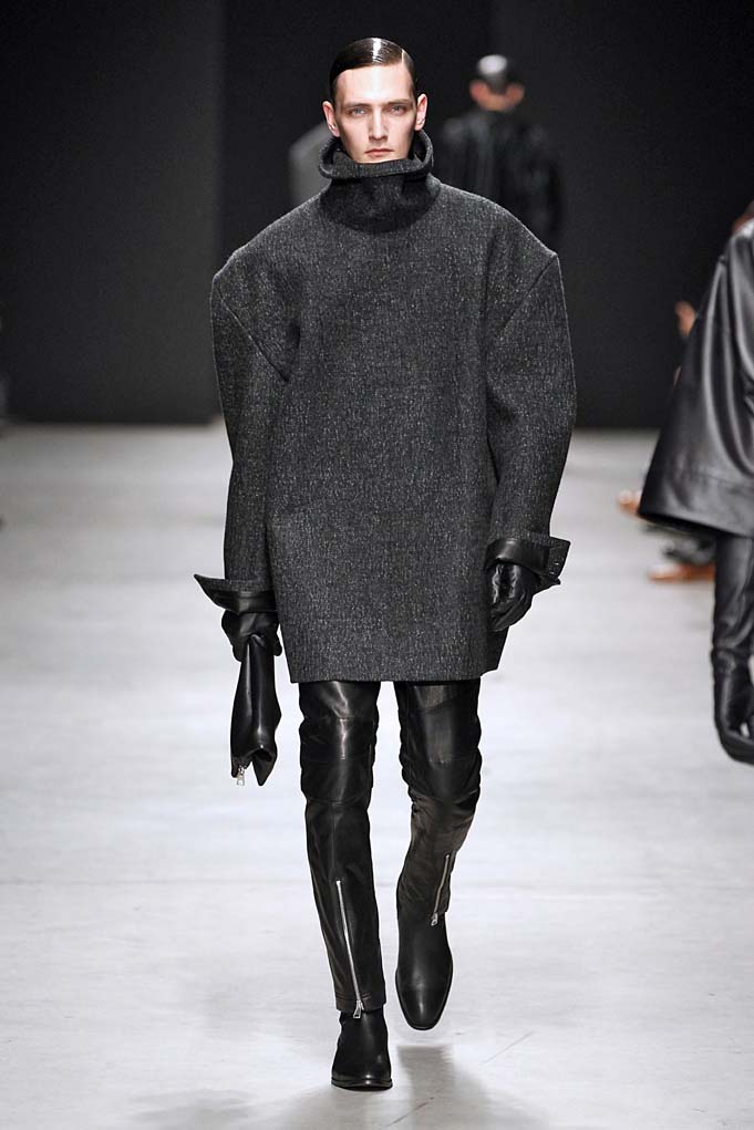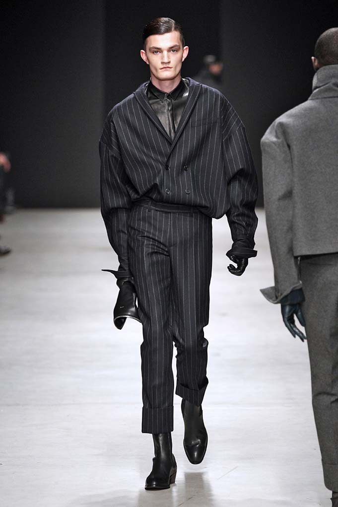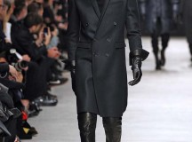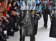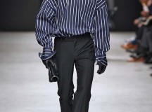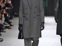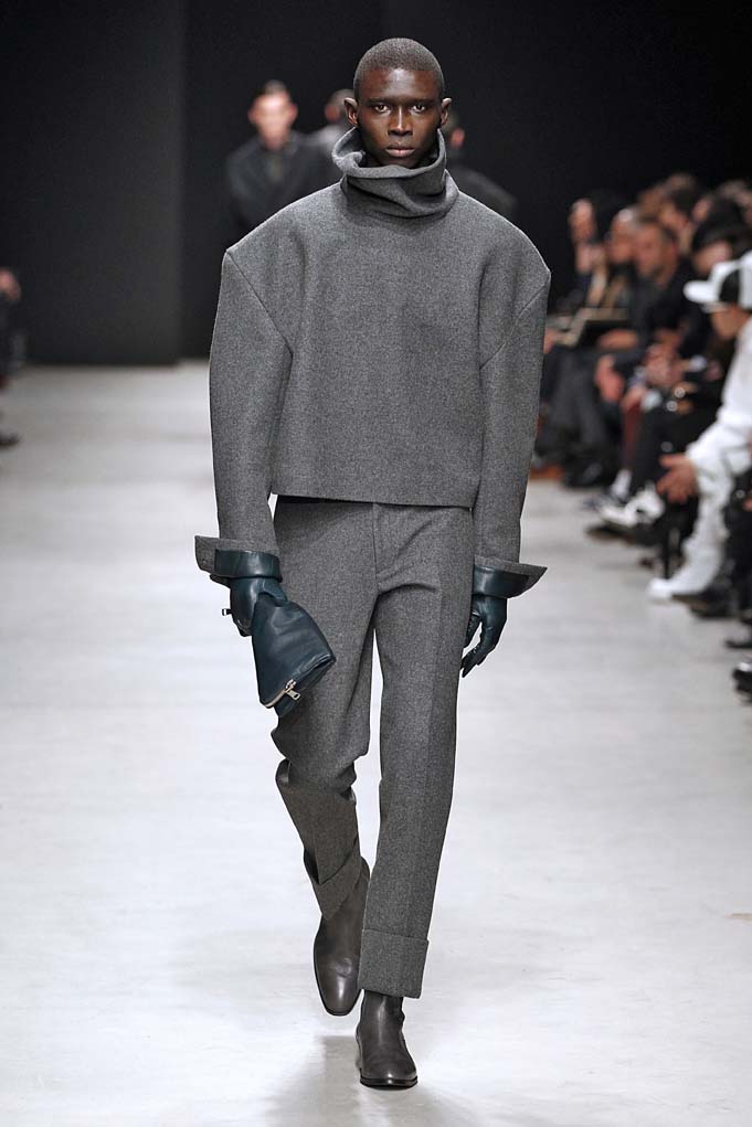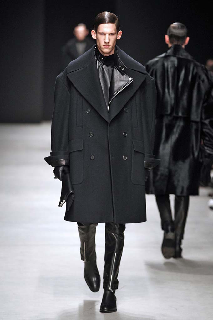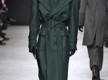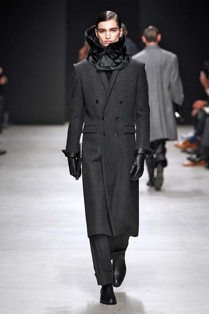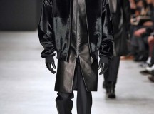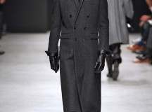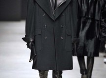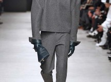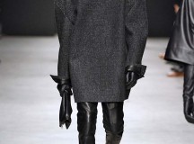 Cheveux laqués, teint naturel, les mannequins défilent et s’enchaînent dans un tourbillon de superpositions rigoureuses. Les épaules sont structurées, donnant un ton masculin affirmé. Les couleurs sont hivernales, unies ou bicolores : noir intense et gris cendré, ponctués aussi de bleu et de vert.