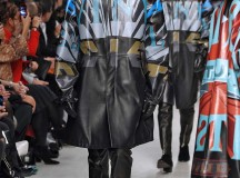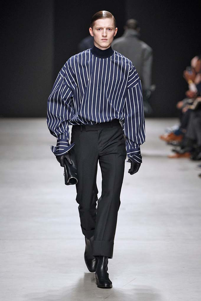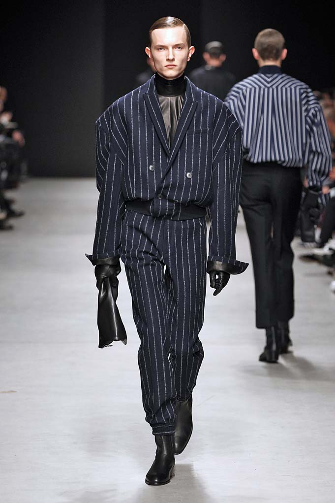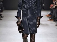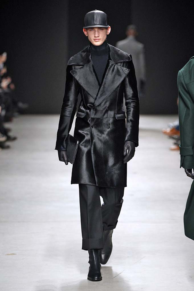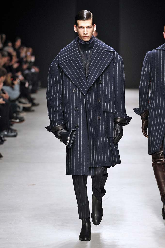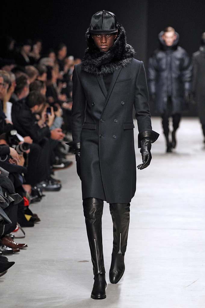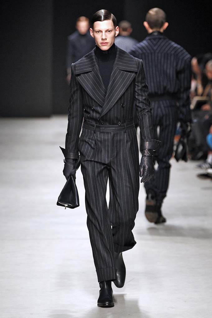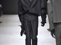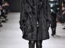 Cheveux laqués, teint naturel, les mannequins défilent et s’enchaînent dans un tourbillon de superpositions rigoureuses. Les épaules sont structurées, donnant un ton masculin affirmé. Les couleurs sont hivernales, unies ou bicolores : noir intense et gris cendré, ponctués aussi de bleu et de vert.