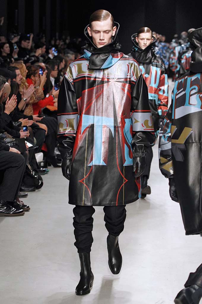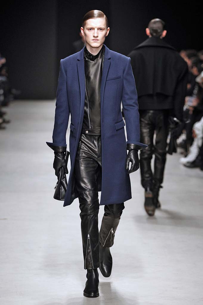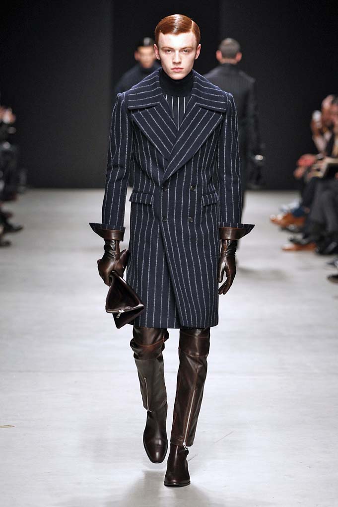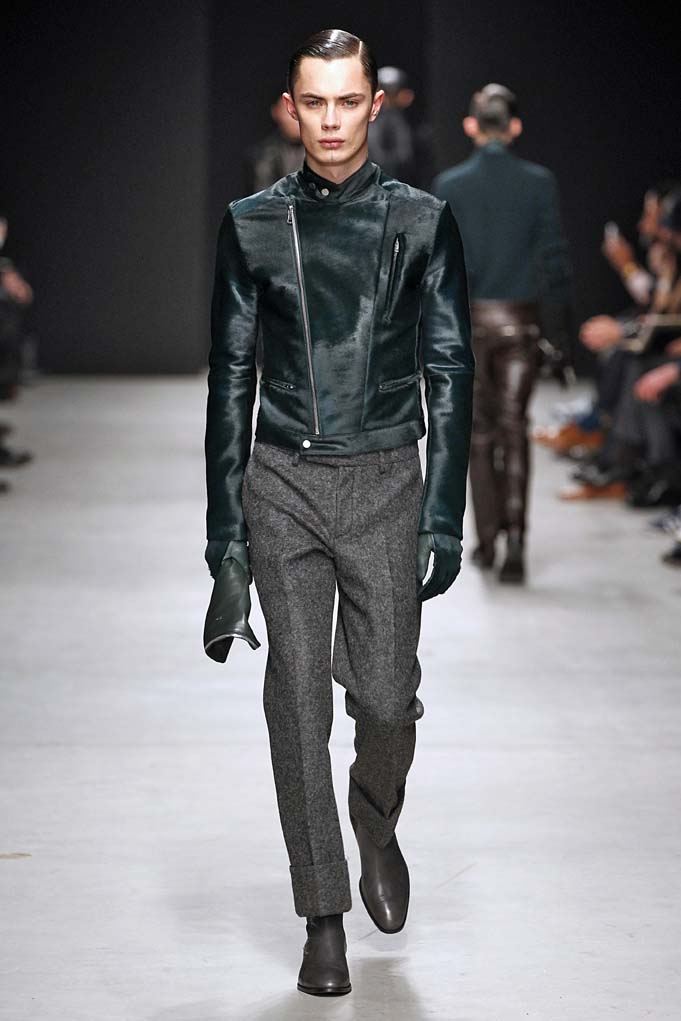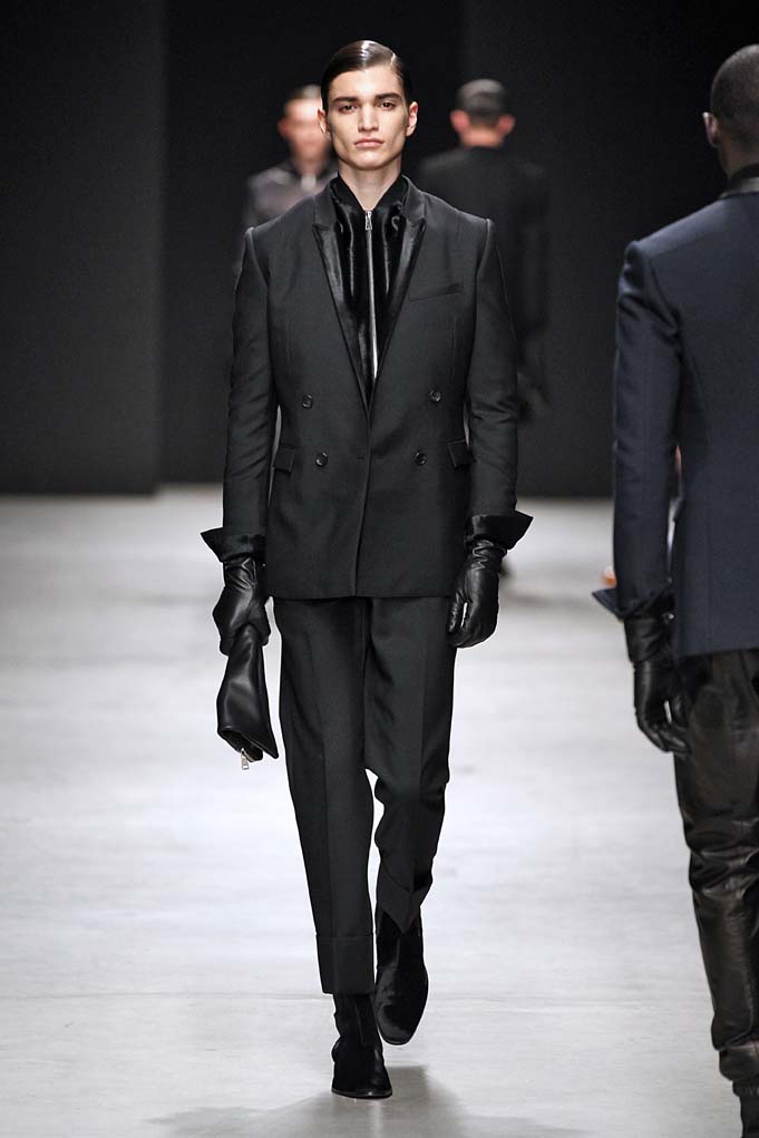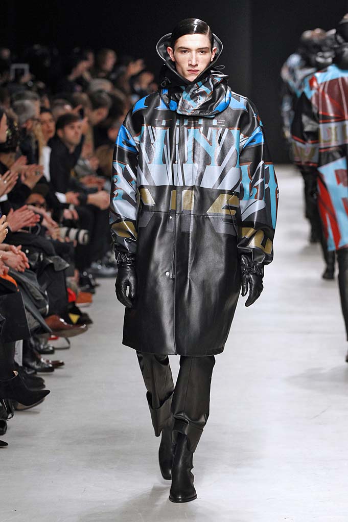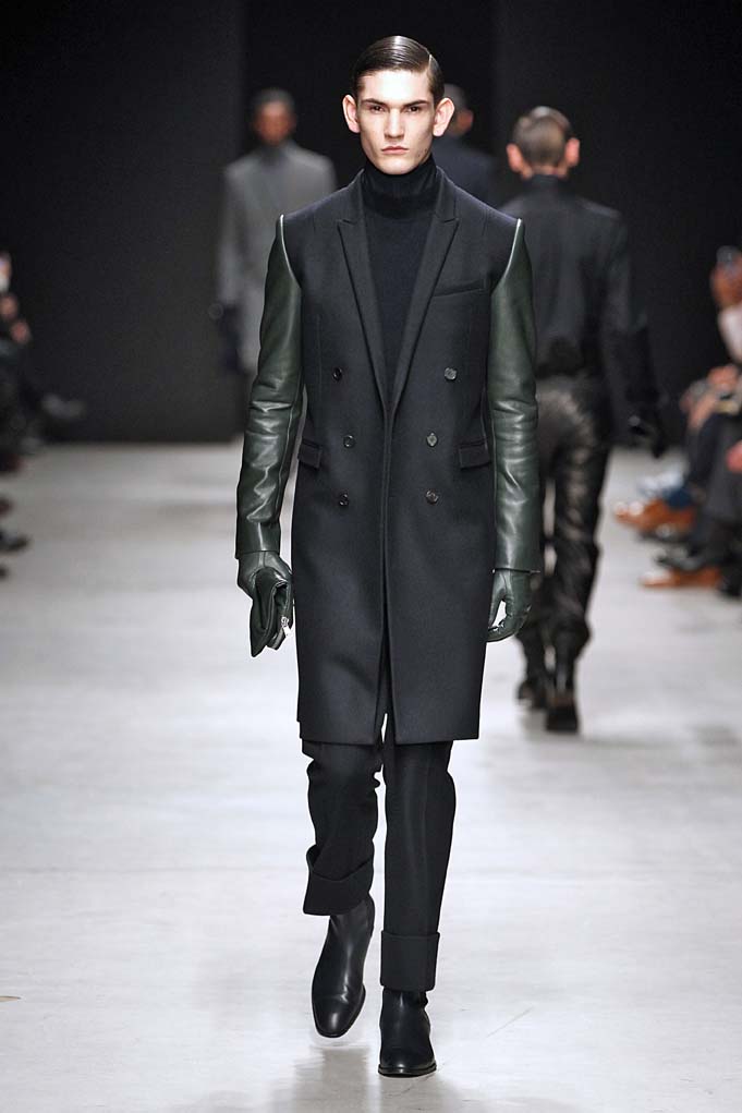 Cheveux laqués, teint naturel, les mannequins défilent et s’enchaînent dans un tourbillon de superpositions rigoureuses. Les épaules sont structurées, donnant un ton masculin affirmé. Les couleurs sont hivernales, unies ou bicolores : noir intense et gris cendré, ponctués aussi de bleu et de vert.
