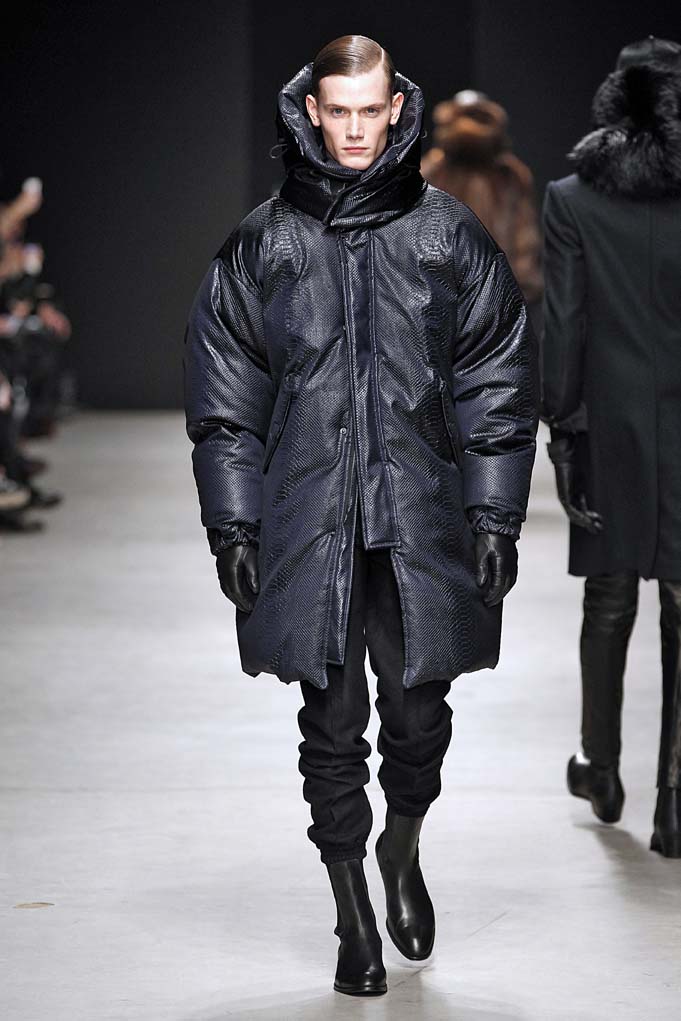 Quelques pièces over, tels que les manteaux en fourrure ou encore les doudounes nous confirment le souhait de Jung Wookjun d’apporter le choix, tout en restant identitaire à l’homme Juun J.