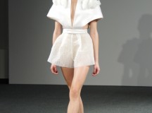 Clarisse Hieraix nous présentait pour sa collection Couture Printemps été 2014 un univers inspiré par la religion où les robes défiaient la gravité en jaune, blanc, ou noir. Le romantisme était au rendez vous.
