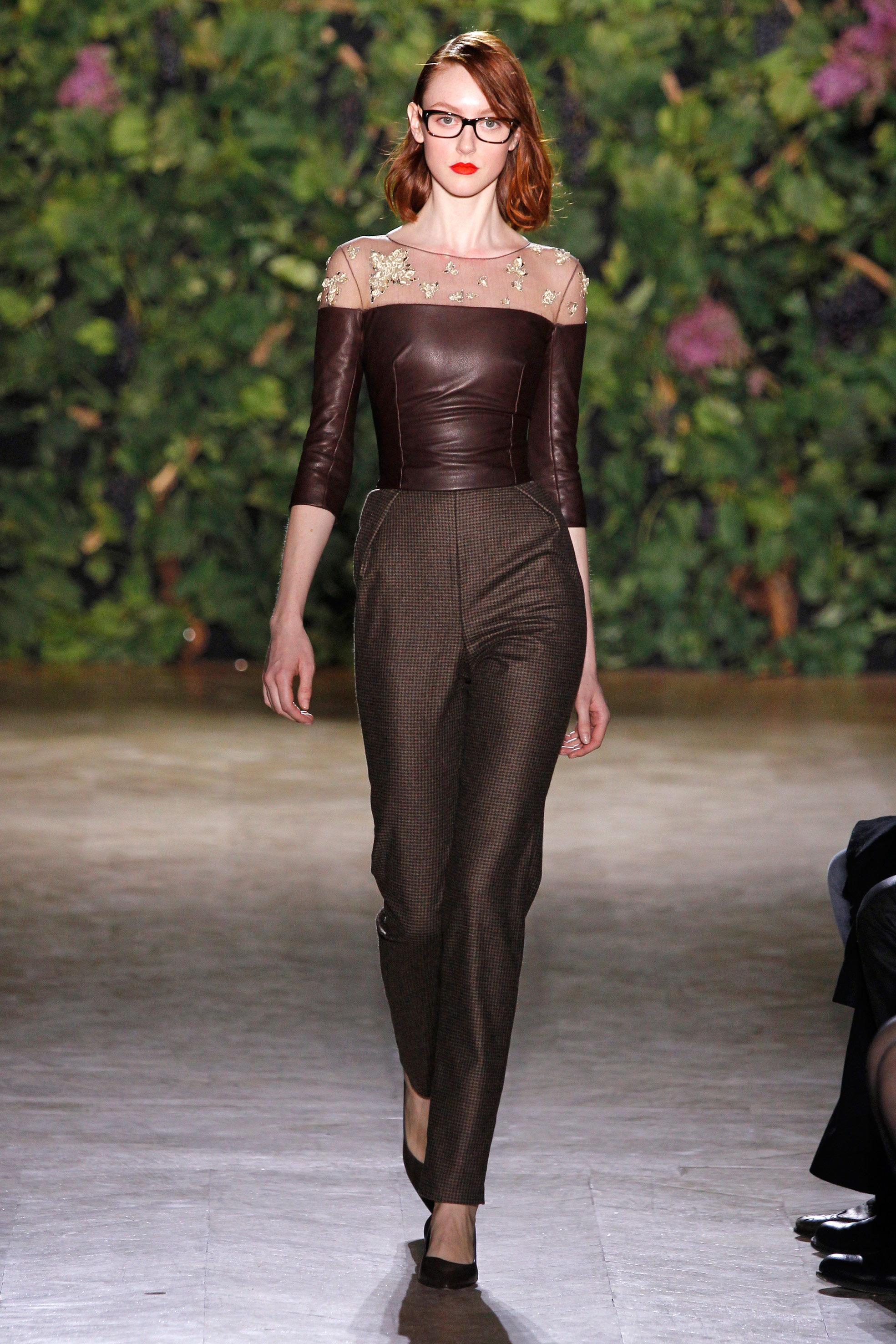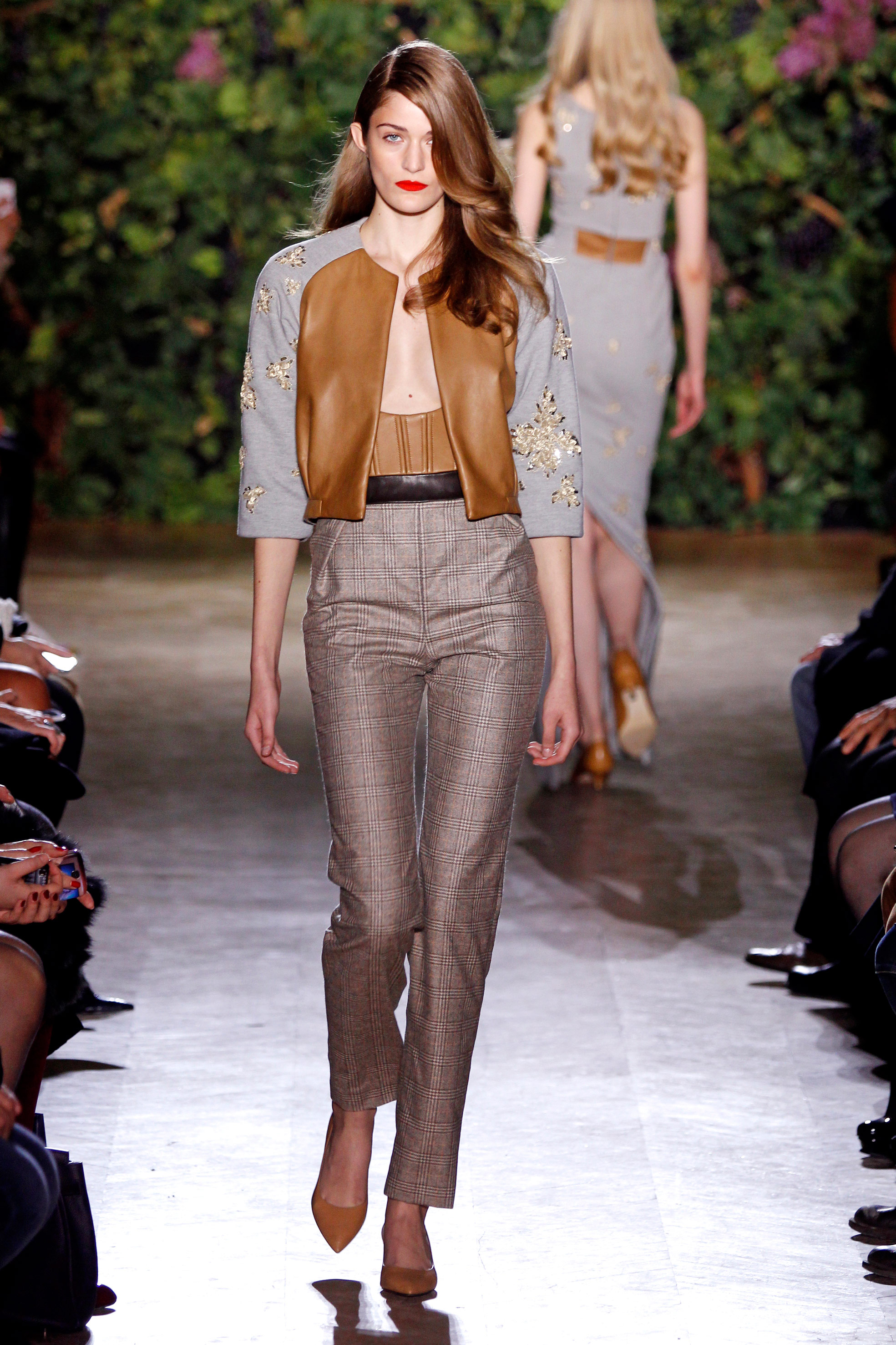 Perchée sur ses kitten-heels, la fille de Didit Hediprasetyo se coule dans ce mood sensible et sensuel plutôt qu’ouvertement sexy. Liane élancée dans un jumpsuit monté au chic, composé d’un plastron d’agneau et d’un pantalon tour à tour en Prince-de-Galles, en pied-de-coq en Songket (ce brocart traditionnel indonésien tissé main), elle s’enveloppe d’un bomber en molleton et cuir brodé de feuilles et de sarments. Le luxe s’immisce jusque dans l’inspiration sportive, le savoir-faire couture ne cède en rien au quotidien, les étoffes masculines donnent du chien au pantalon fitté prenant la taille et arrondissant à peine la