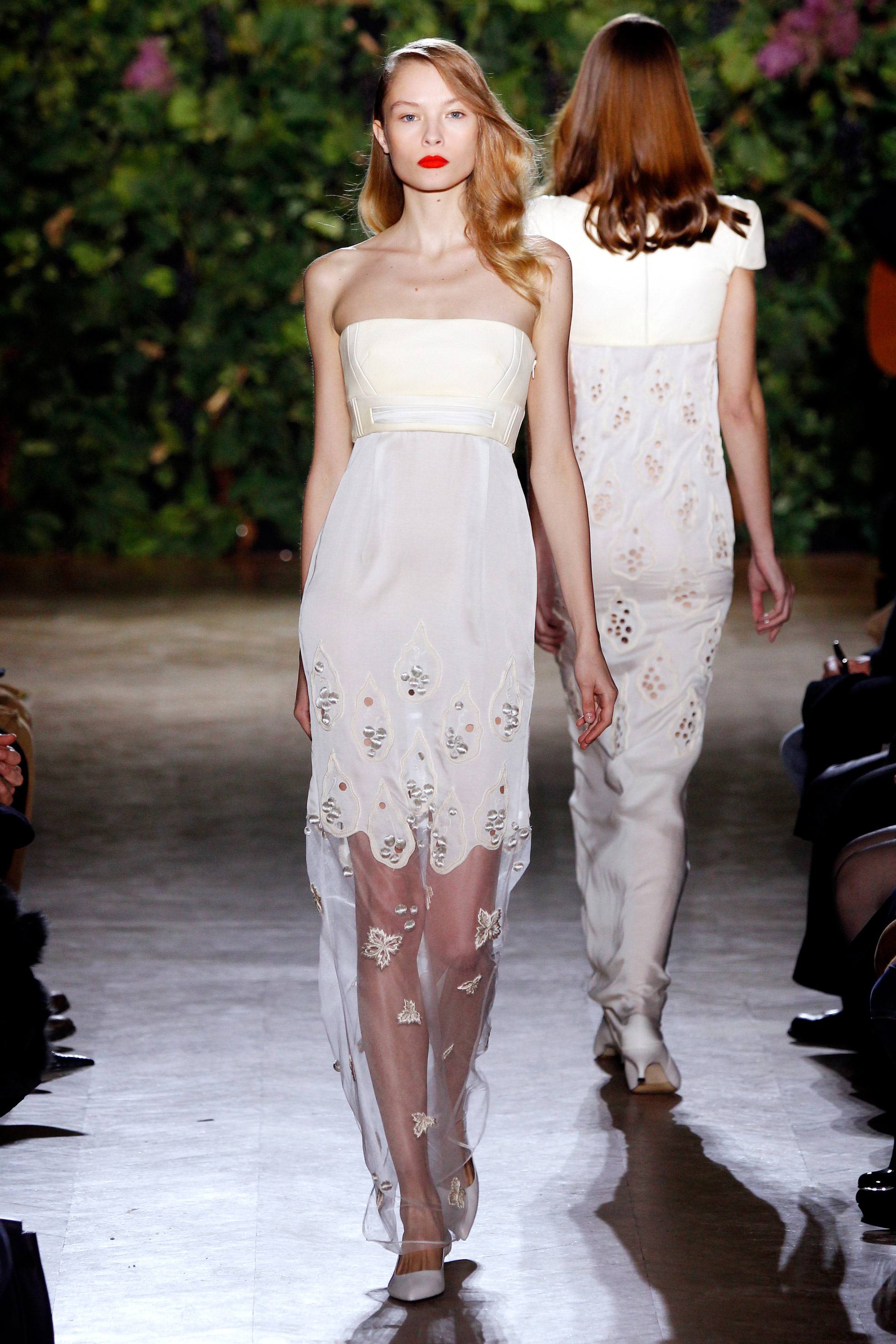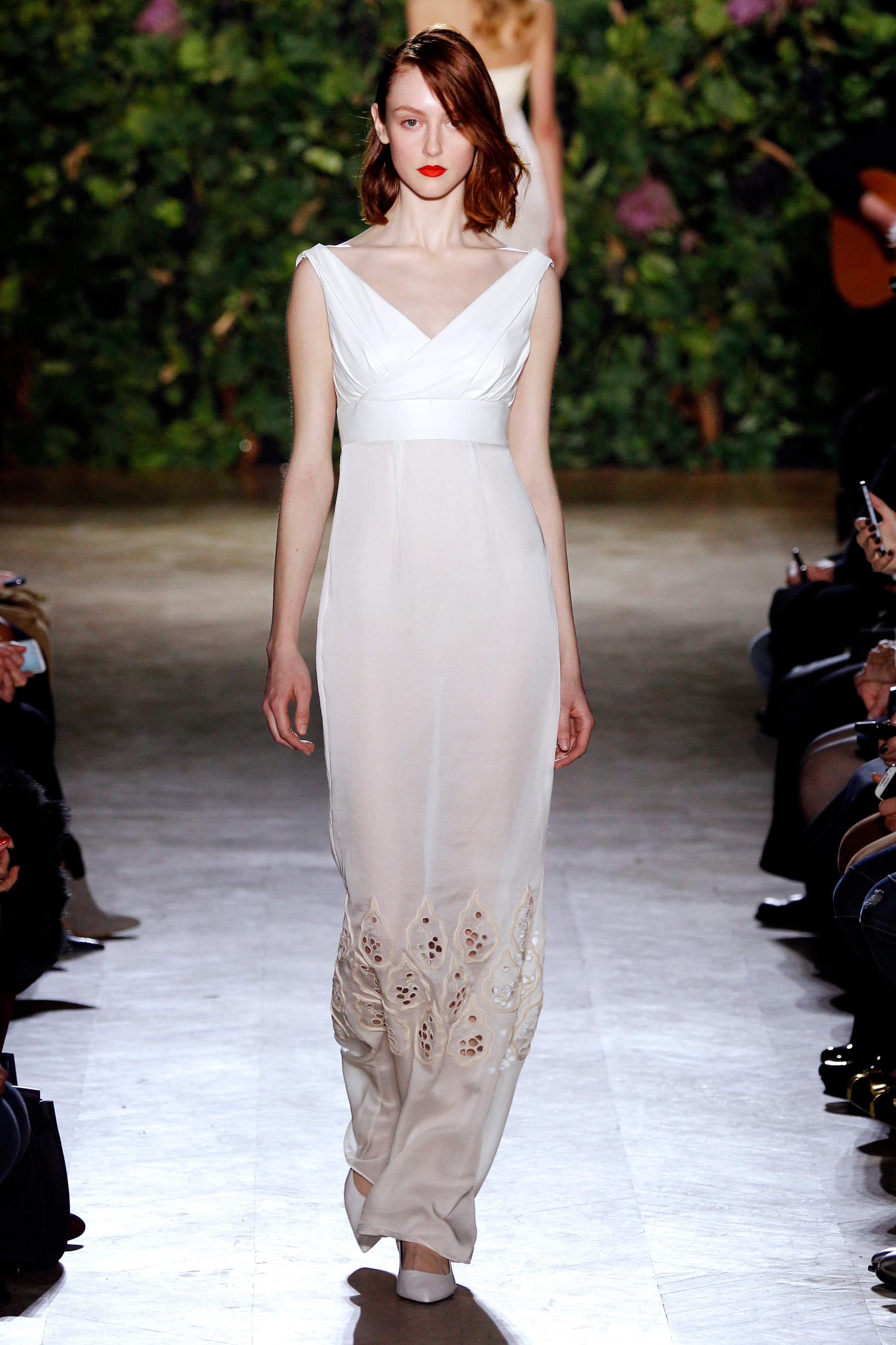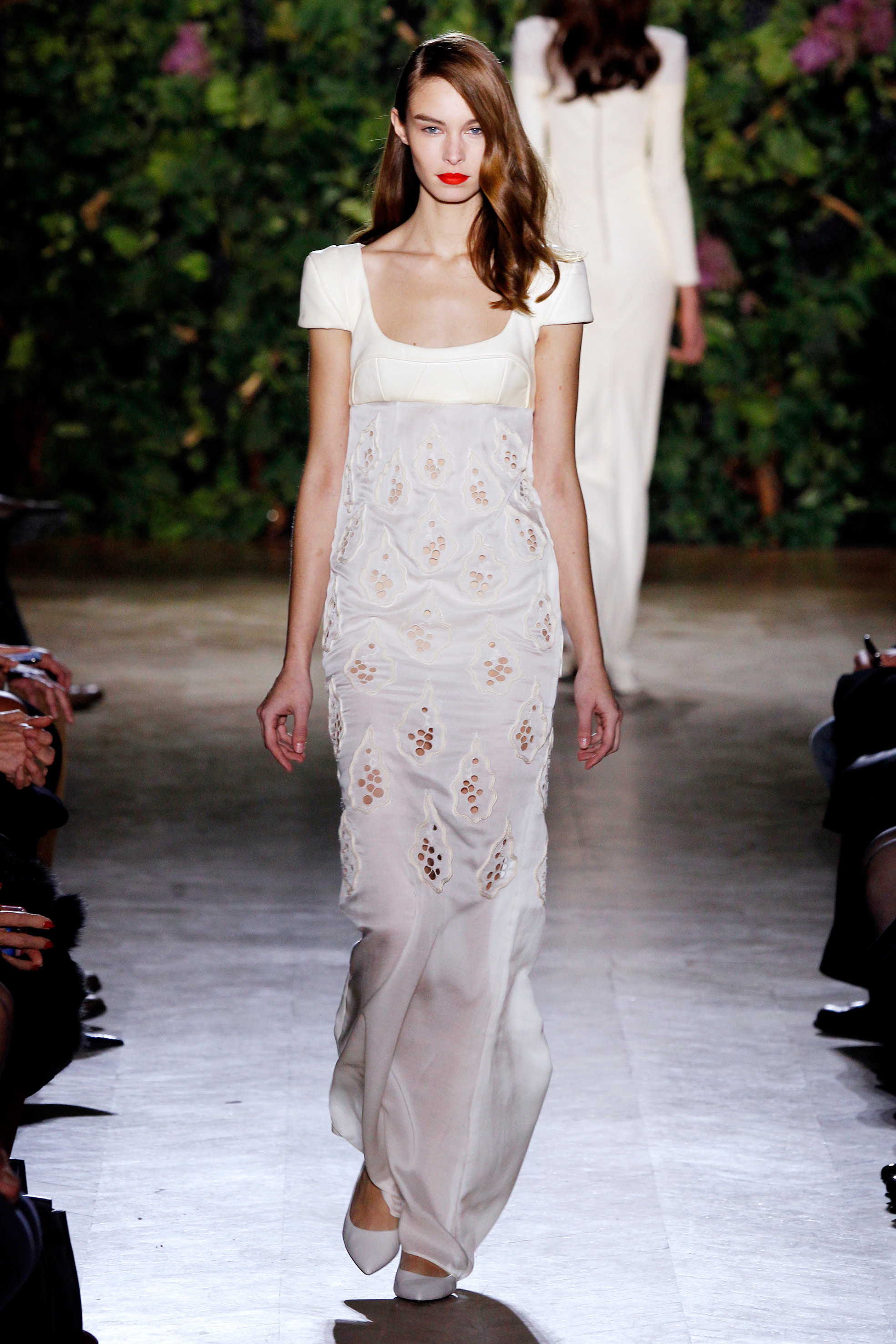 Aux couleurs de terre, à la soie paille, au cuir crème, à la laine terre de soleil, succède la pureté de longues robes de sirène à taille empire, dont la toile immaculée se dessinent au gré de sublimes broderies anglaises, ceps ornementales, grappes de raisins et feuilles de vignes délicates, réalisées par la maison Lesage, comme une signature infiniment couture.