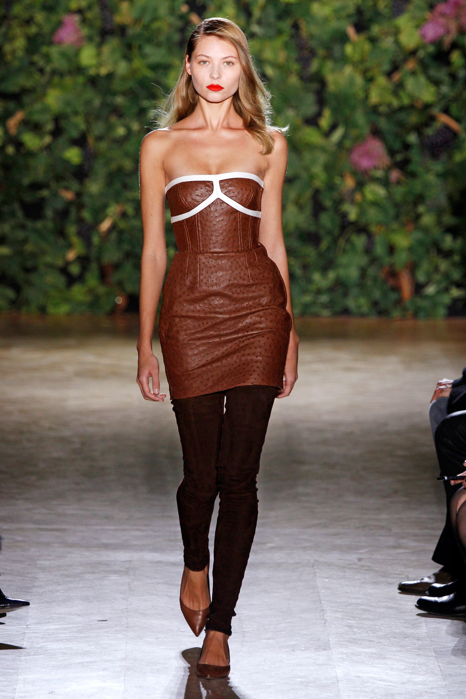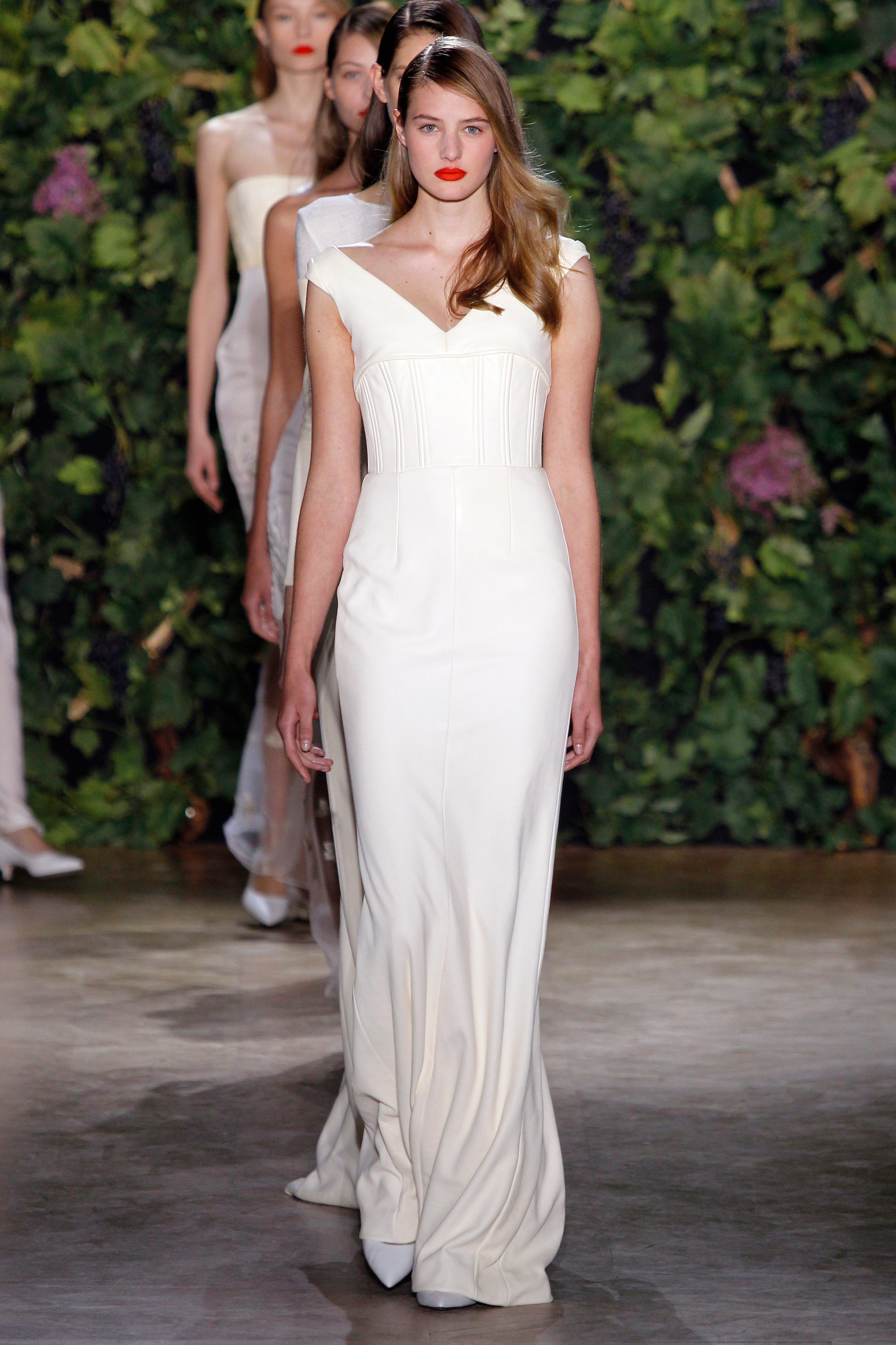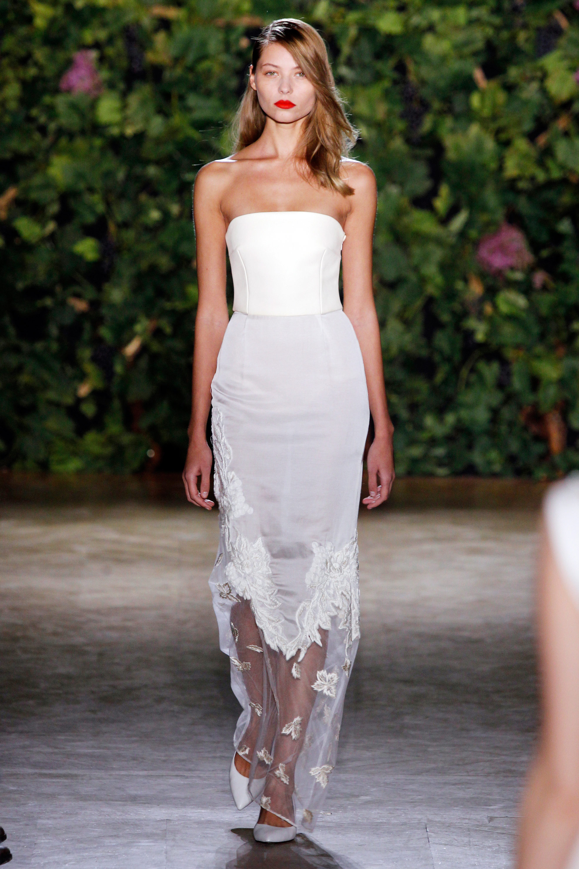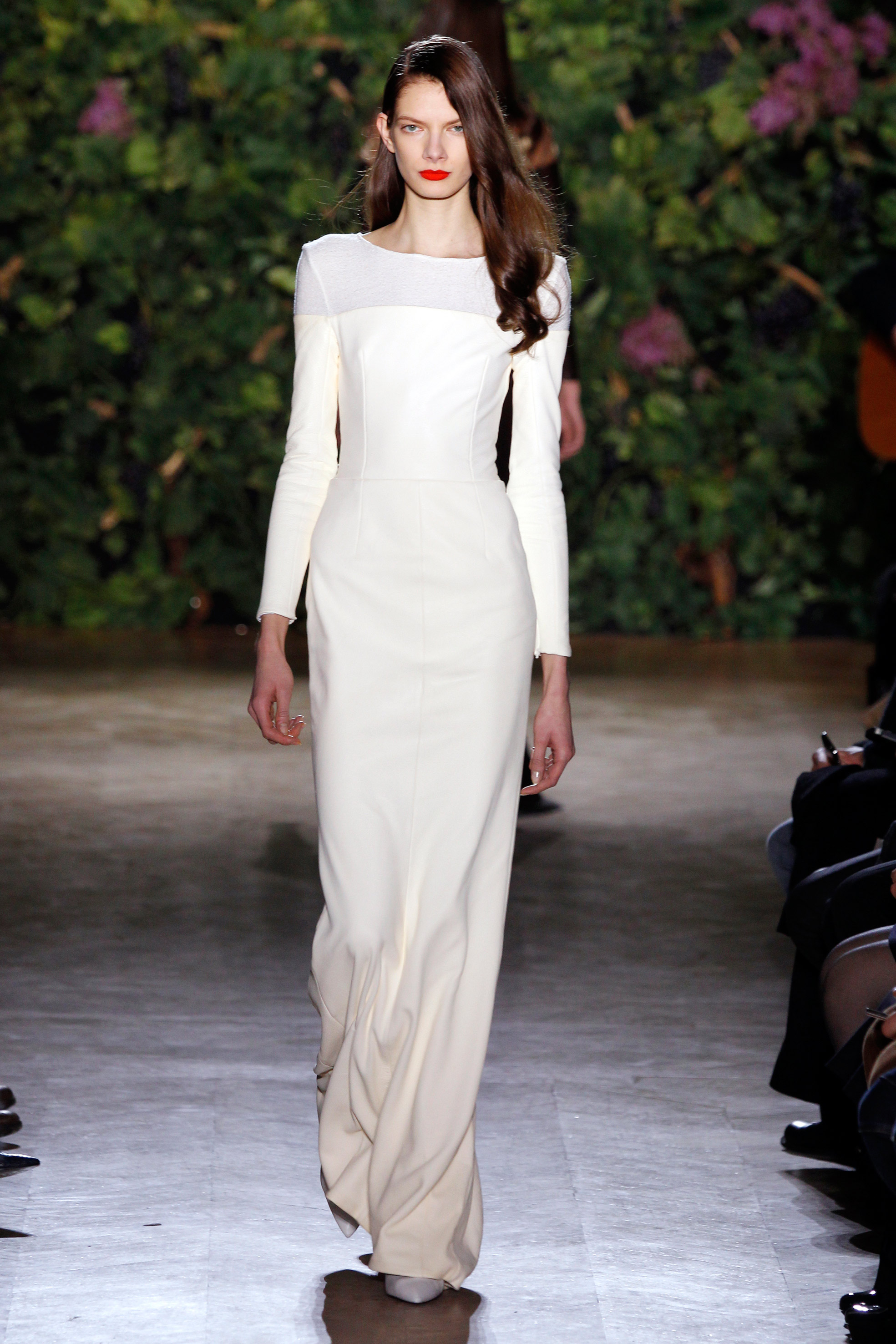 Aux couleurs de terre, à la soie paille, au cuir crème, à la laine terre de soleil, succède la pureté de longues robes de sirène à taille empire, dont la toile immaculée se dessinent au gré de sublimes broderies anglaises, ceps ornementales, grappes de raisins et feuilles de vignes délicates, réalisées par la maison Lesage, comme une signature infiniment couture.