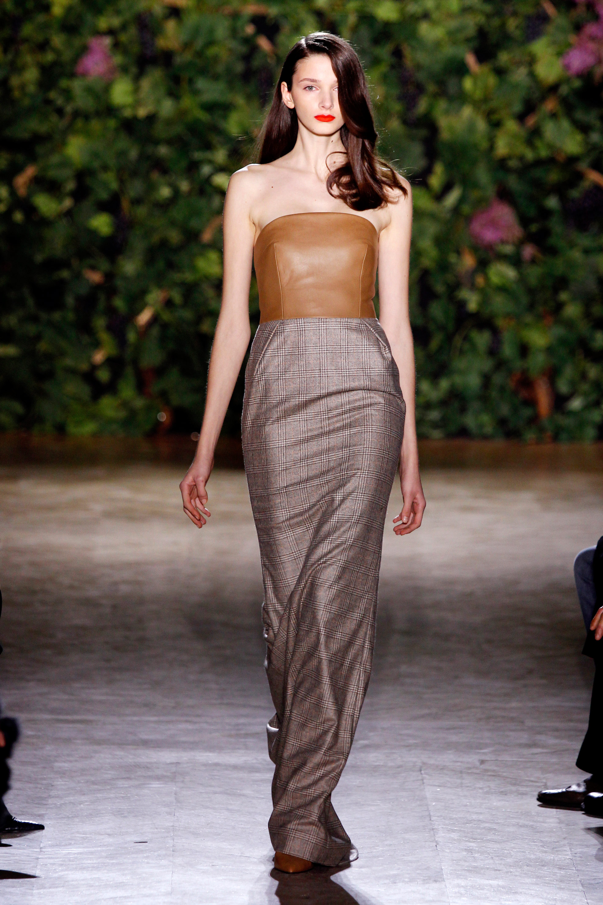 Lʼesprit d’un Old Hollywood se lit en filigrane au fil des décolletés drapés, celui d’un cardigan taillé dans un cuir souple ou bien cet autre d’une robe en molleton brodé couvrant le corps avec une élégance toute pudique. Il y a aussi la ligne A d’une robe féminissime en molleton façon crinoline dont le plastron asymétrique mixe le cuir dans un jeu de construction cher au couturier. Tandis que la beauté d’une robe interminable taillée dans le cuir vanille à la ceinture construite telle un corset exacerbe encore sa
