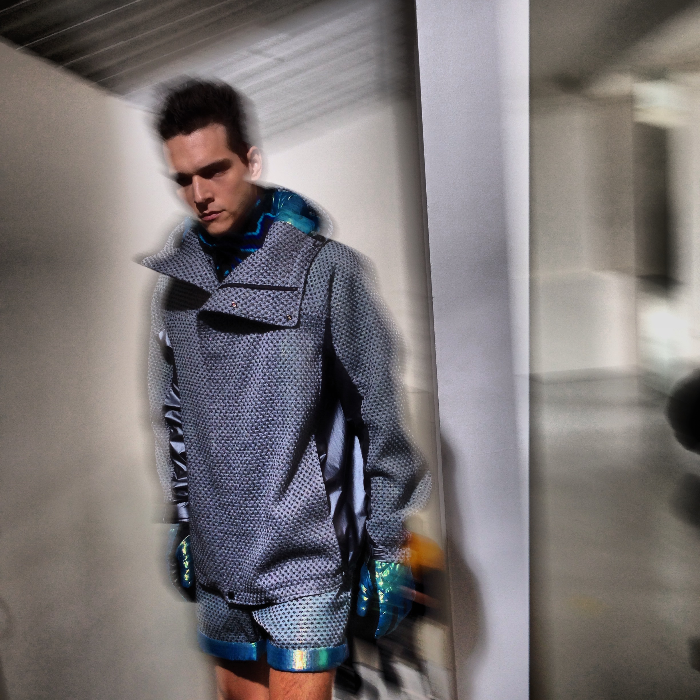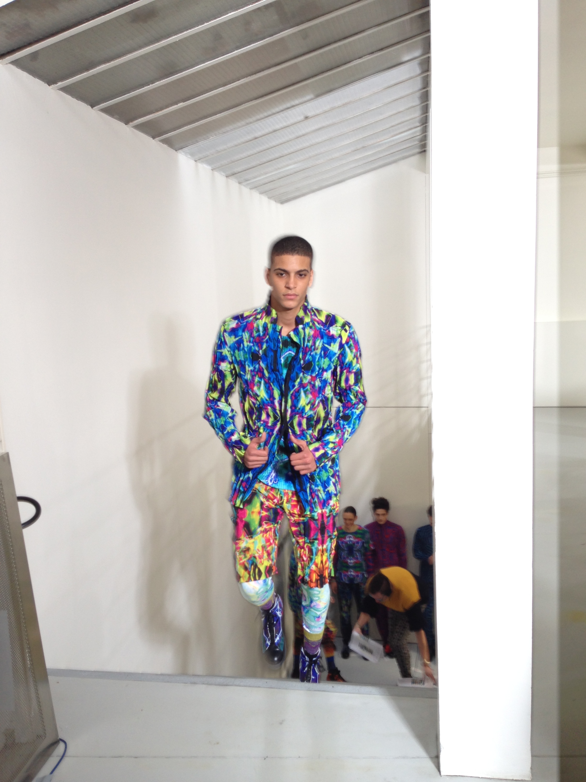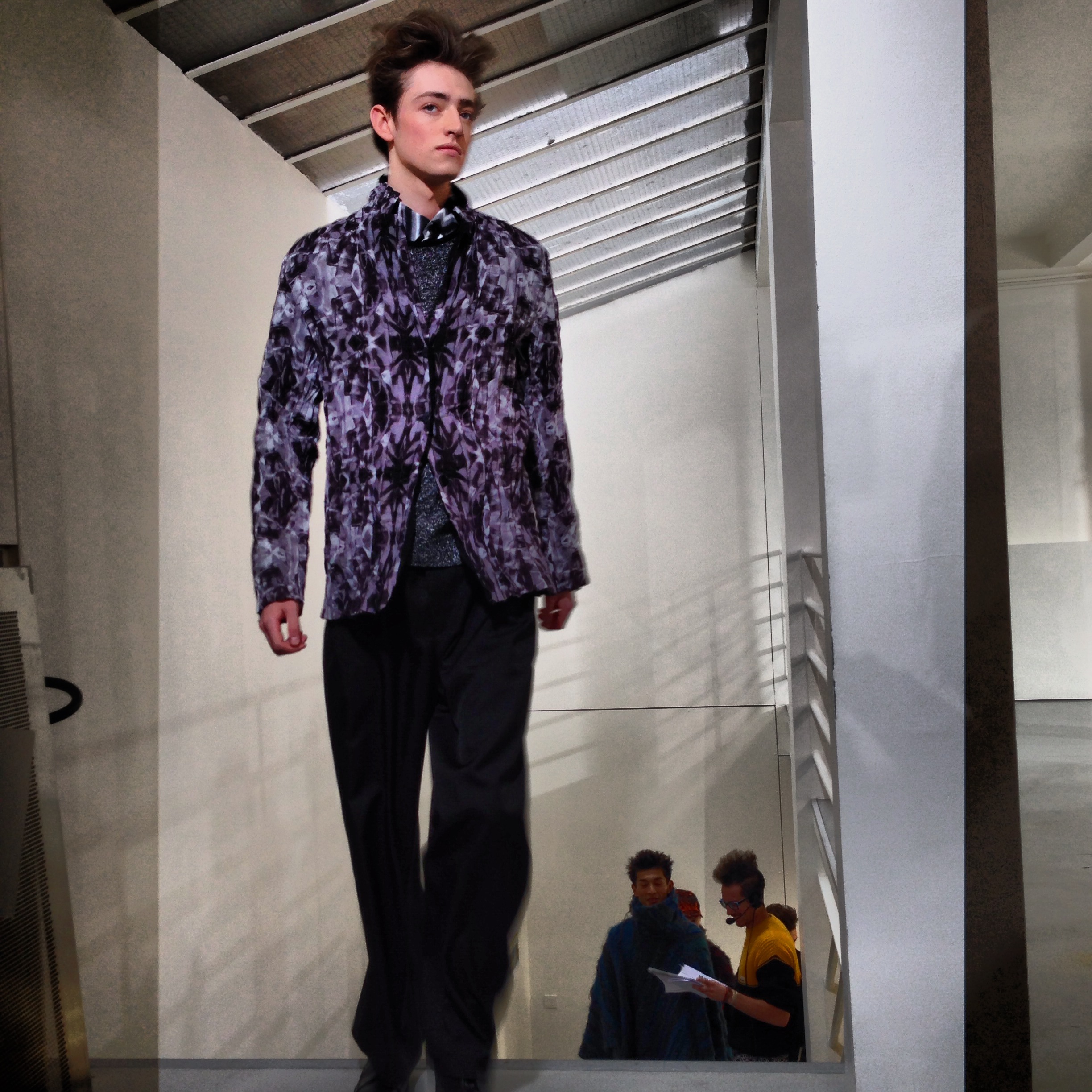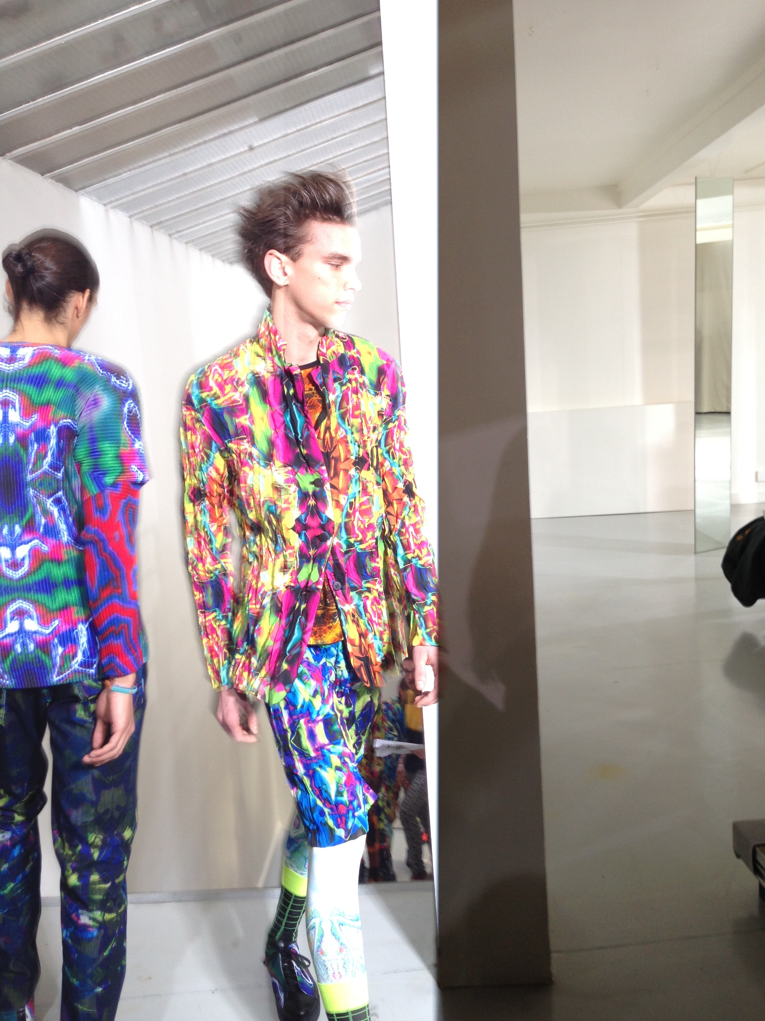 Pour cette collection automne hiver 2014/2015, la maison Issey Miyake prend son inspiration d’un voyage en Icelande pour créer une collection forte et colorée. Jouant avec les effets de matières et le 3D et utilisant des imprimés puissant de psychédélisme, kaleidoscopiques Issey MIyake Men nous provoque un choc visuel mémorable. Les lignes et coupes restent urbaines et fonctionnelles et très moderne.