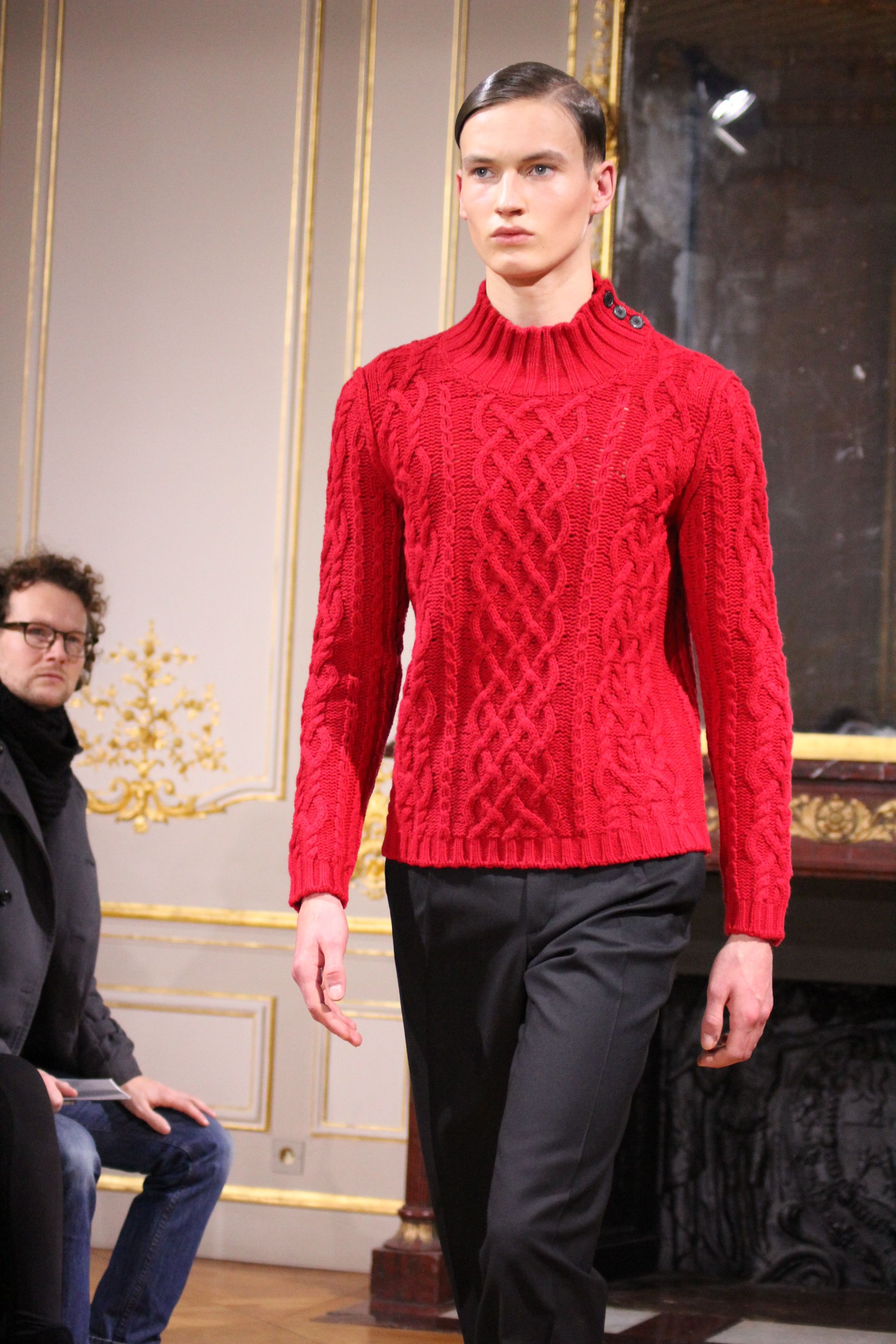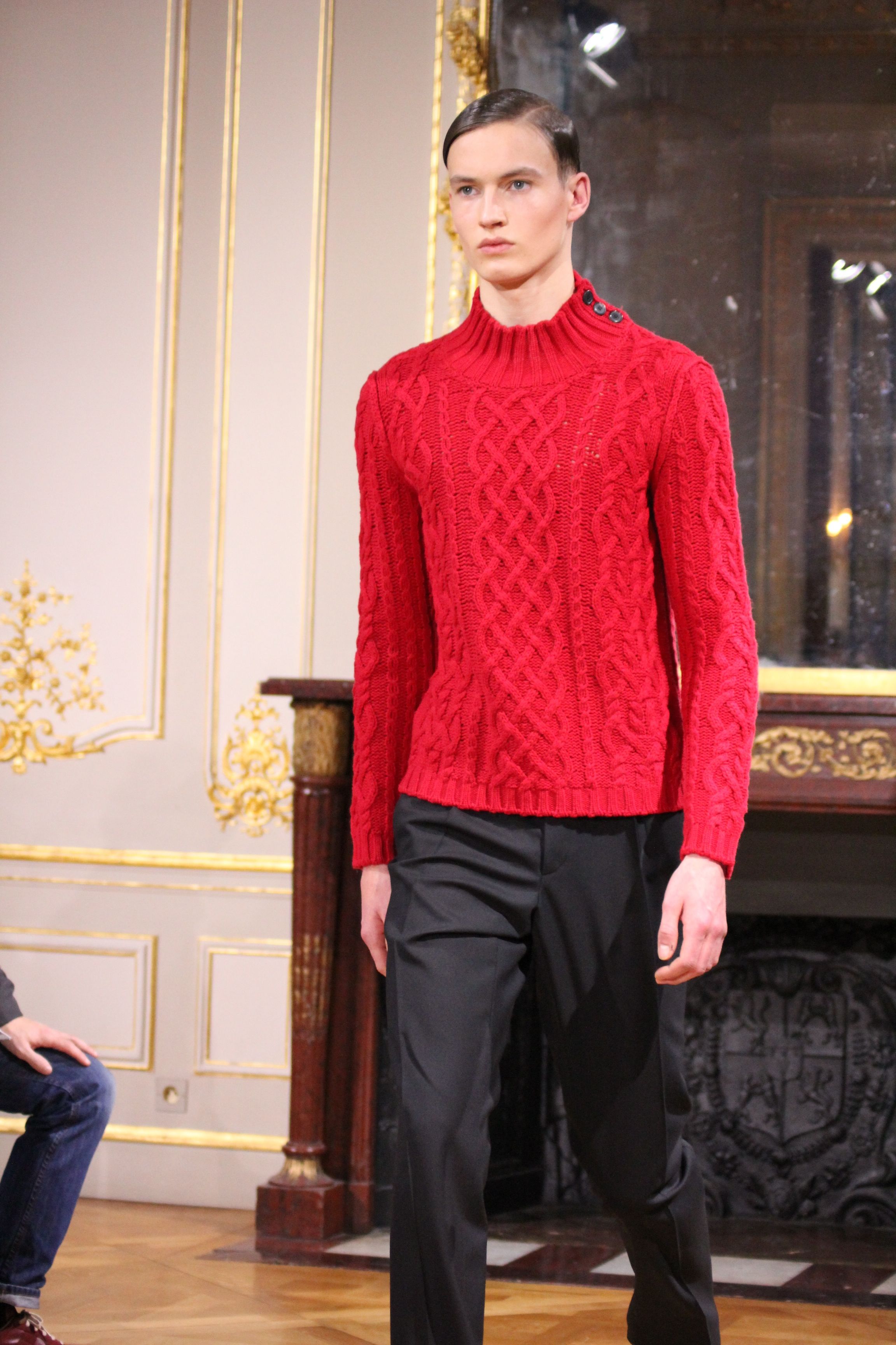 La maille revient à ses origines avec des coutures tricotées style aran dans une interprétration moderne. Les coutures en relief inspiration Brandebourg- passementerie symbolisent l’homme et son rang.
