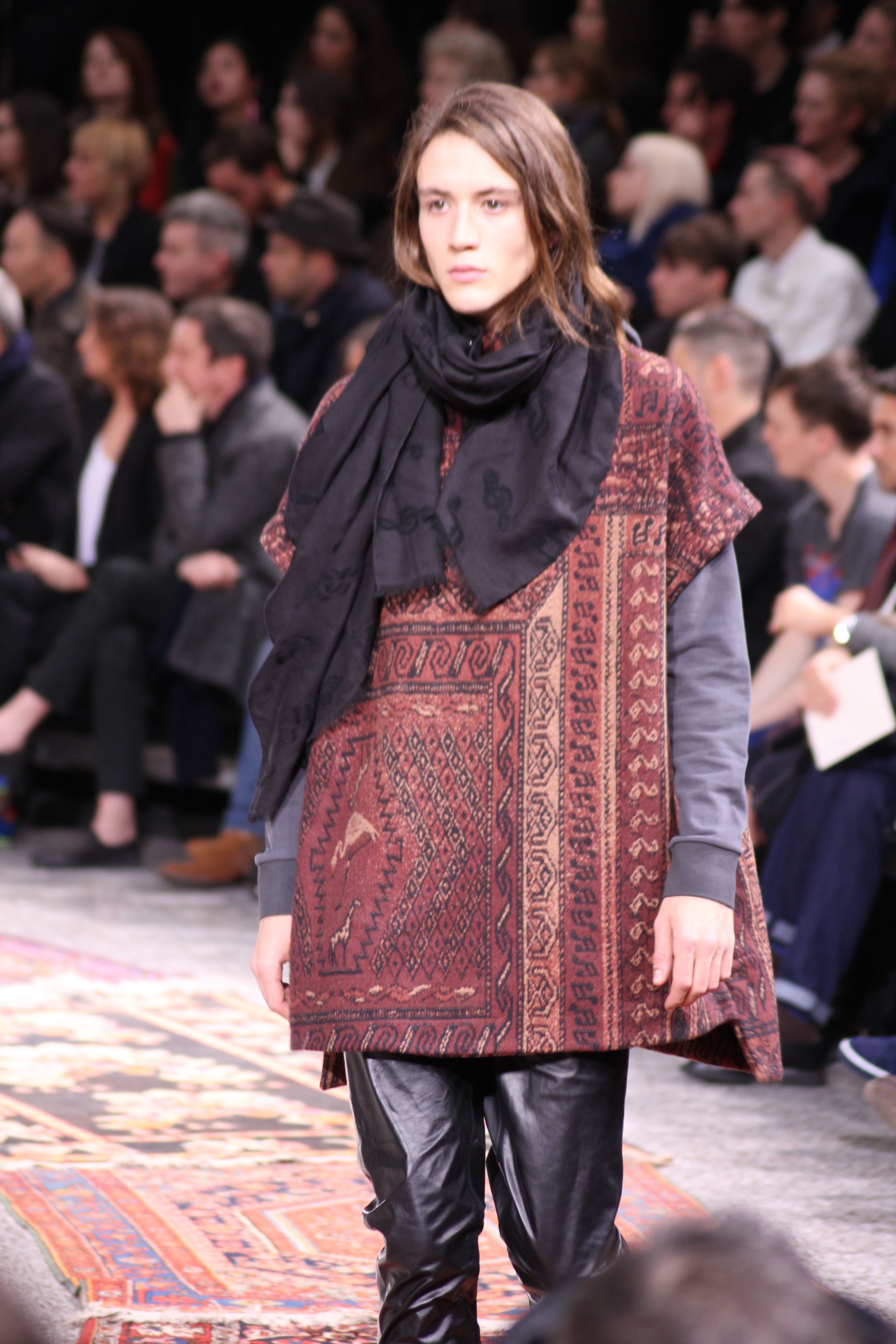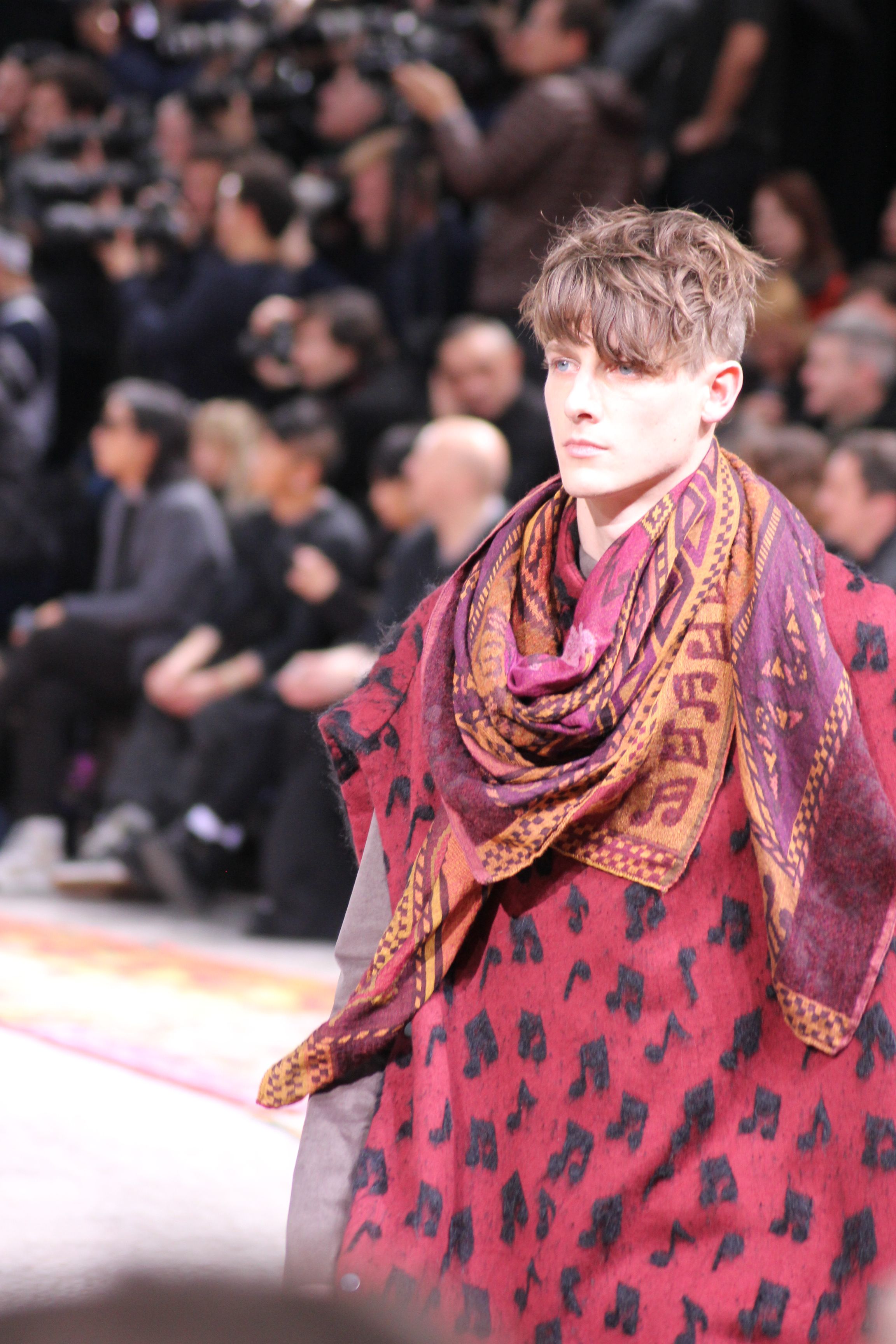 Les silhouettes sont amples, les imprimés psyché, et des couleurs ensoleillées. Les tissus semblent sortis d’un souk, volés à des tapis d’orient, les imprimés trompe l’oeil nous font voyager avec eux. La musique n’est jamais bien loin avec des jacquard aux notes musicales.