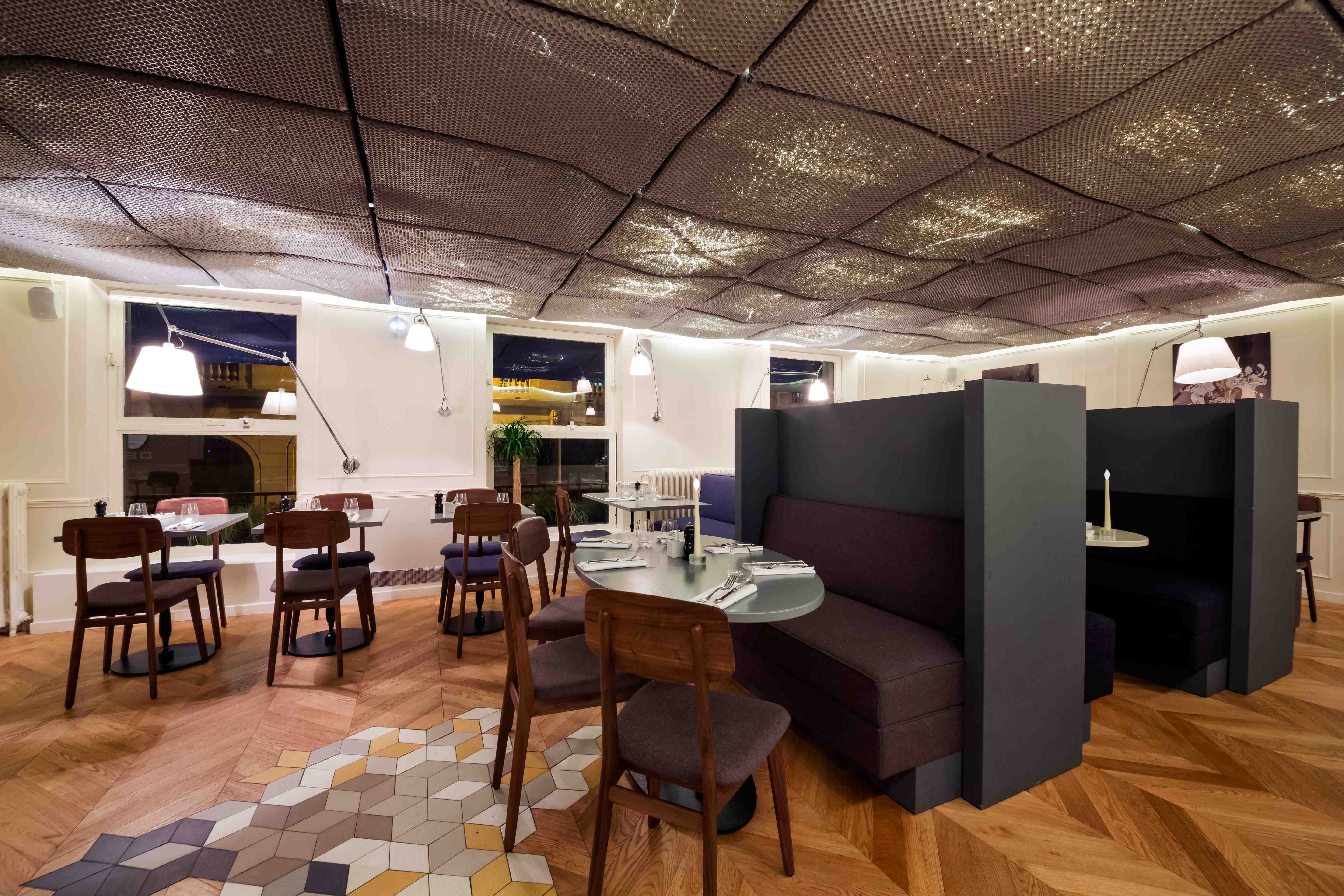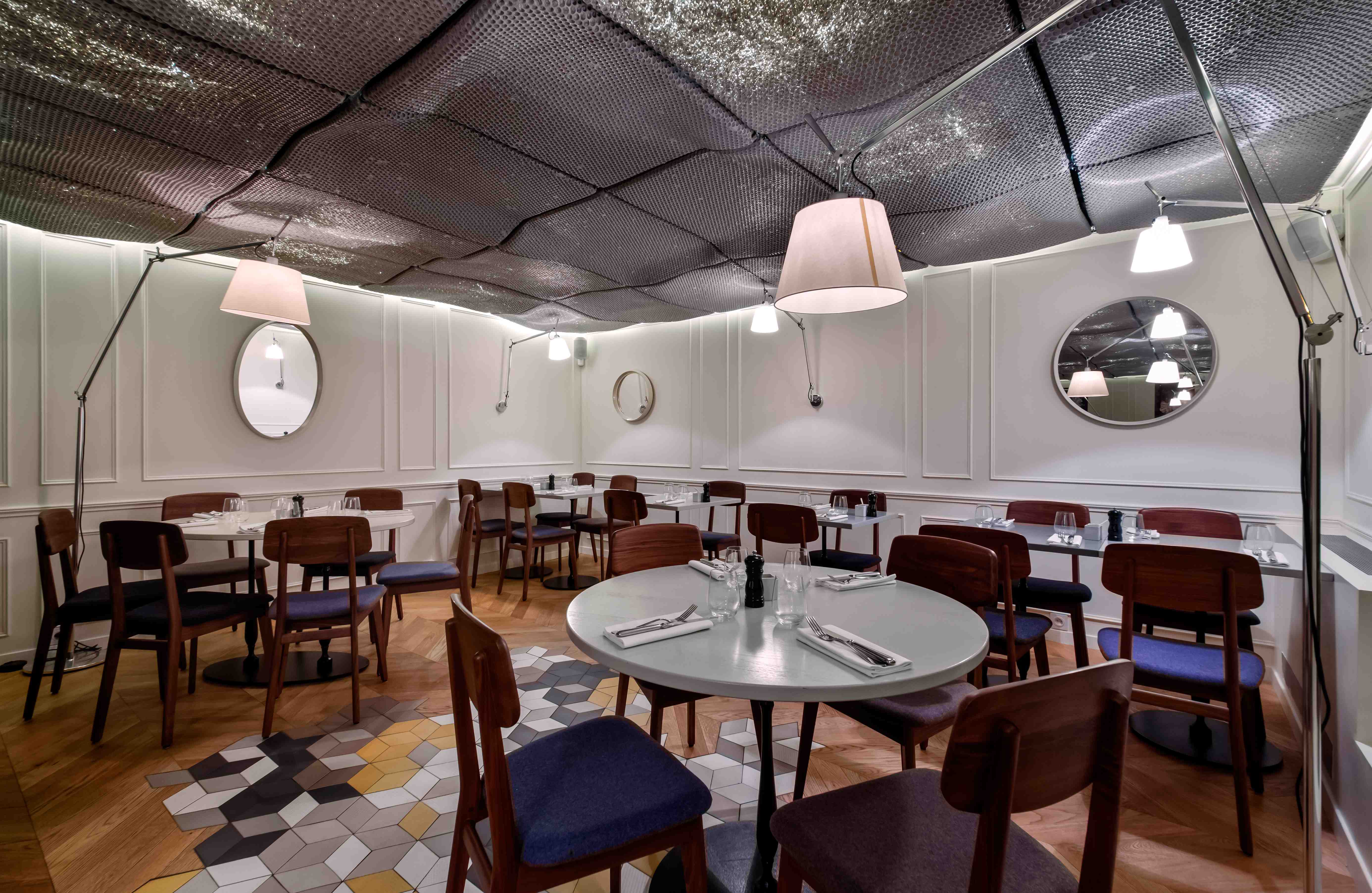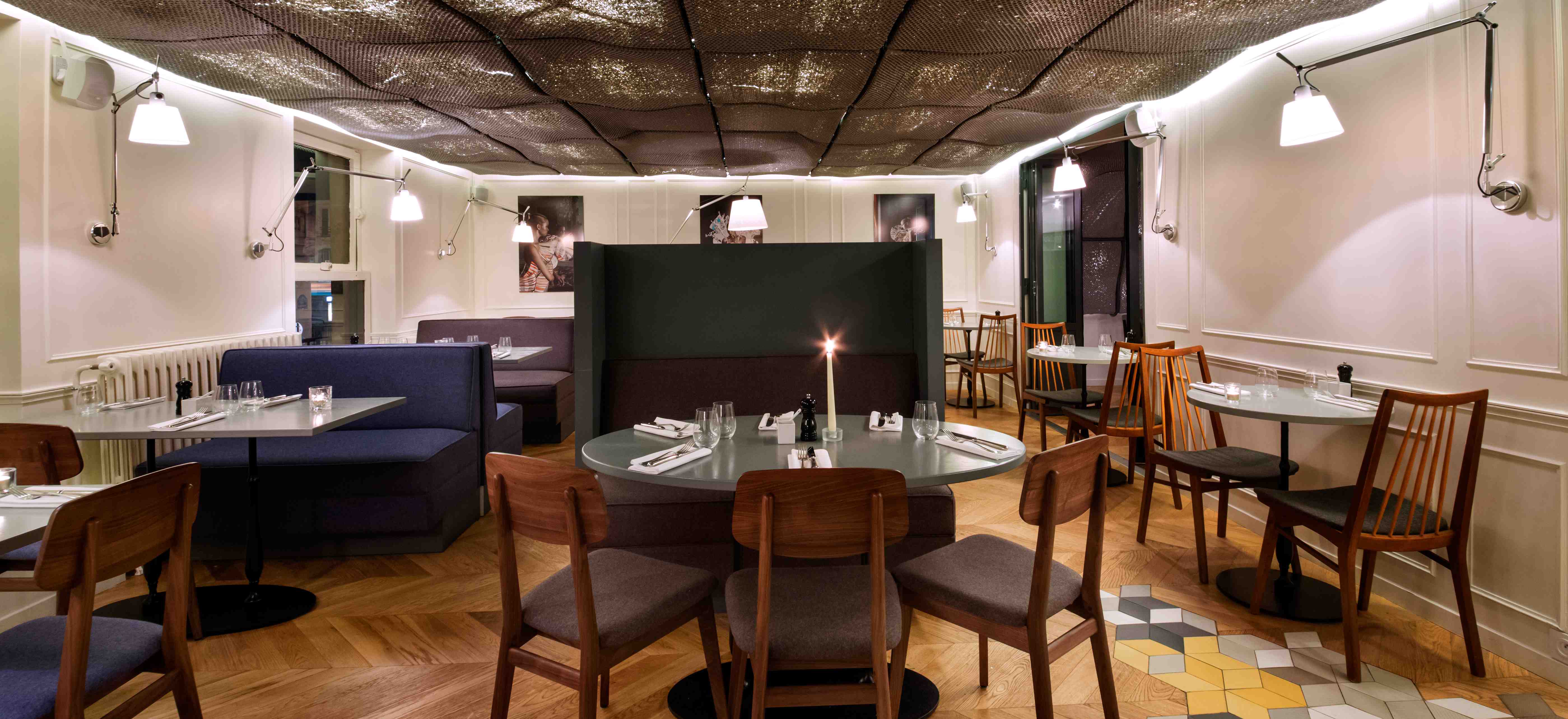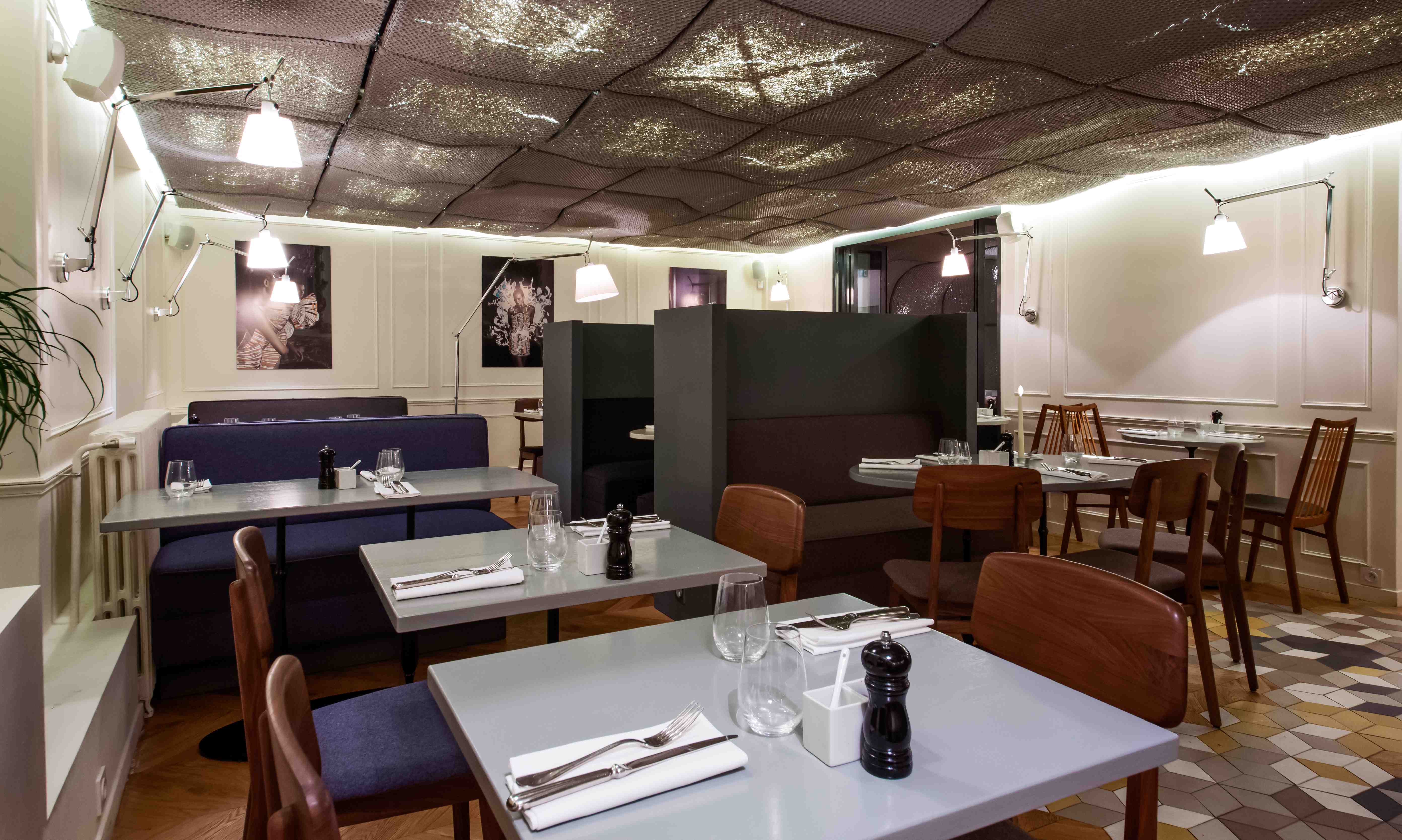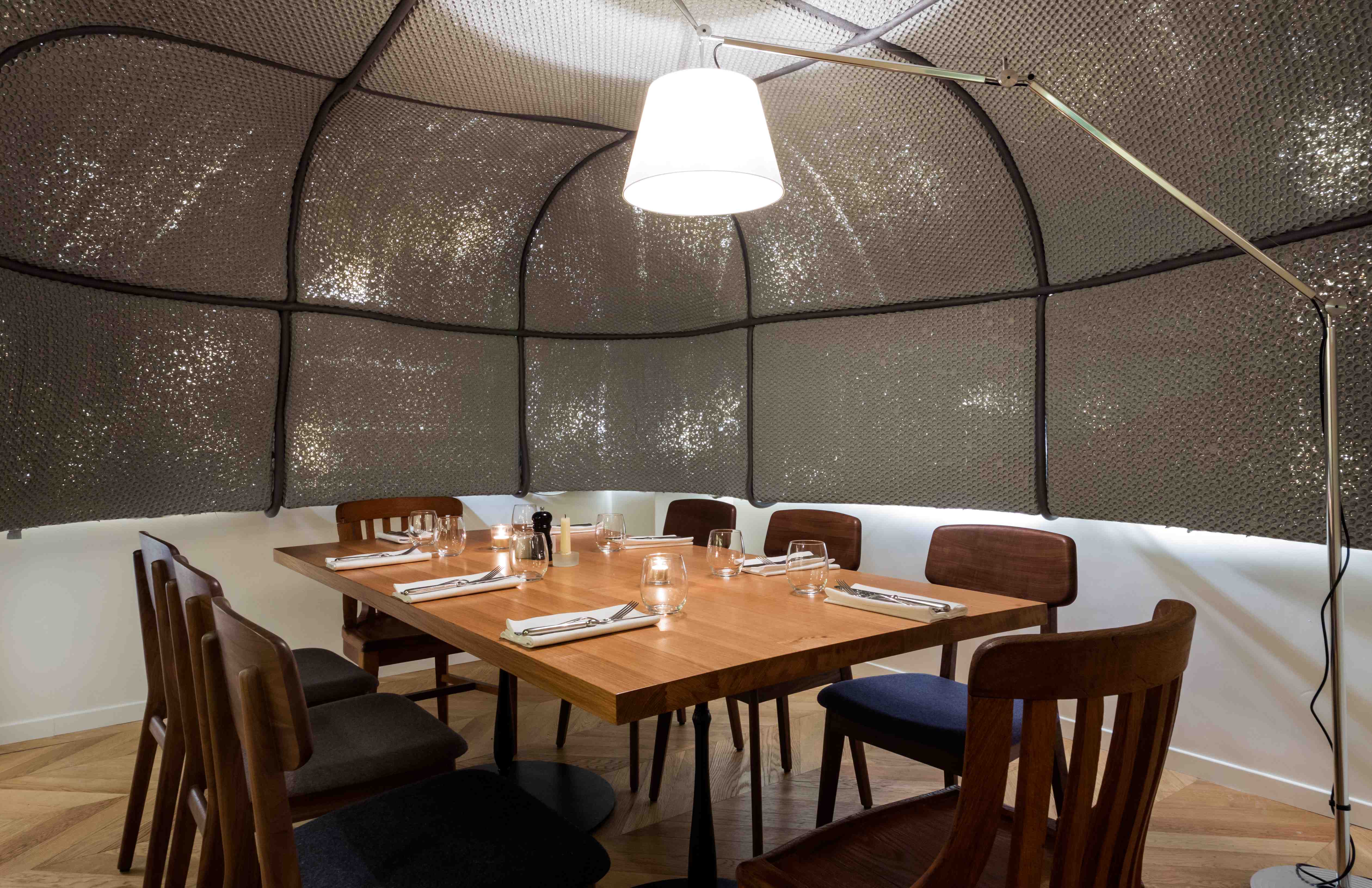 Situé au 3 rue Rougemont, Paris 9ème (Grands boulevards), Maison F joue la carte de l’insolite. Le lieu est à la fois feutré et trendy. Nicolas et Baptiste ont voulu un cadre à la hauteur de leur concept. La décoration a été confiée à de jeunes architectes, Cent15 architecture, qui ont pensé le lieu en décalé des univers classiques de la restauration.