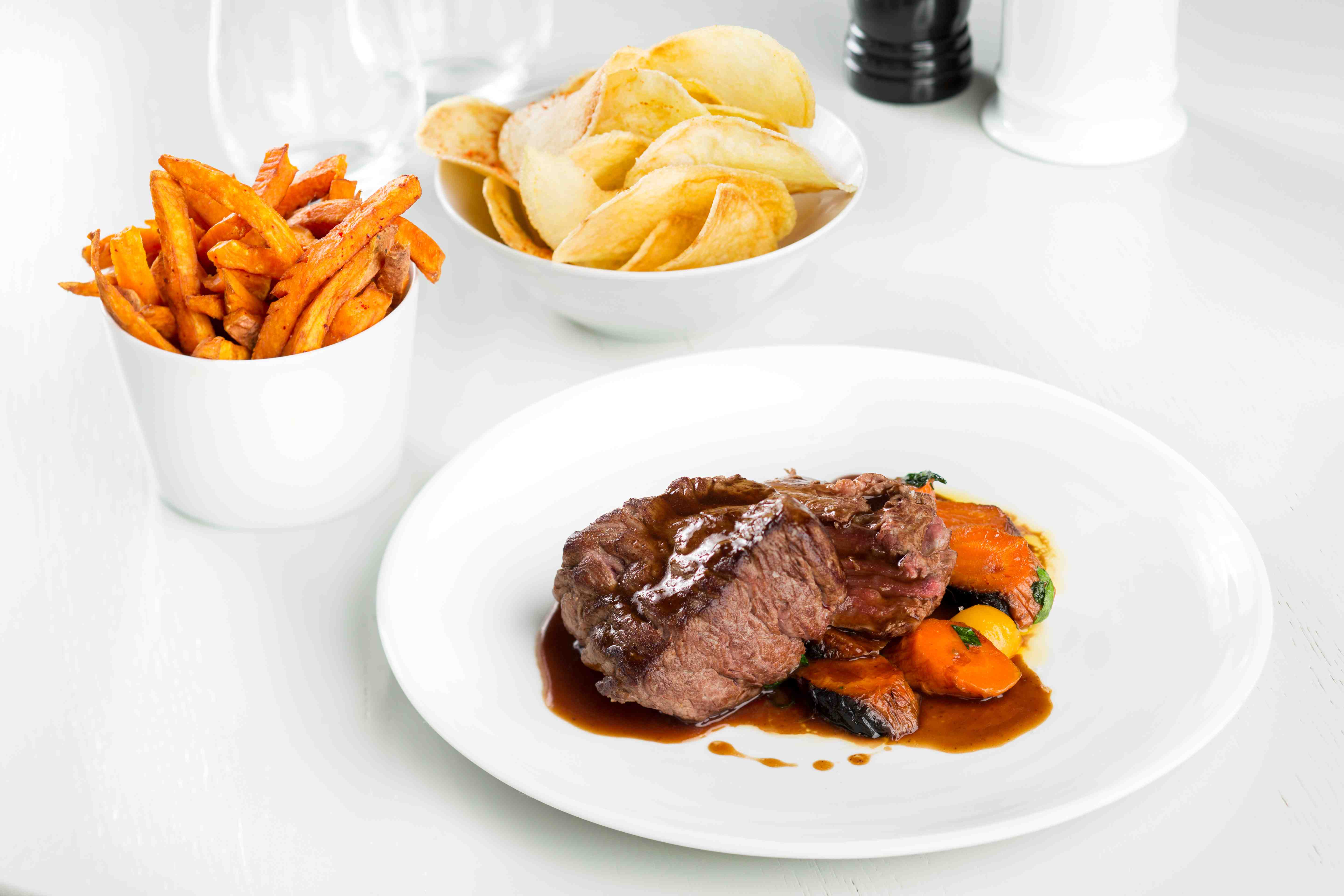 A la Maison F, on choisit : pommes allumettes, pommes frites ou pommes Pont Neuf. Et chaque jour, le restaurant propose une frite à sa façon (cuites au blanc de boeuf, à la graisse d’oie, parfumées à la truffe, frites de légumes, etc…). Les partitions interprétées par le chef, Olivier Jegousse, sont précises et de haut niveau. La frite se dévoile sous toutes les coutures, de toutes les couleurs et avec un goût inimitable : choix des meilleures variétés de pommes de terre, graisses de cuisson les plus judicieuses, épices, rien n’est laissé au hasard pour proposer aux clients des frites « haute couture ».