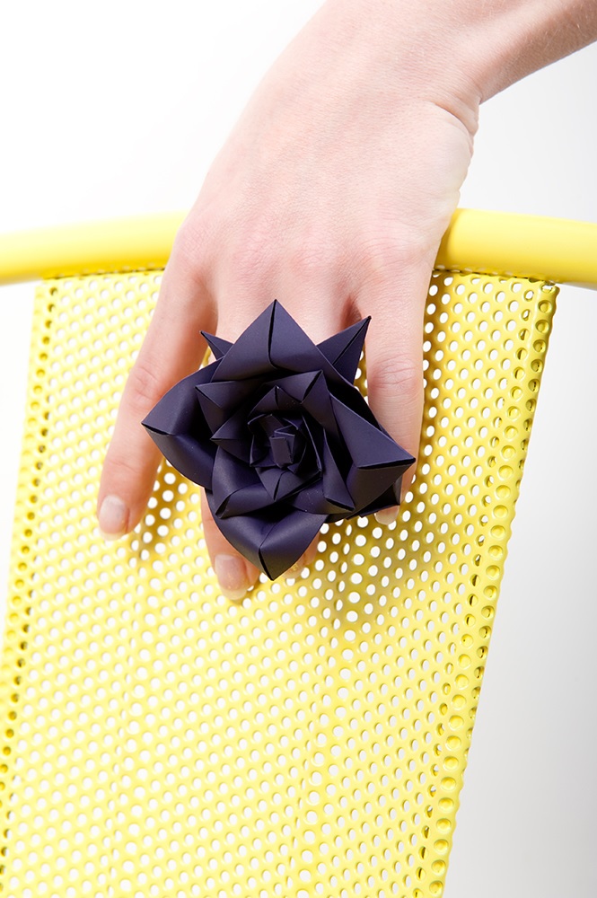 Des bagues légères et poétiques, véritables objets-bijoux. Dans un papier de création velin mat en partenariat avec le Brainstore Antalis (Paris 13), les bagues éphémères ‘Spring’ viennent fleurir une silhouette pour une occasion particulière ou faire pétiller un look de tous les jours.