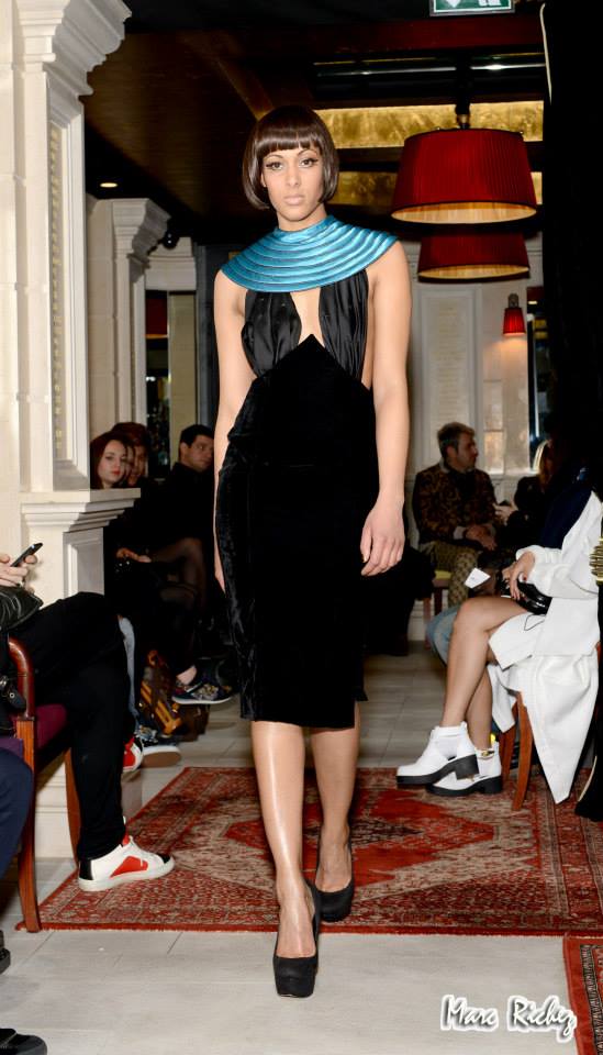 Body de velours frappé, couvert d’un voile de satin noir (Ptolémée) ; Pull en fourrure ivoire au poignet de satin bleu clair (Sceptre) ; Short d’hiver ivoire et de paon se pare de cols en drapé rond est imposant qui rappel la mode Egyptienne antique . La robe Osiris conclut ce catwalk , la robe longue en satin bleu électrique fendue au milieu du devant, et au bas de manche en velours noir, offre puissance, fluidité du mouvement et fort caractère au corps féminin.