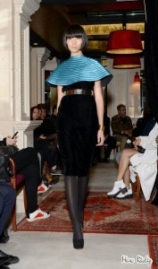 Escortée par un serviteur de l’Egypte antique aux muscles saillants, le premier mannequin porte la robe Anubis, top dos nu en voile de satin rehaussé de strass Swaroski gorgerin en satin turquoise et gris métallisé se combine à une jupe fourreau en velours de soie noire, la silhouette est féminine,sexy tout en étant élégante et puissante. Le ton est donné, la femme Fahaid Sanober est forte, puissante à l’image de la reine- muse Cléopâtre.