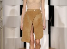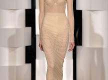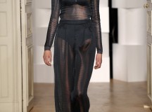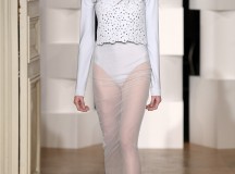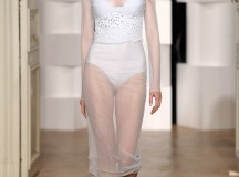 Les points forts de la collection se traduisent par ce travail de découpes laser dans un tissu épais. Le décor floral obtenu se décline sur un bustier. Le néoprène donne un côté sportswear à la collection.