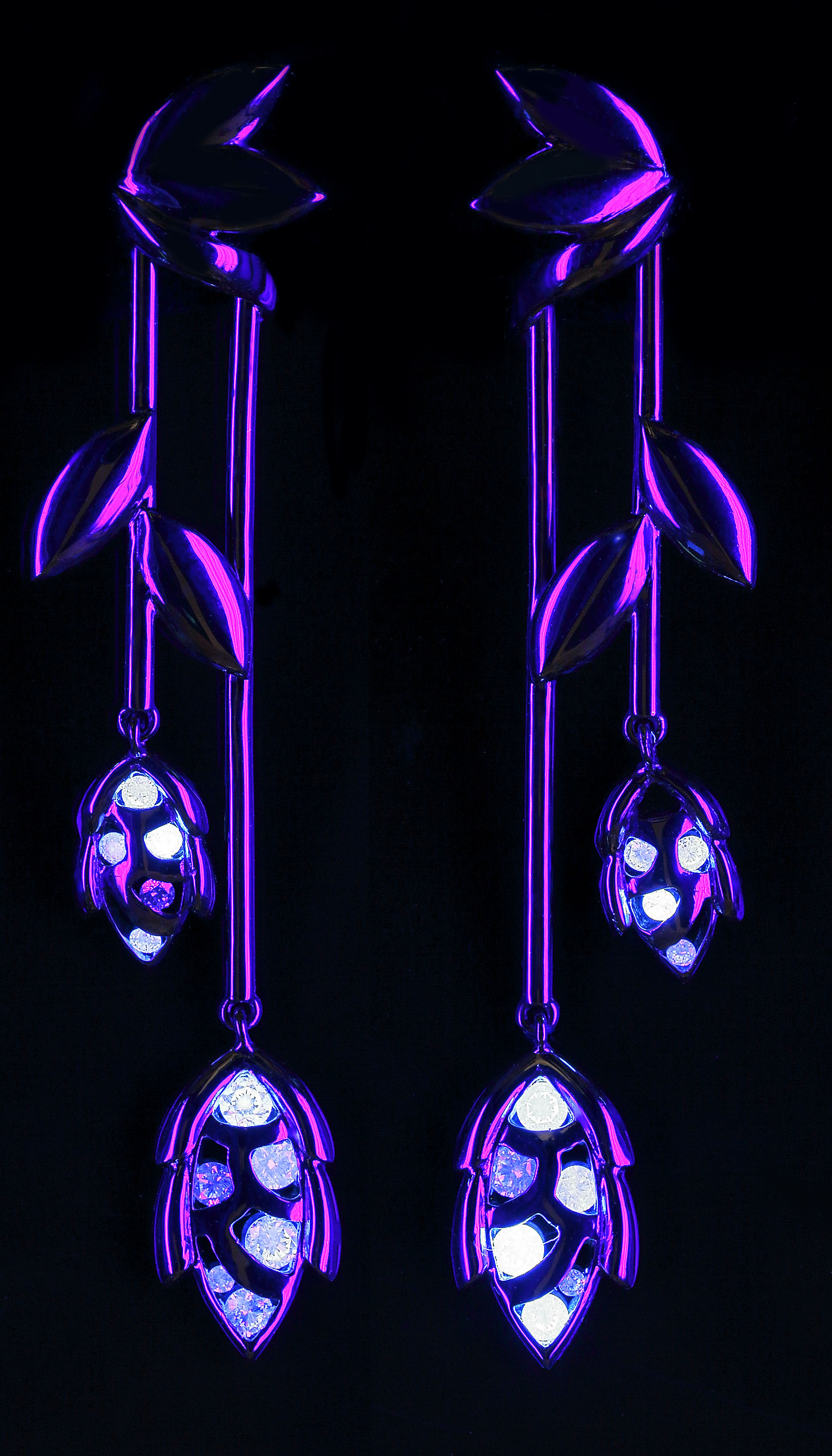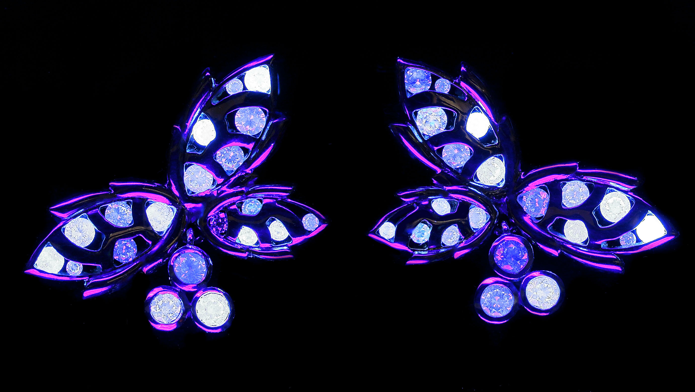 Diamant le jour, l’aspect fluorescent se révèle à la lumière noire.  Cette particularité permet à la pierre précieuse de s’exprimer dans tous ses éclats.