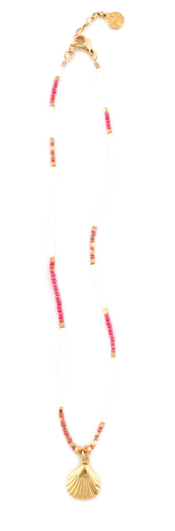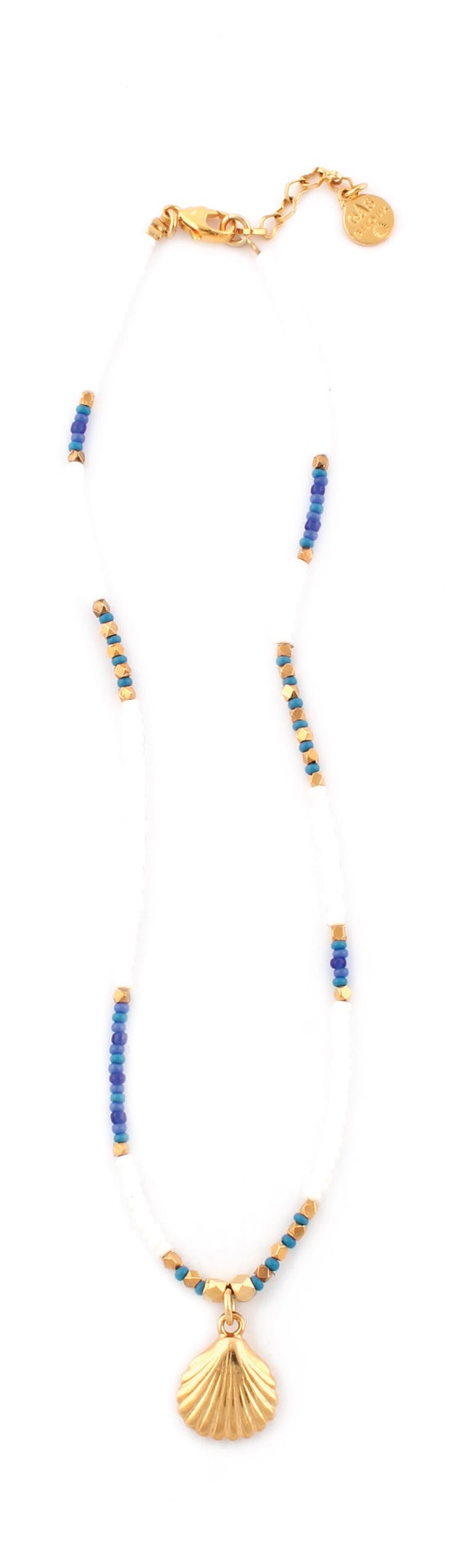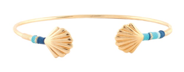 Inspirées de la richesse des fonds marins, elles ont créé la collection Shelly qui mêle coquillages et perles colorées. Le collier Shelly est composé d’une chaîne alternant perles de rocaille et perles de laiton dorées et facettées et d’un pendentif en forme de coquillage. Le bracelet Shelly est monté sur un jonc en métal doré à l’or fin 24 carats emballé de fils de coton et de nylon et orné de deux petits coquillages.