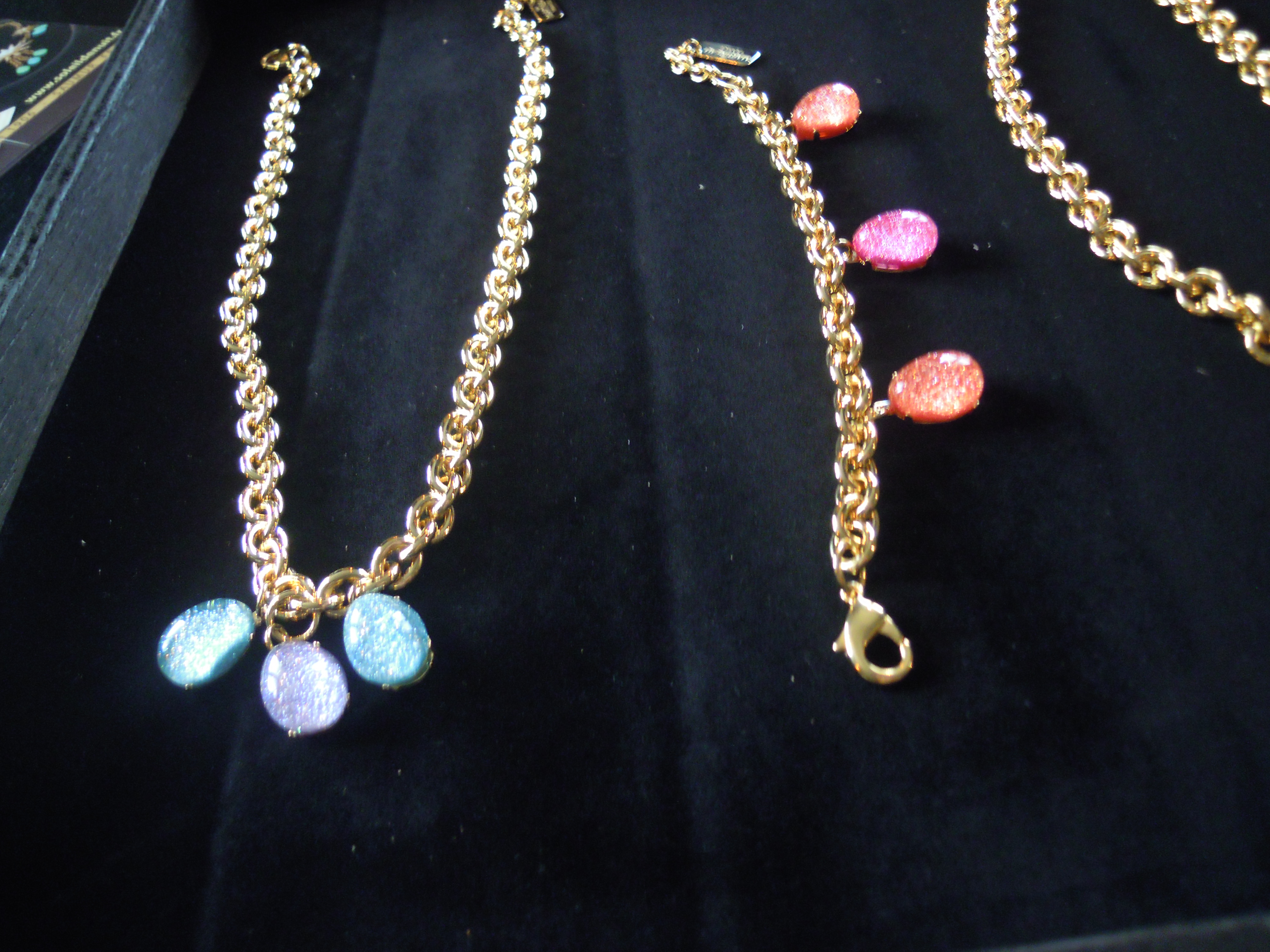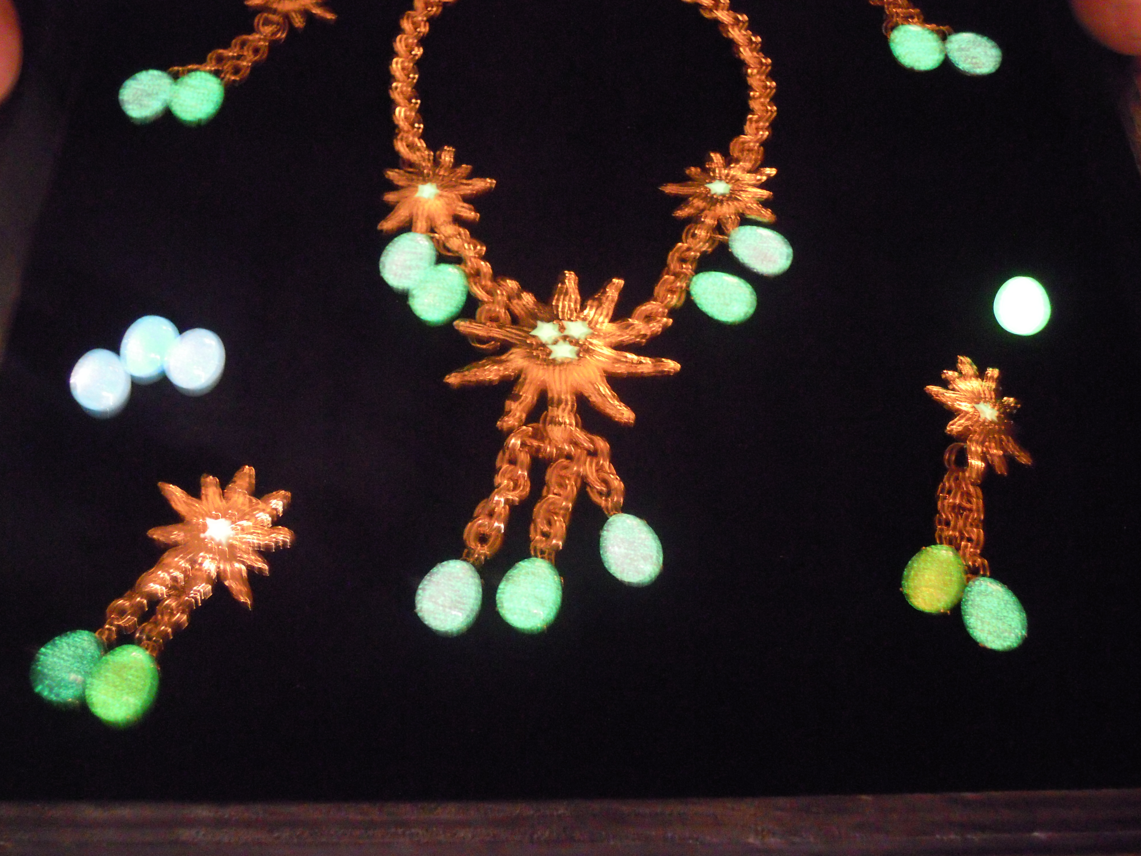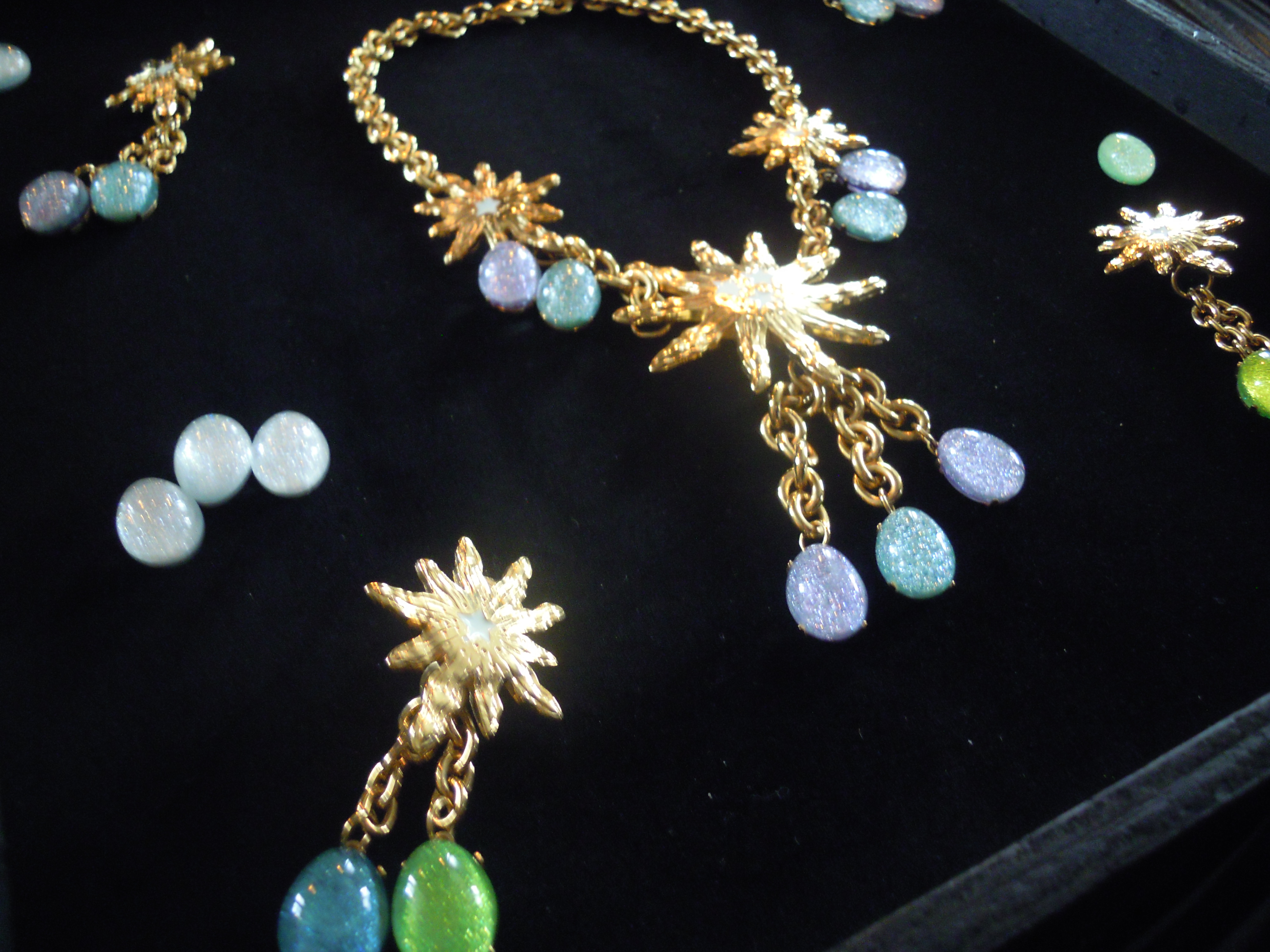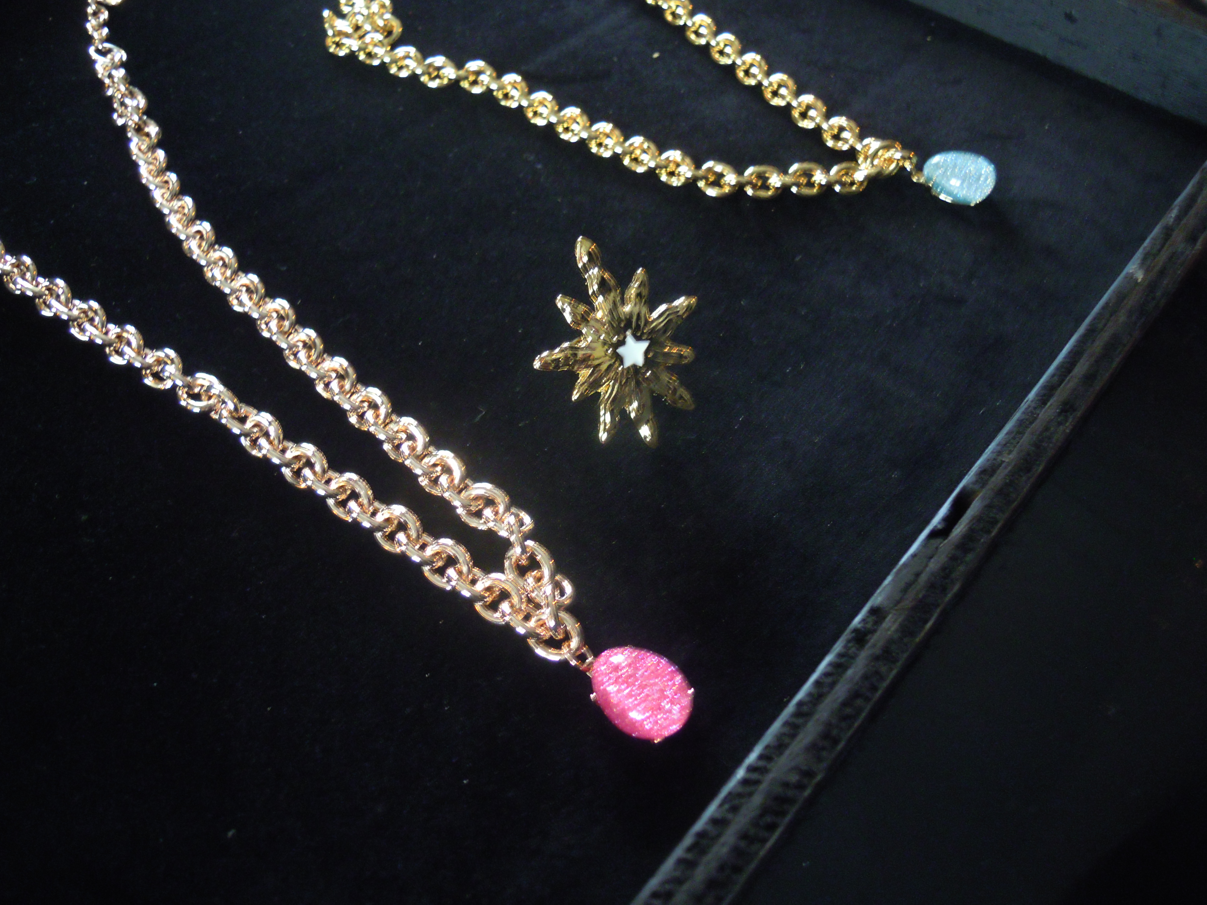 La première partie de cette collection se veut du « soir », car elle comprend des colliers, bracelets et boucles d’oreille plus imposants. L’image du soleil y est très présente. Ceux-ci, ainsi que les chaînes, sont en plaqué or. Les perles de résine, quant à elles, se déclinent dans des couleurs chaudes, comme le rose et l’orange, mais aussi dans des couleurs froides, le vert, le bleu, le violet. Ces pièces, une fois portées, font vite impression. Associées à une tenue très simple, les perles photoluminescentes ainsi que les soleils joueront parfaitement leur rôle lumineux !