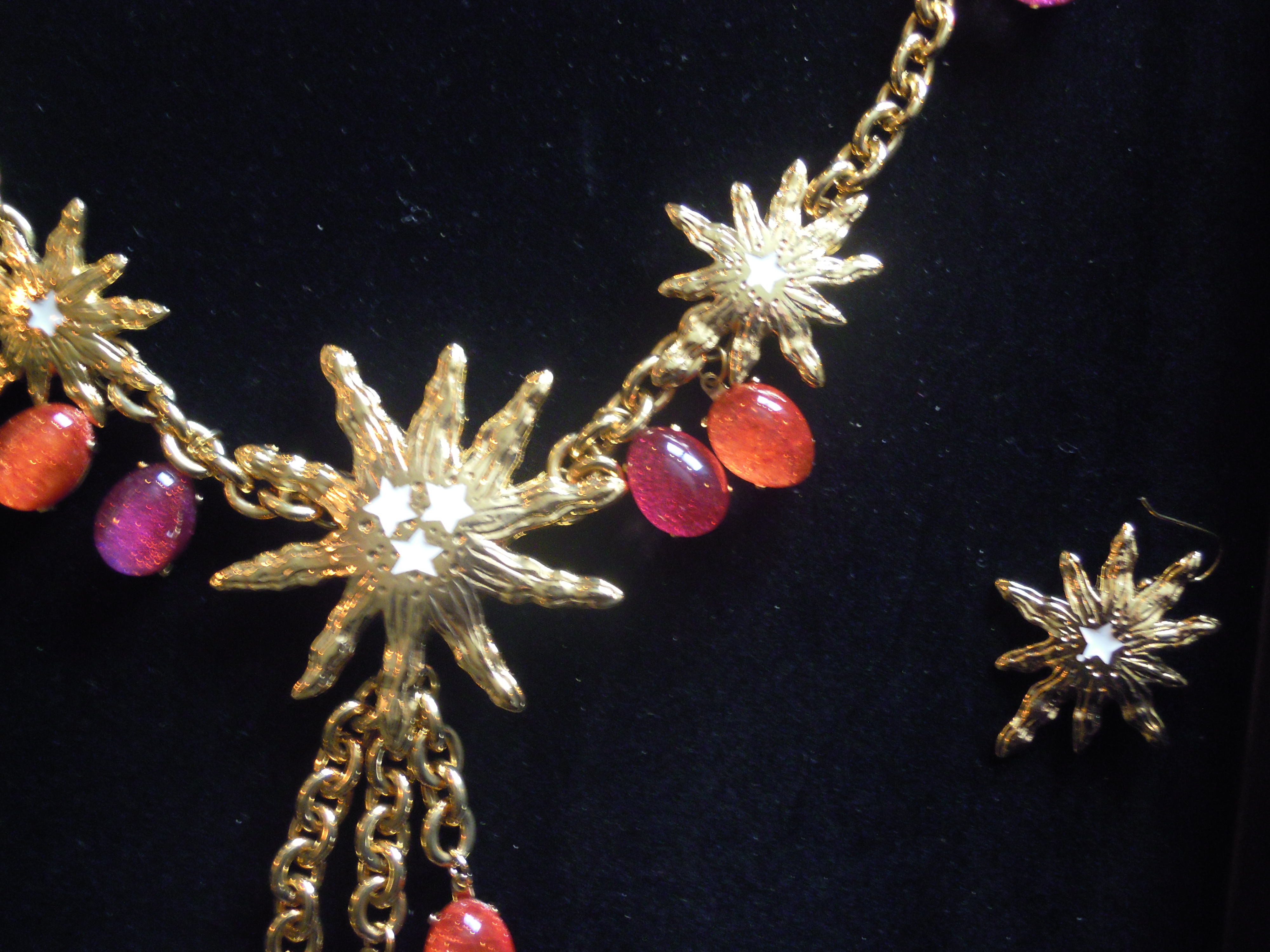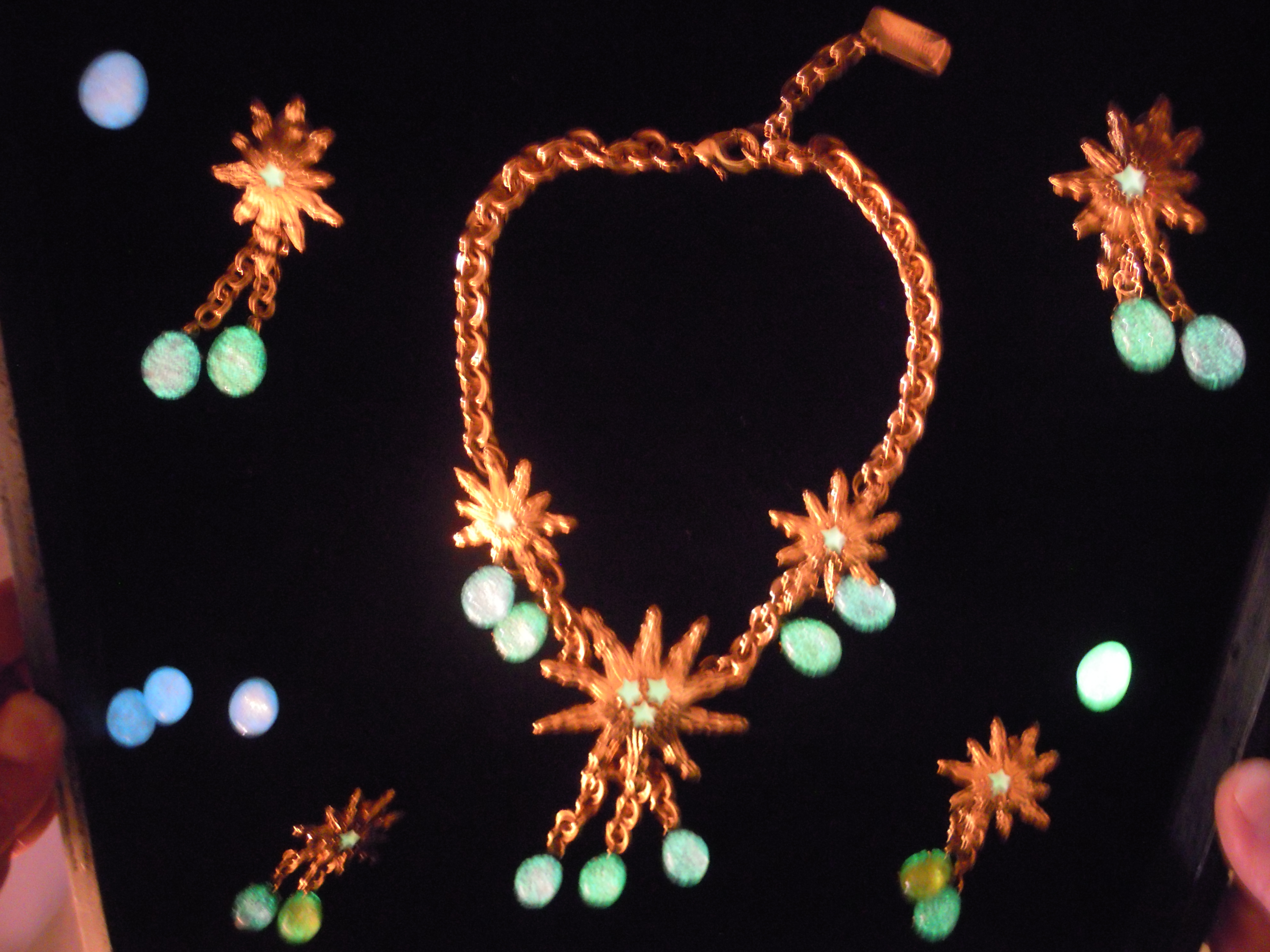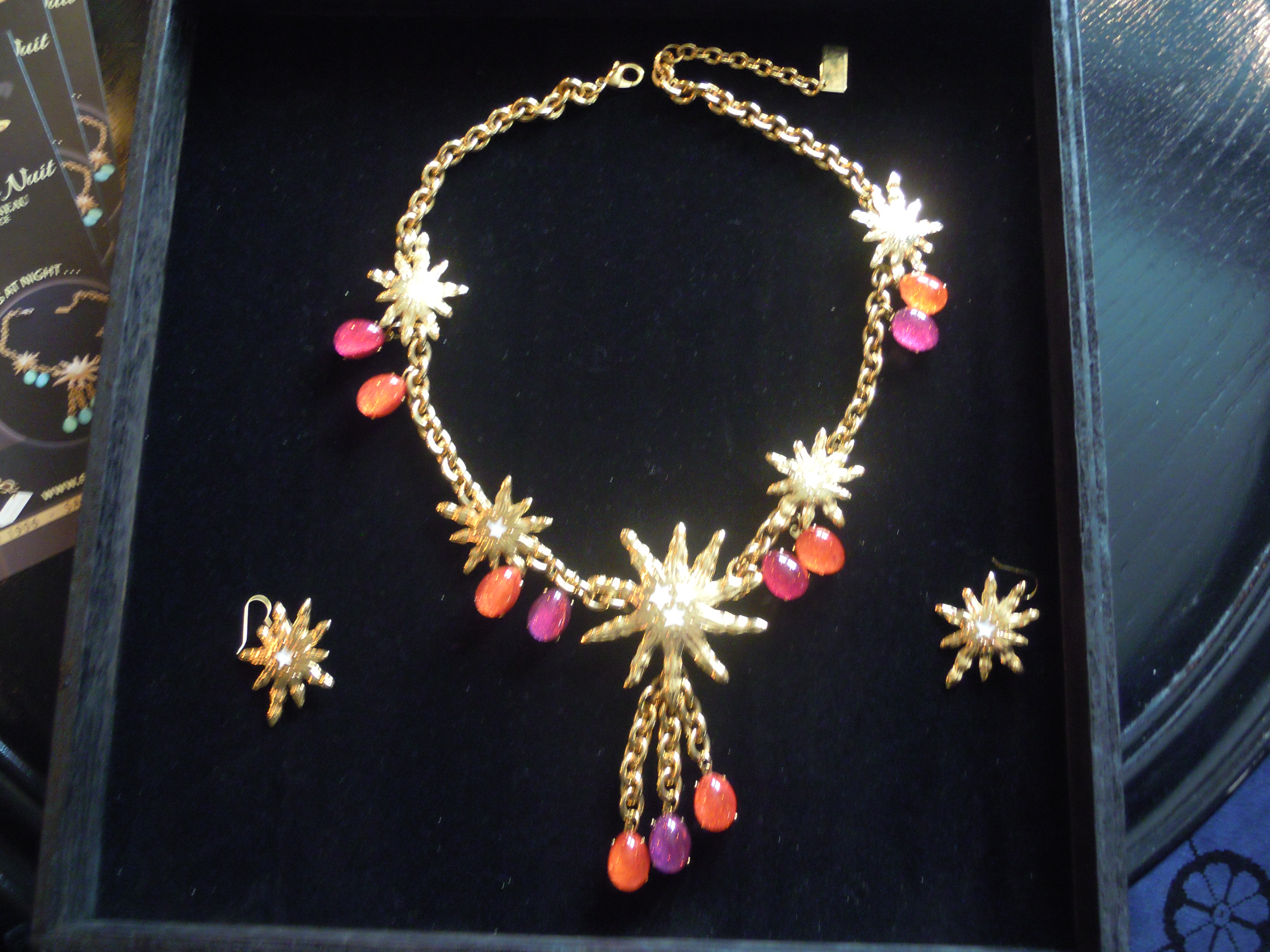 La première partie de cette collection se veut du « soir », car elle comprend des colliers, bracelets et boucles d’oreille plus imposants. L’image du soleil y est très présente. Ceux-ci, ainsi que les chaînes, sont en plaqué or. Les perles de résine, quant à elles, se déclinent dans des couleurs chaudes, comme le rose et l’orange, mais aussi dans des couleurs froides, le vert, le bleu, le violet. Ces pièces, une fois portées, font vite impression. Associées à une tenue très simple, les perles photoluminescentes ainsi que les soleils joueront parfaitement leur rôle lumineux !