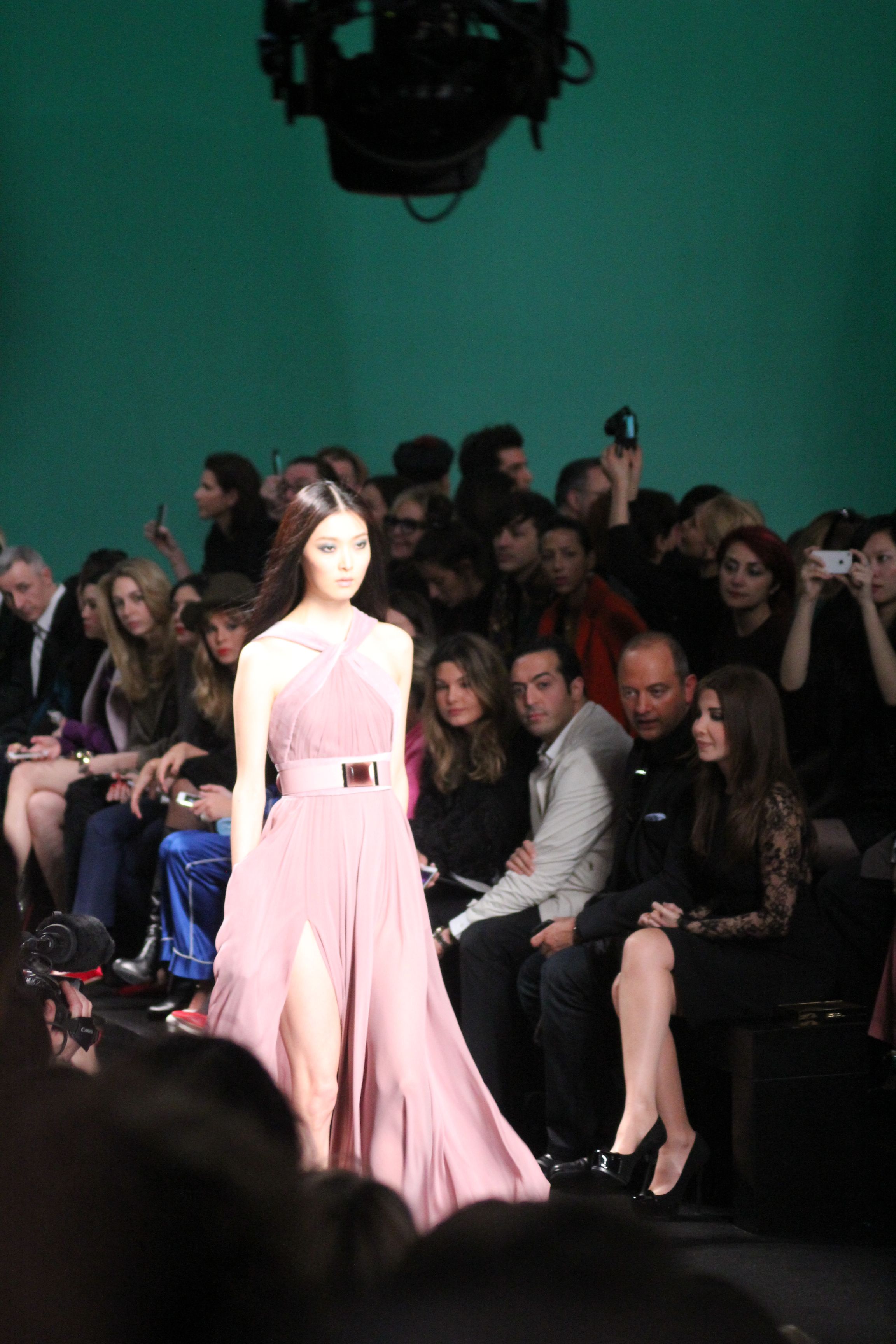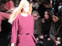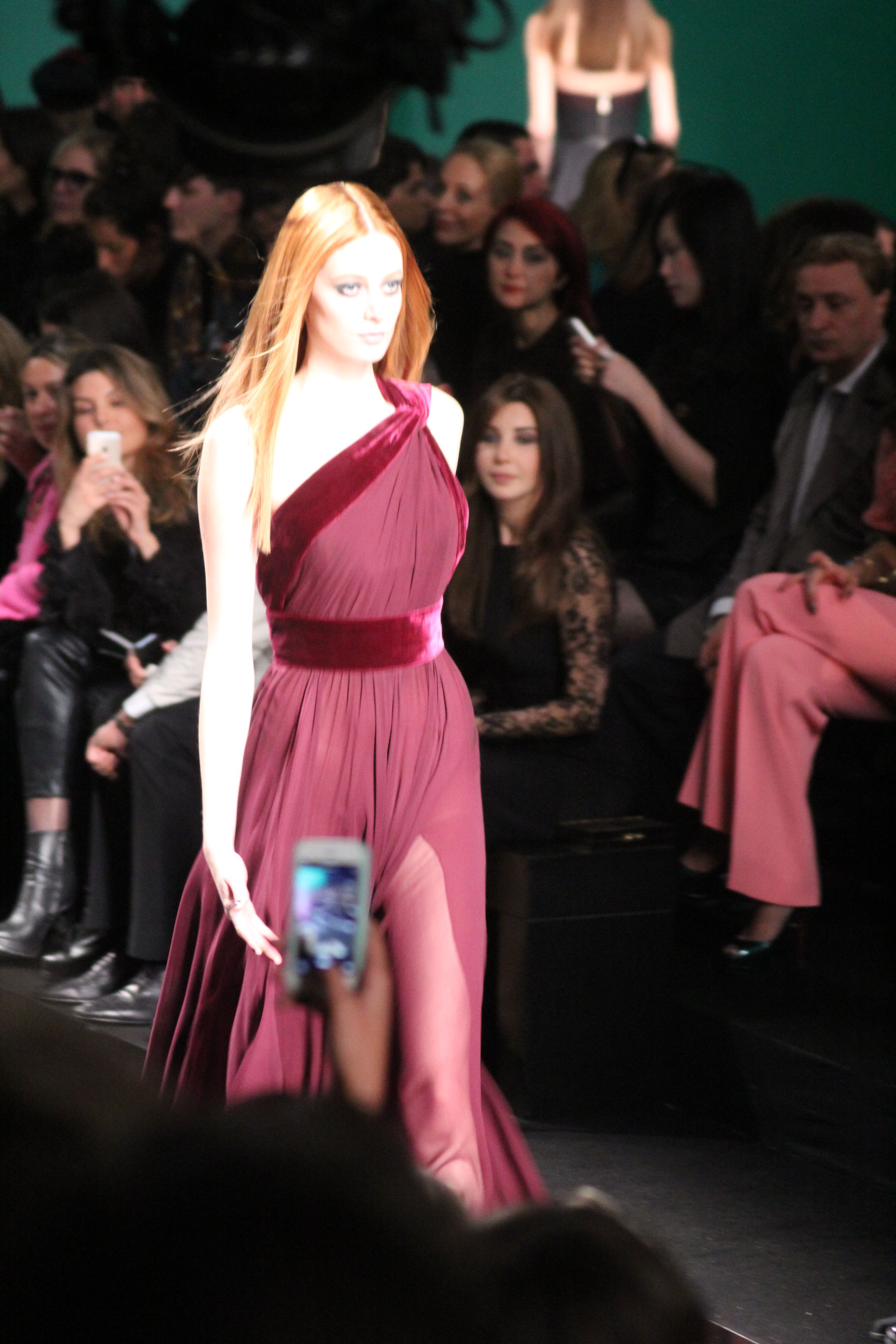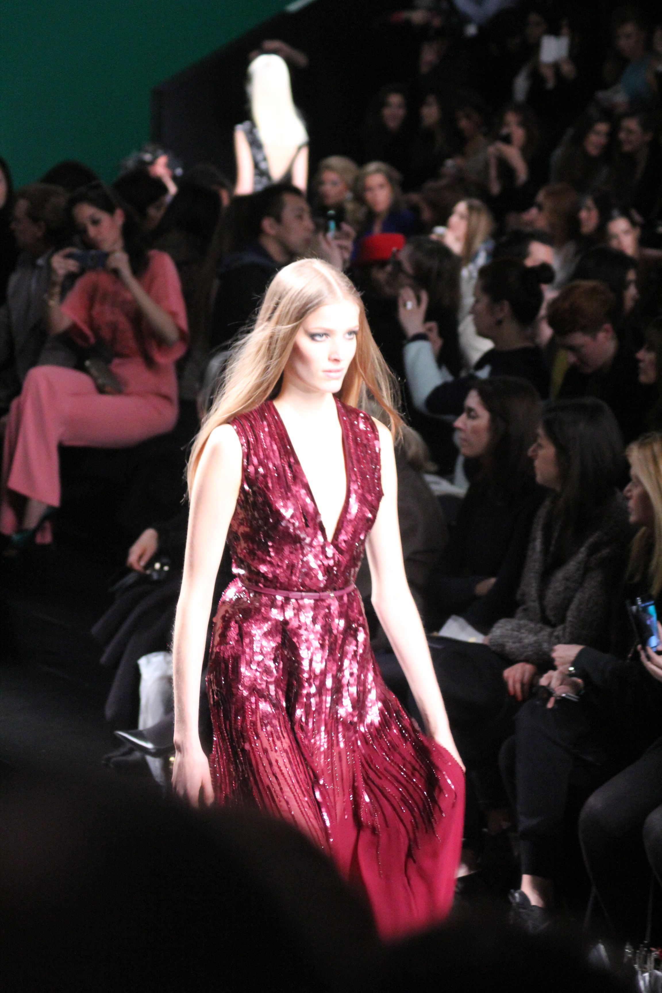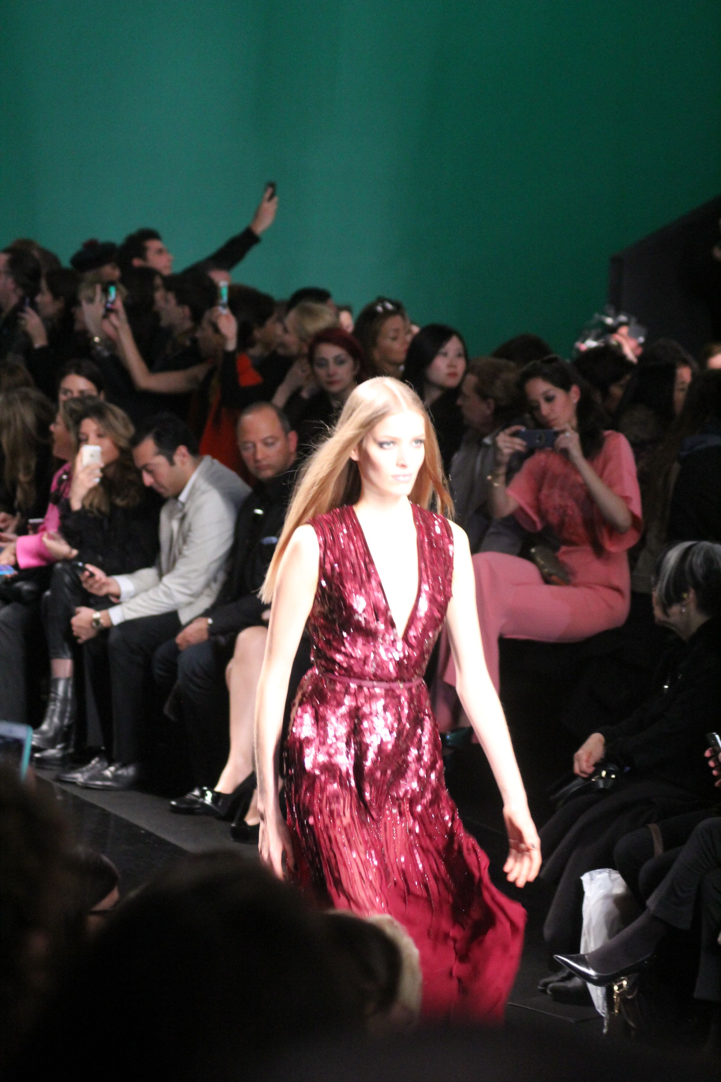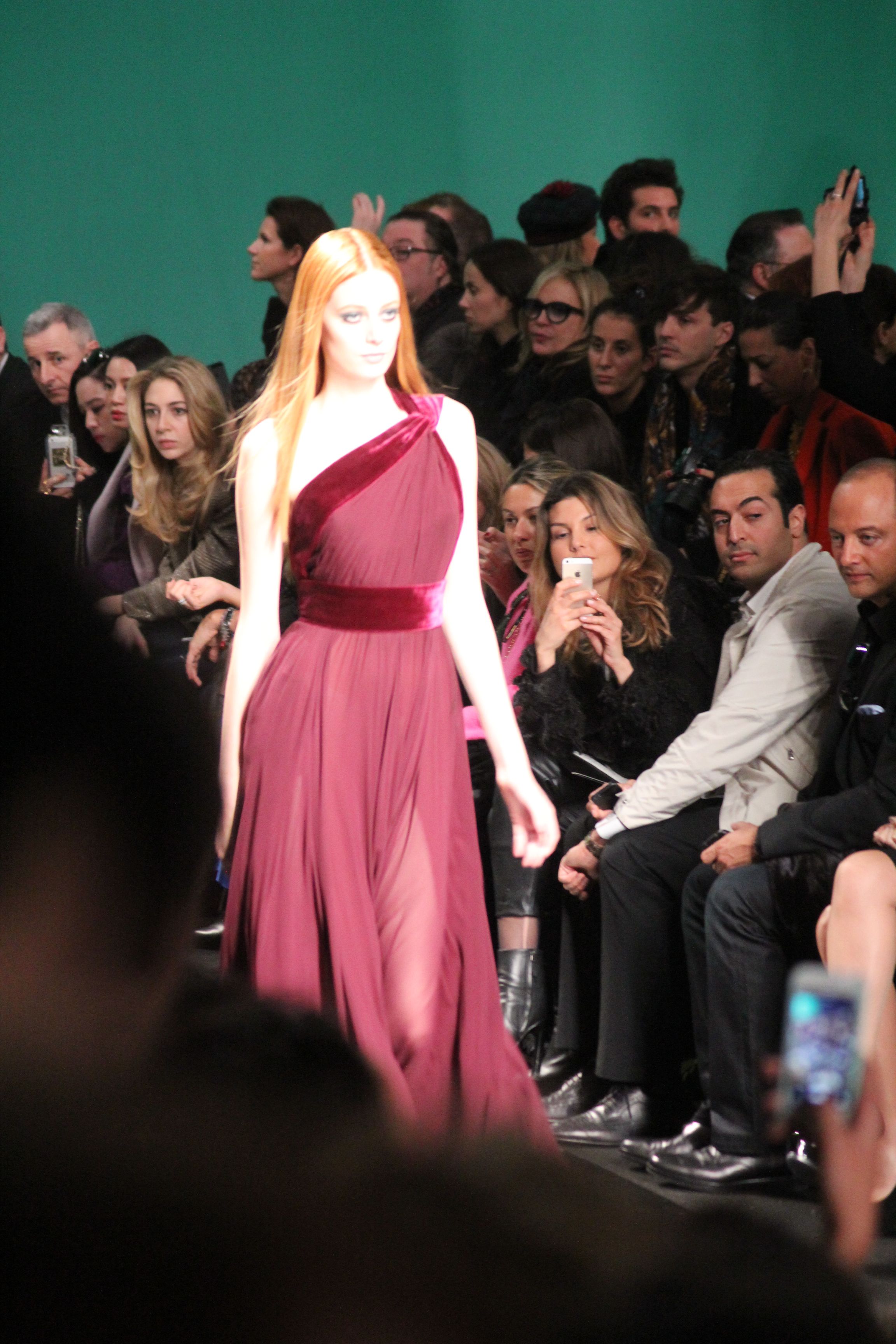 Pour cette collection automne hiver 2014-2015, Elie Saab propose un collection minimaliste, graphique et lumineuse. Inspirée d’abord par Mark Rohtko, elle est vouée comme son oeuvre à la couleur : ici rouge profond et vert empire, maître des corps, sculptent l’allure de manière envoutante. Chaque nuance est prétexte à recourir à une déclinaison de lignes asymétriques qui rappellent celles très structurées des années 50-60.
