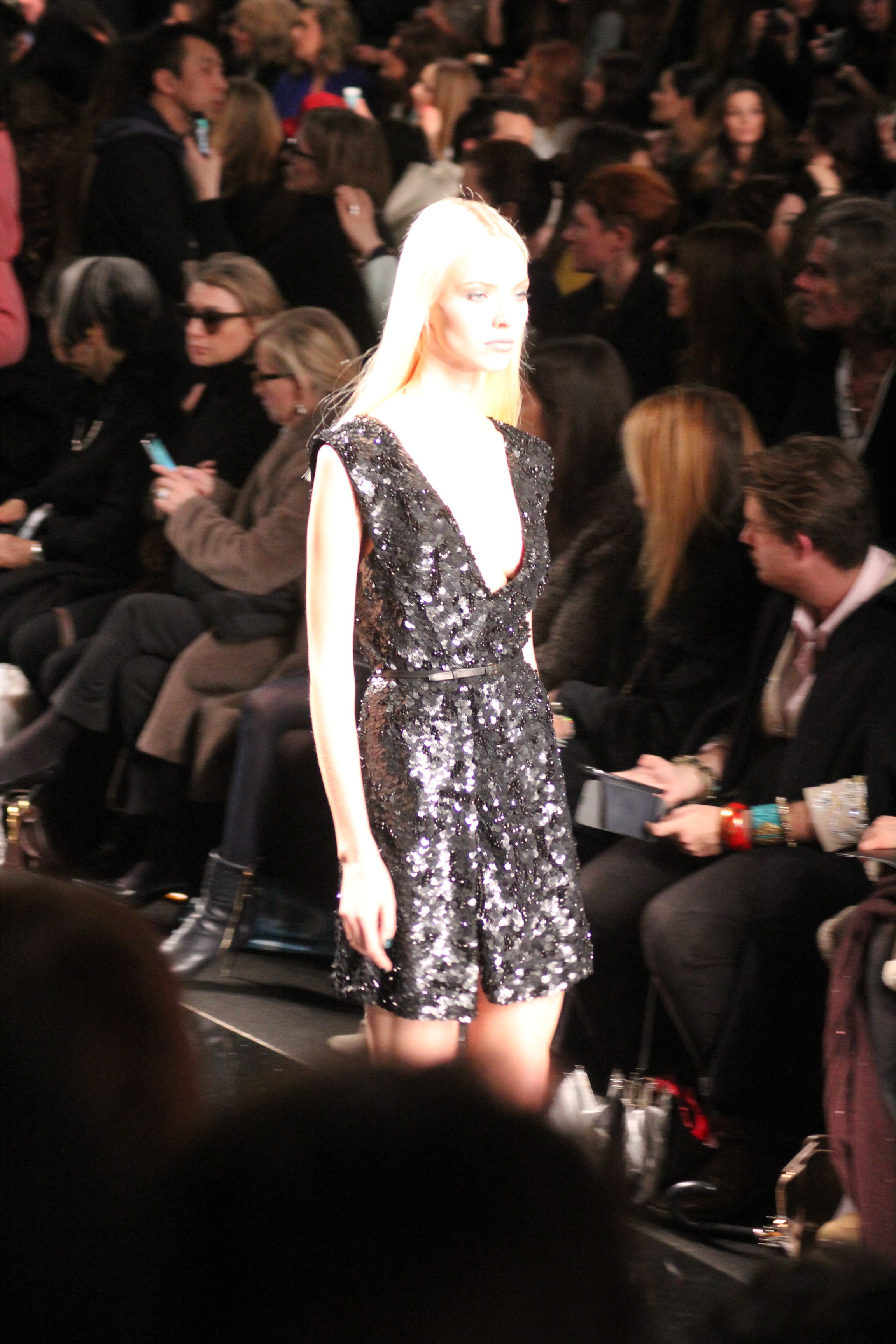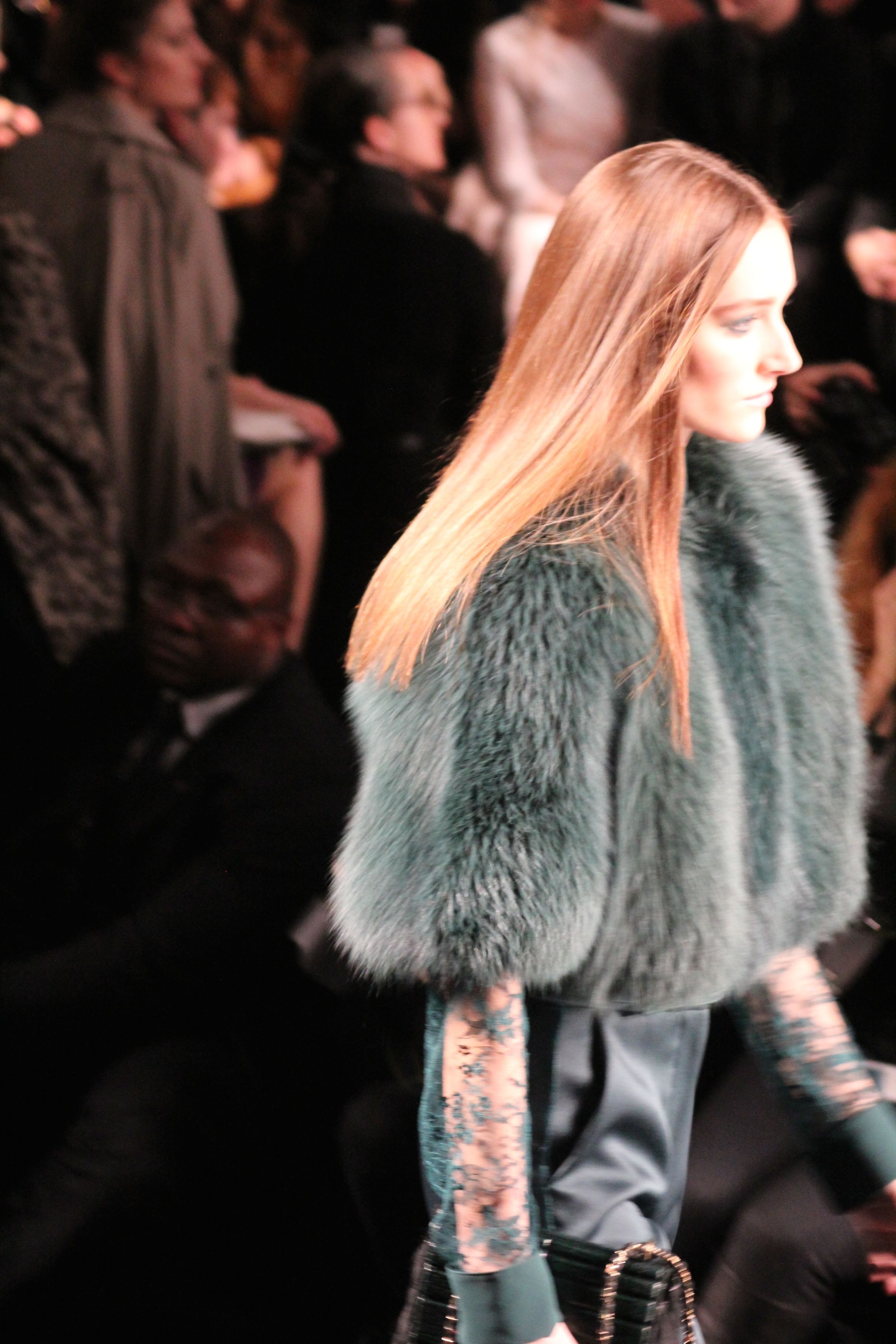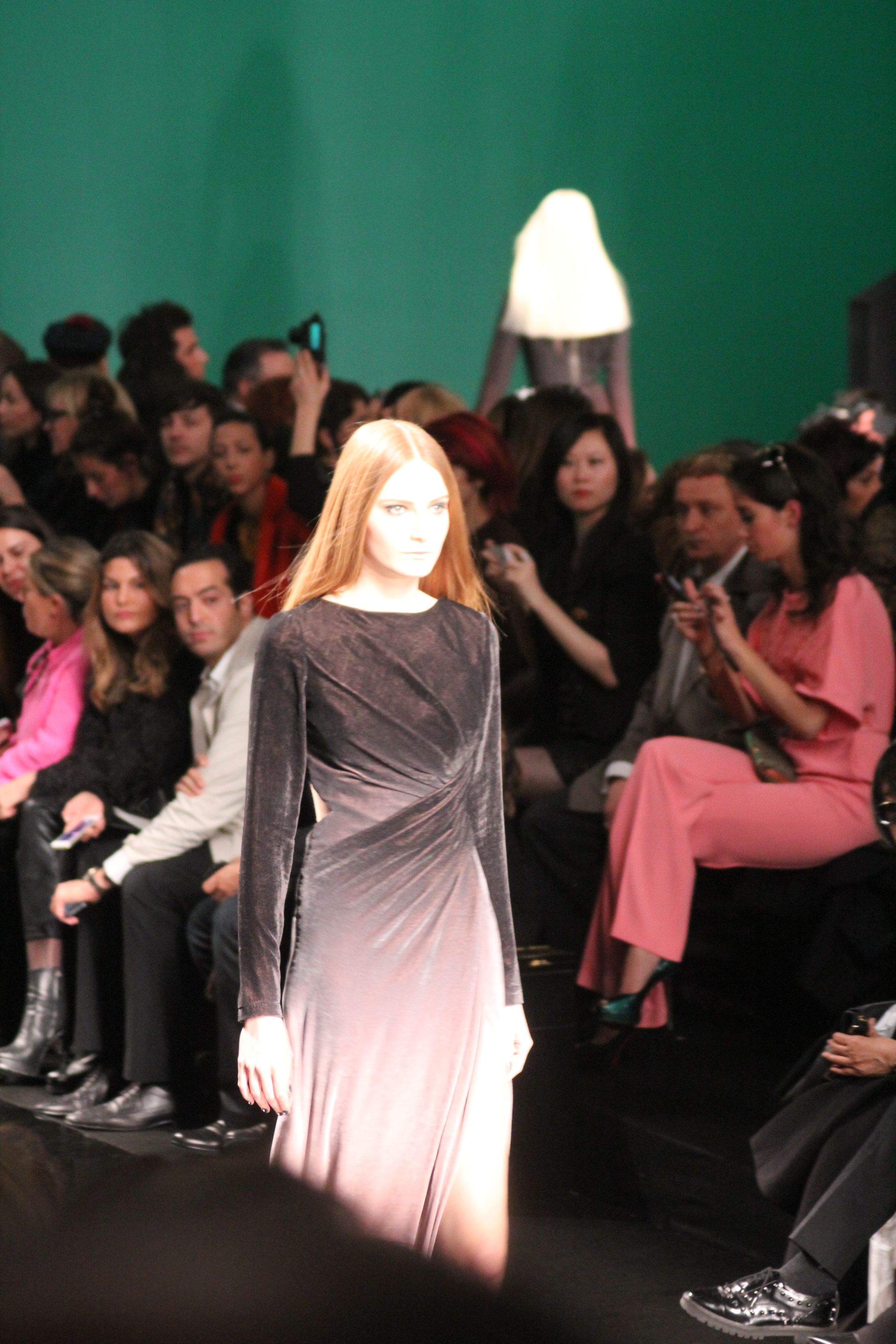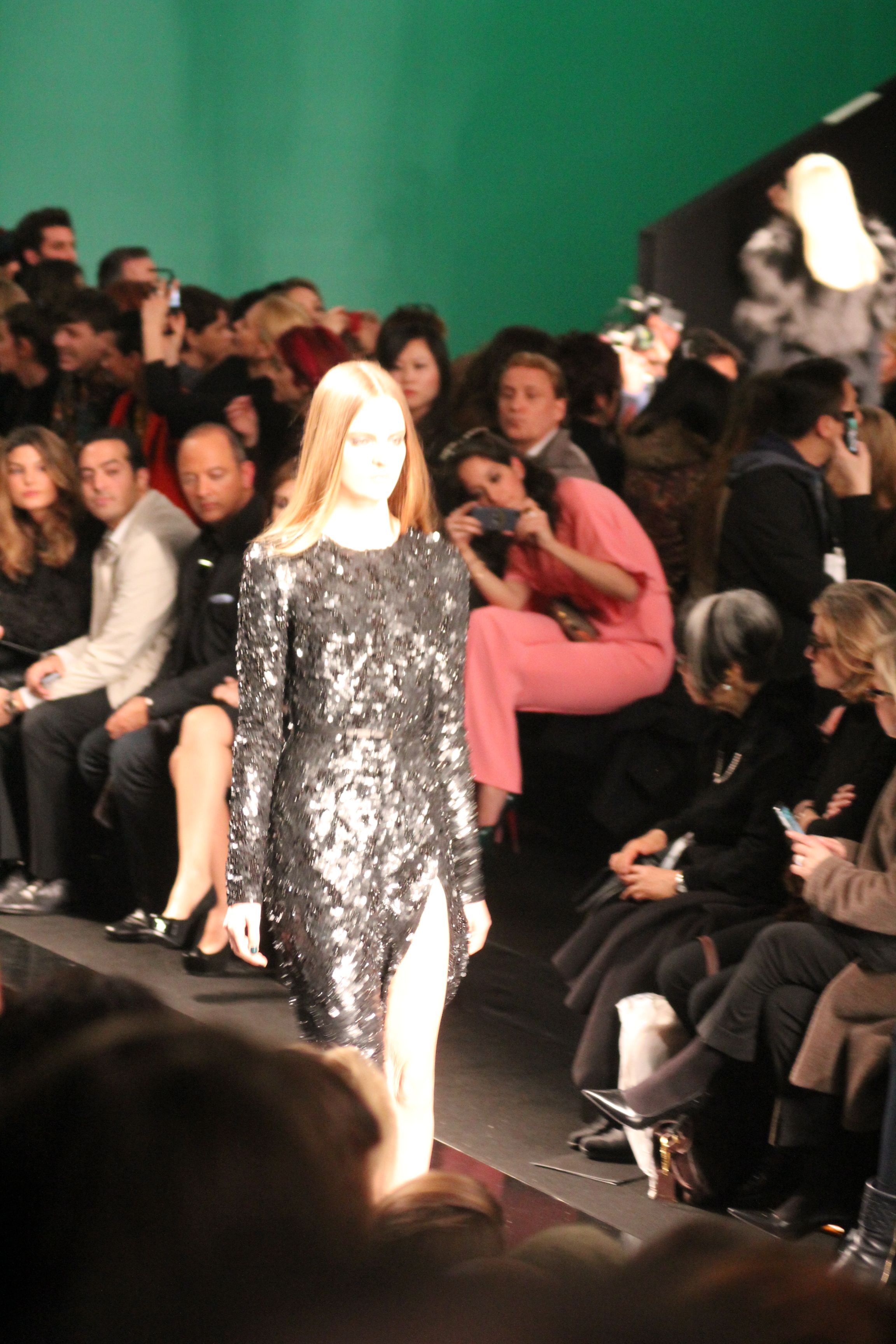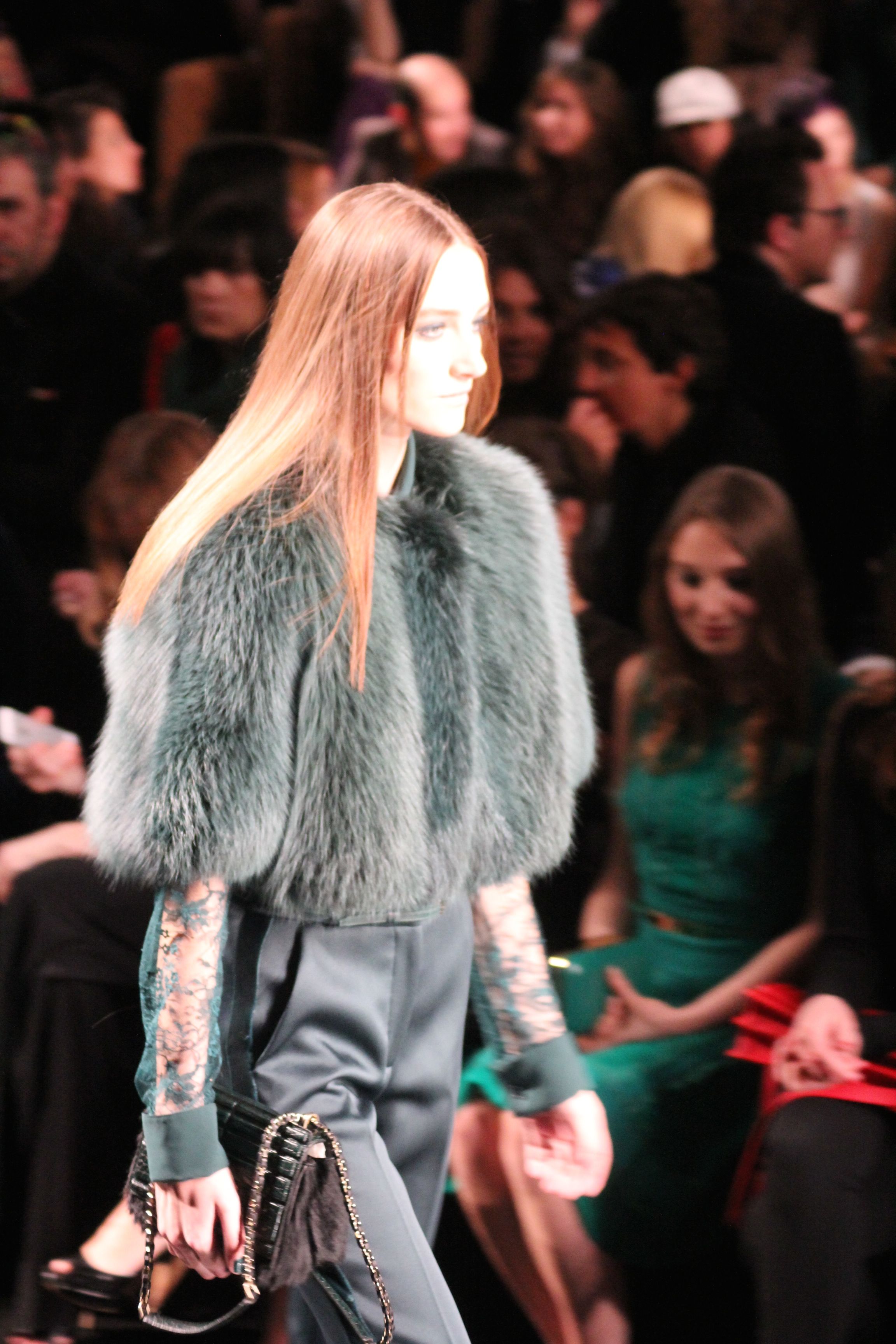 Dégradés ton sur ton, les silhouettes évoluent dans des jeux de matières précieuses : ici, un manteau en fourrure diapré et structuré se dessine de manière élégante et sensuelle. Là, un jeu de paillettes brodées parsème et illumine une robe vertigineuse.