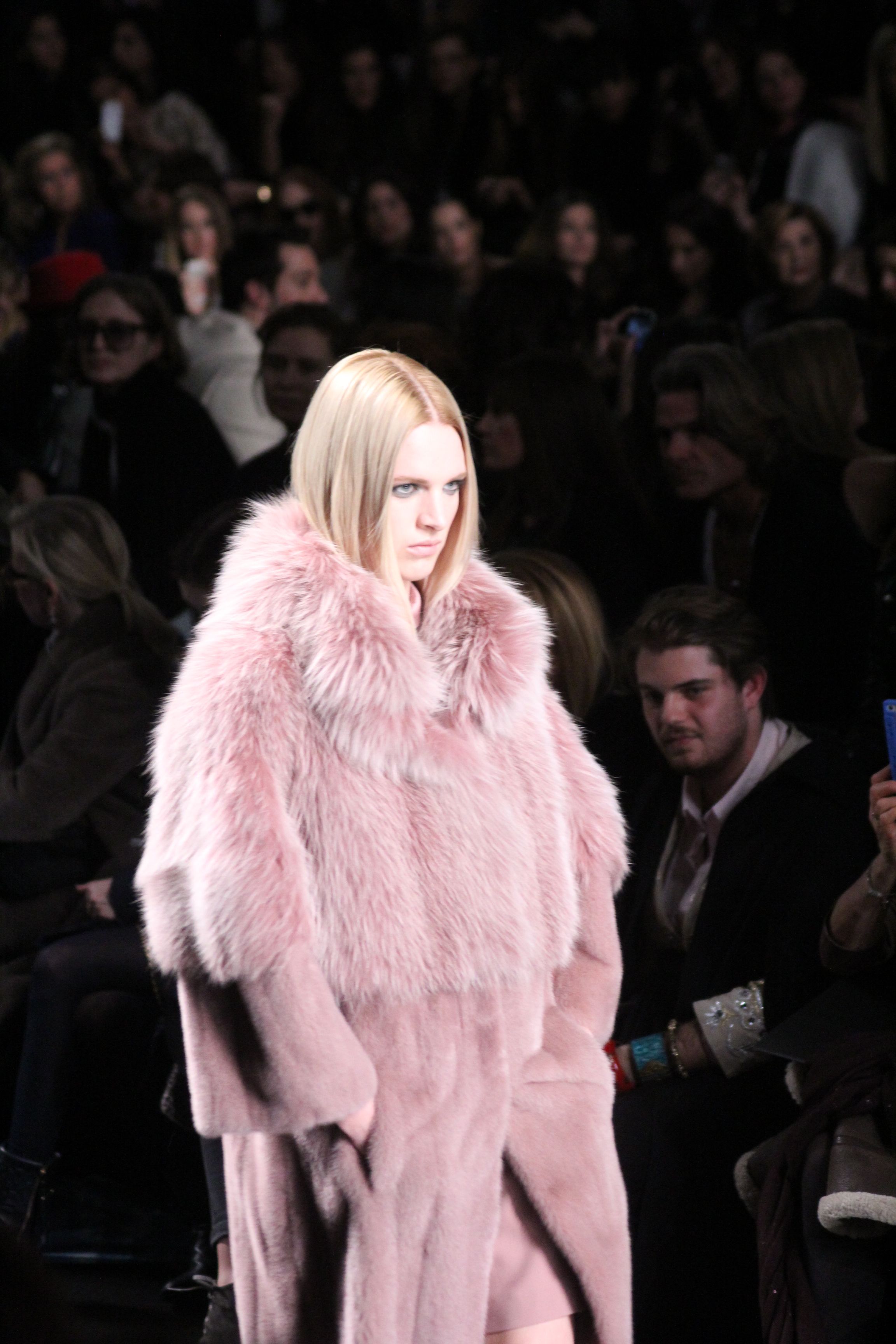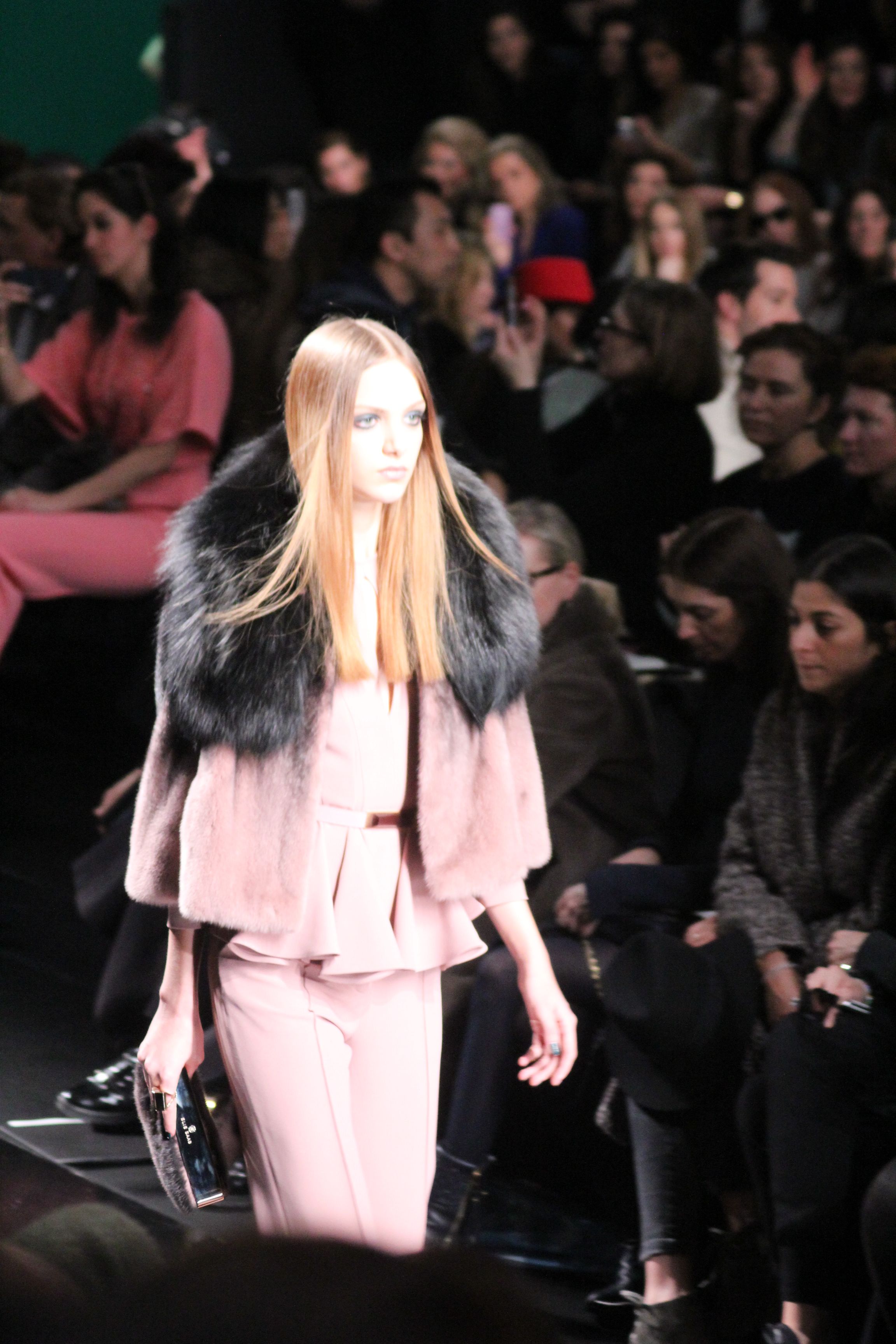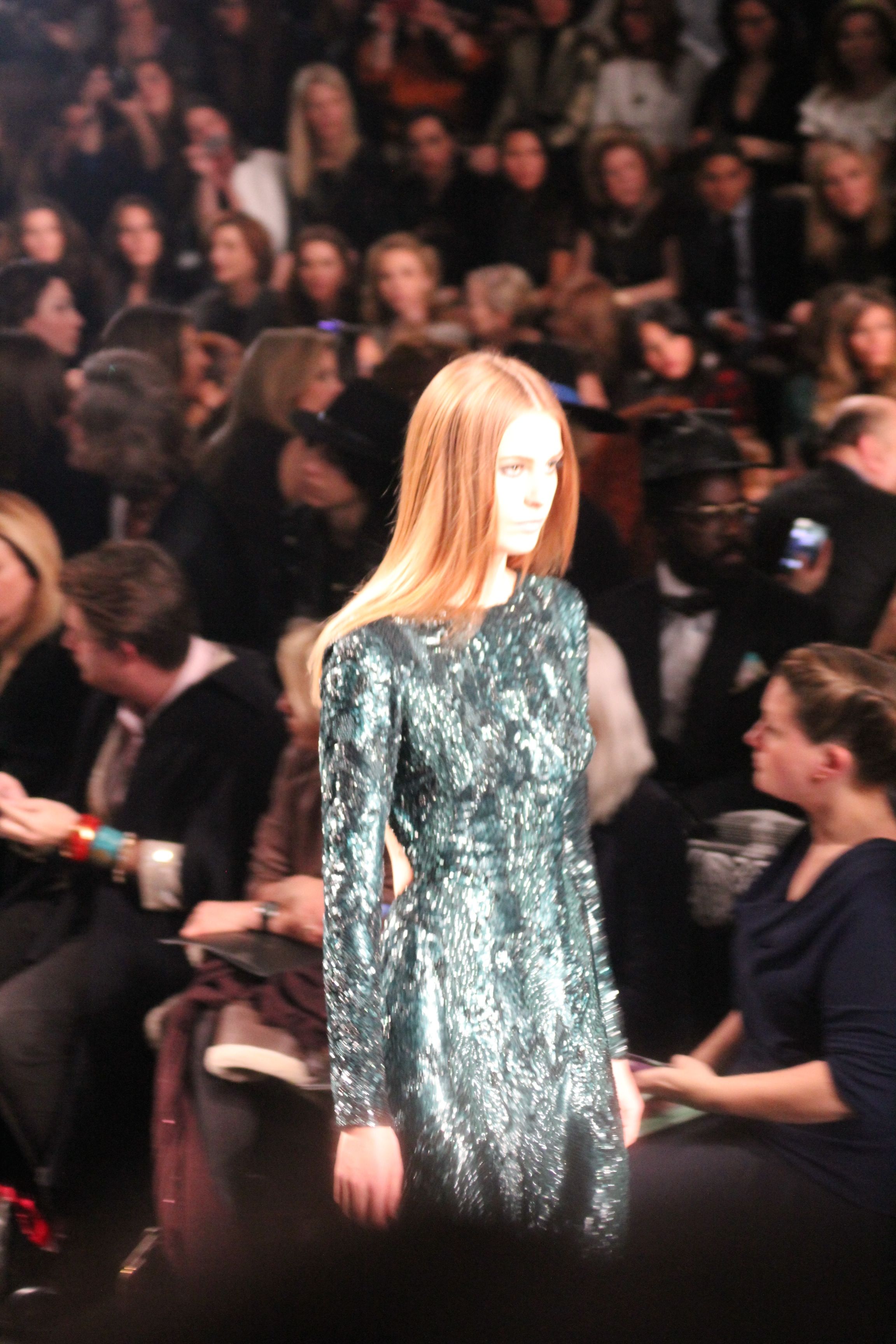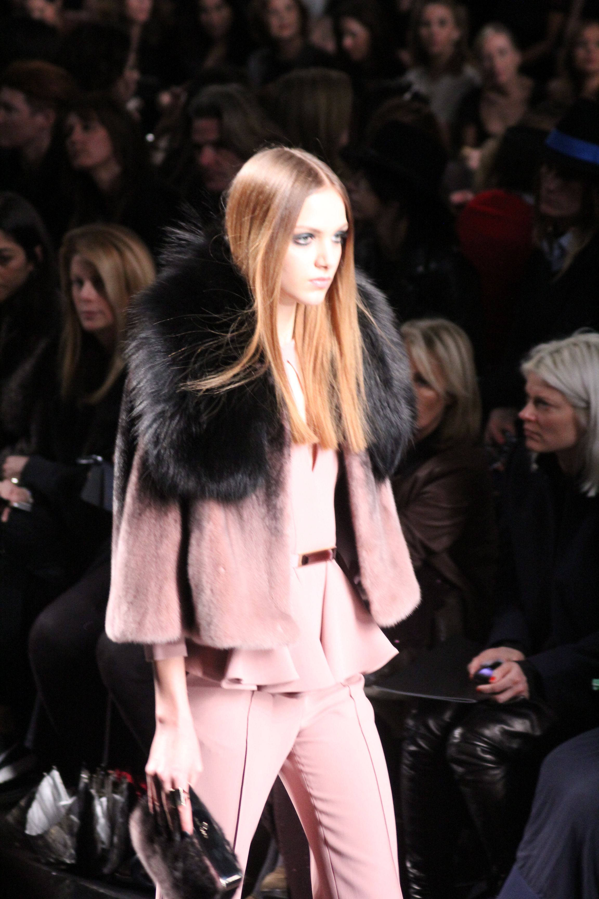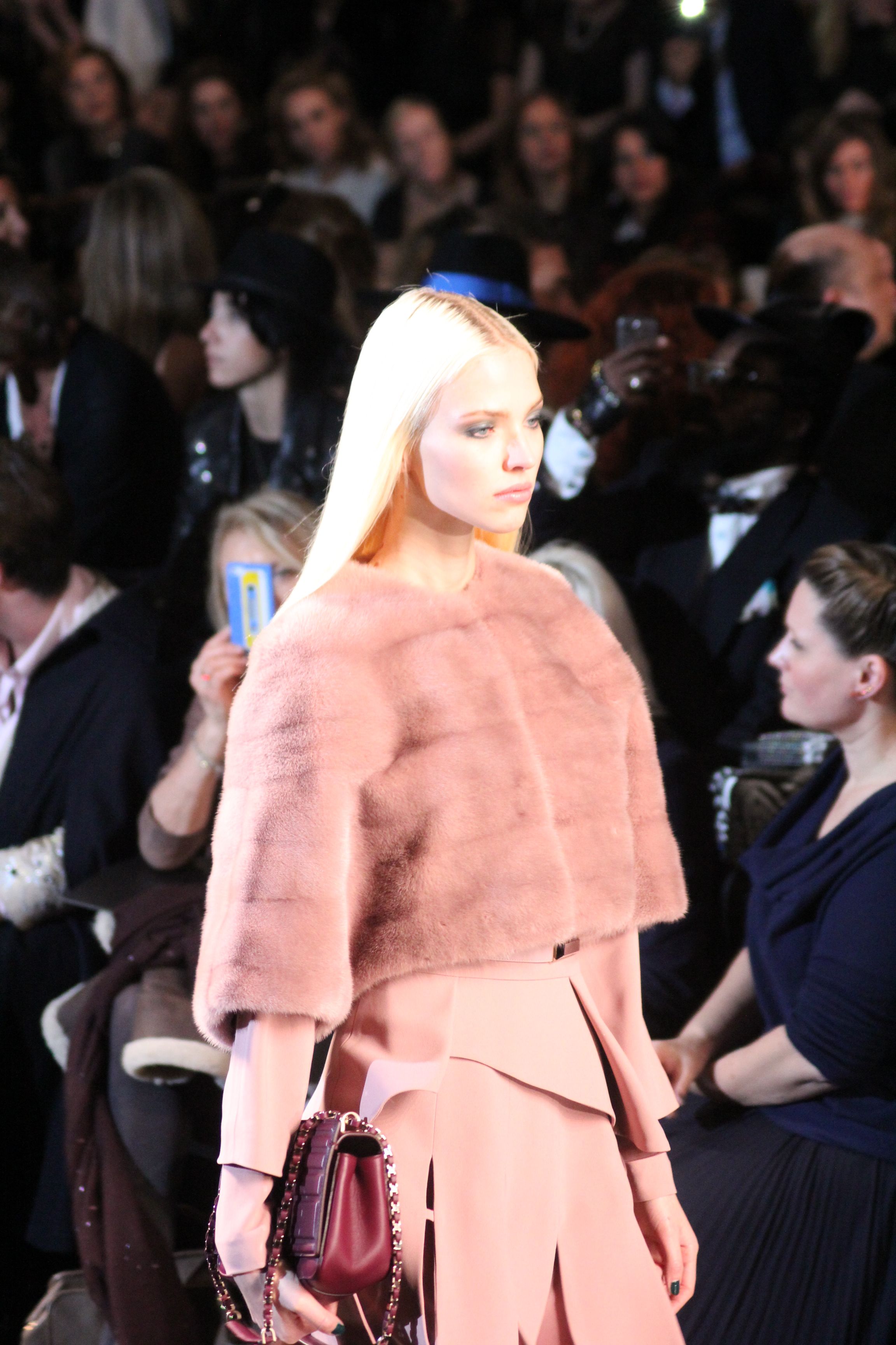 Dégradés ton sur ton, les silhouettes évoluent dans des jeux de matières précieuses : ici, un manteau en fourrure diapré et structuré se dessine de manière élégante et sensuelle. Là, un jeu de paillettes brodées parsème et illumine une robe vertigineuse.