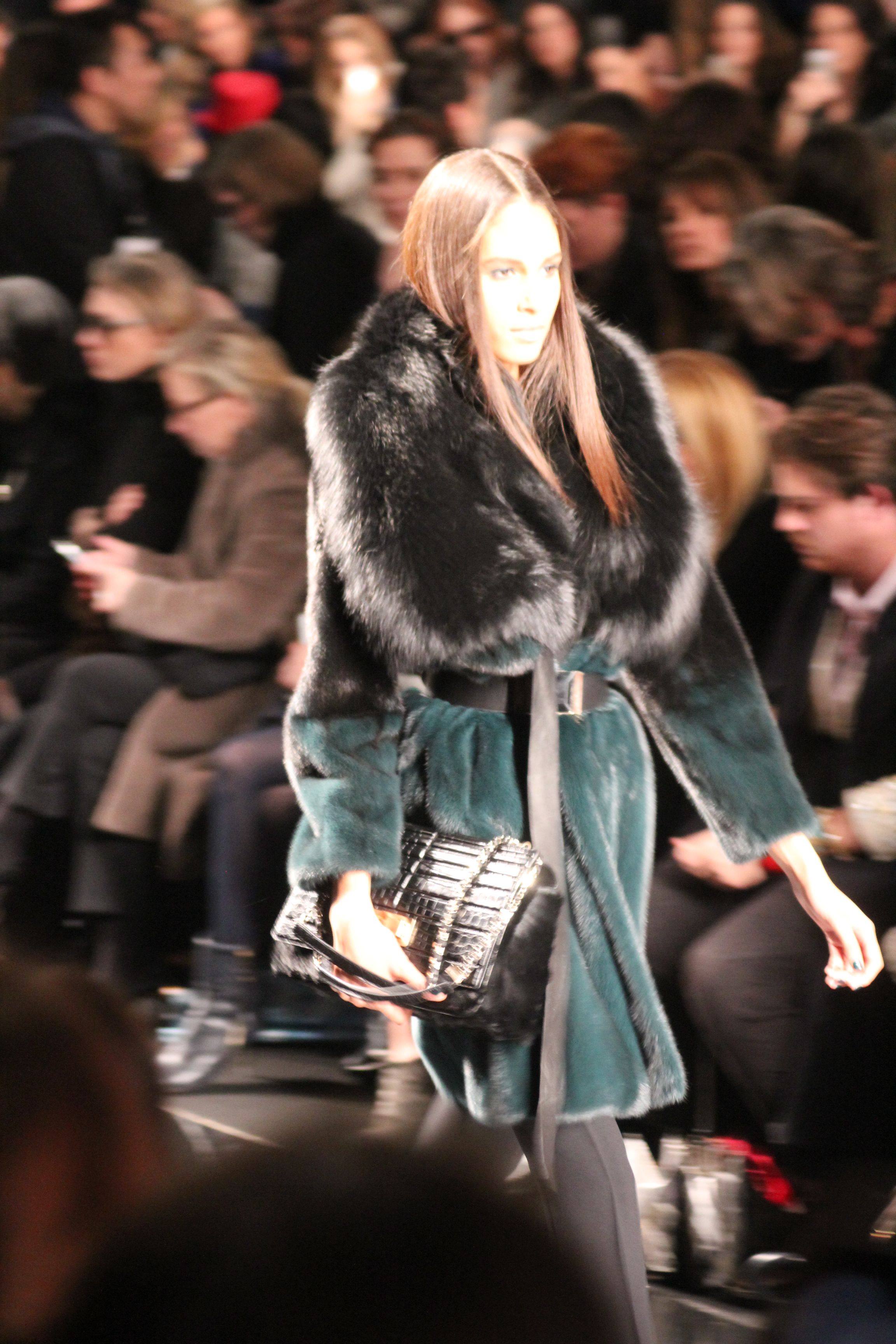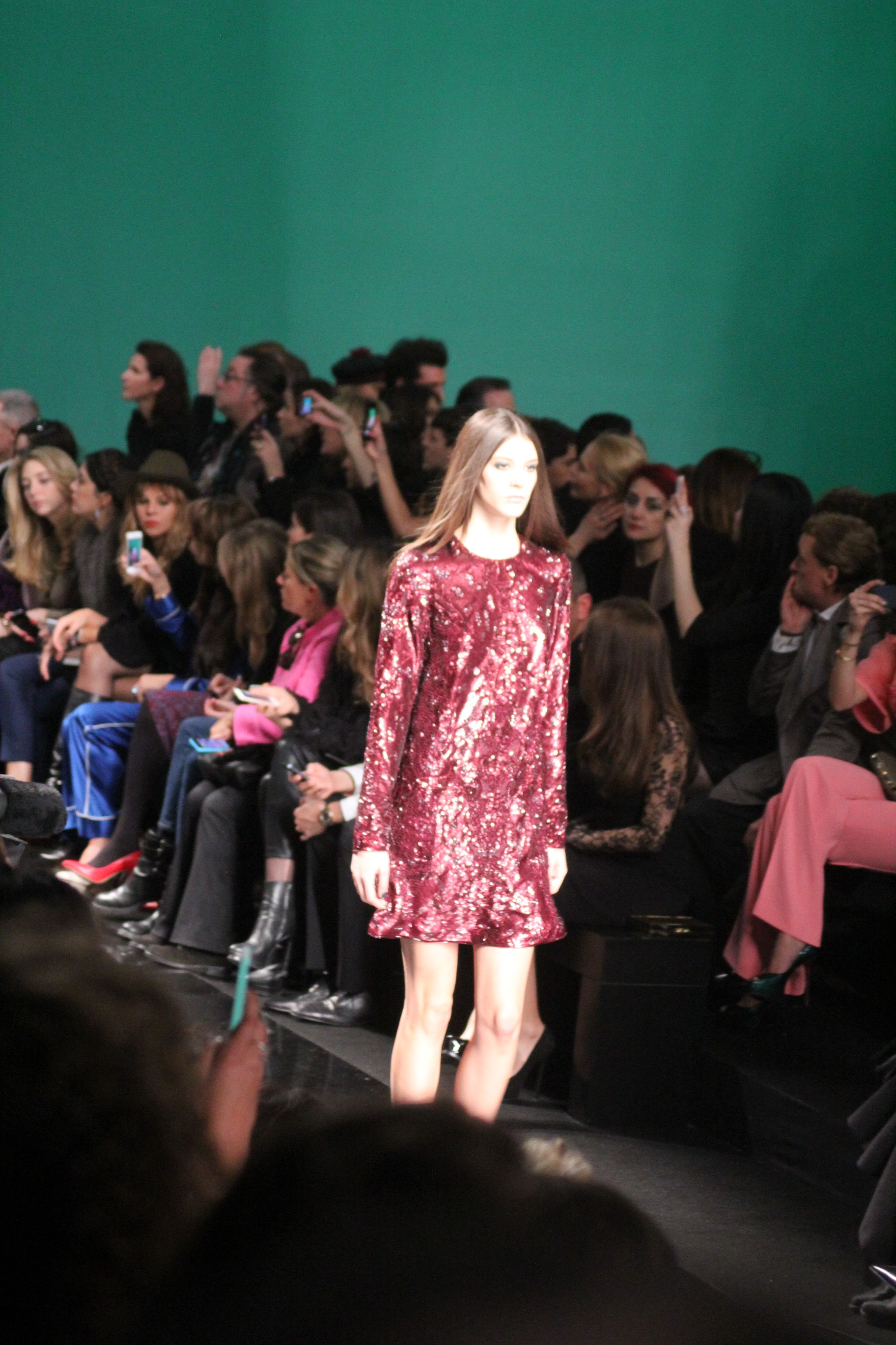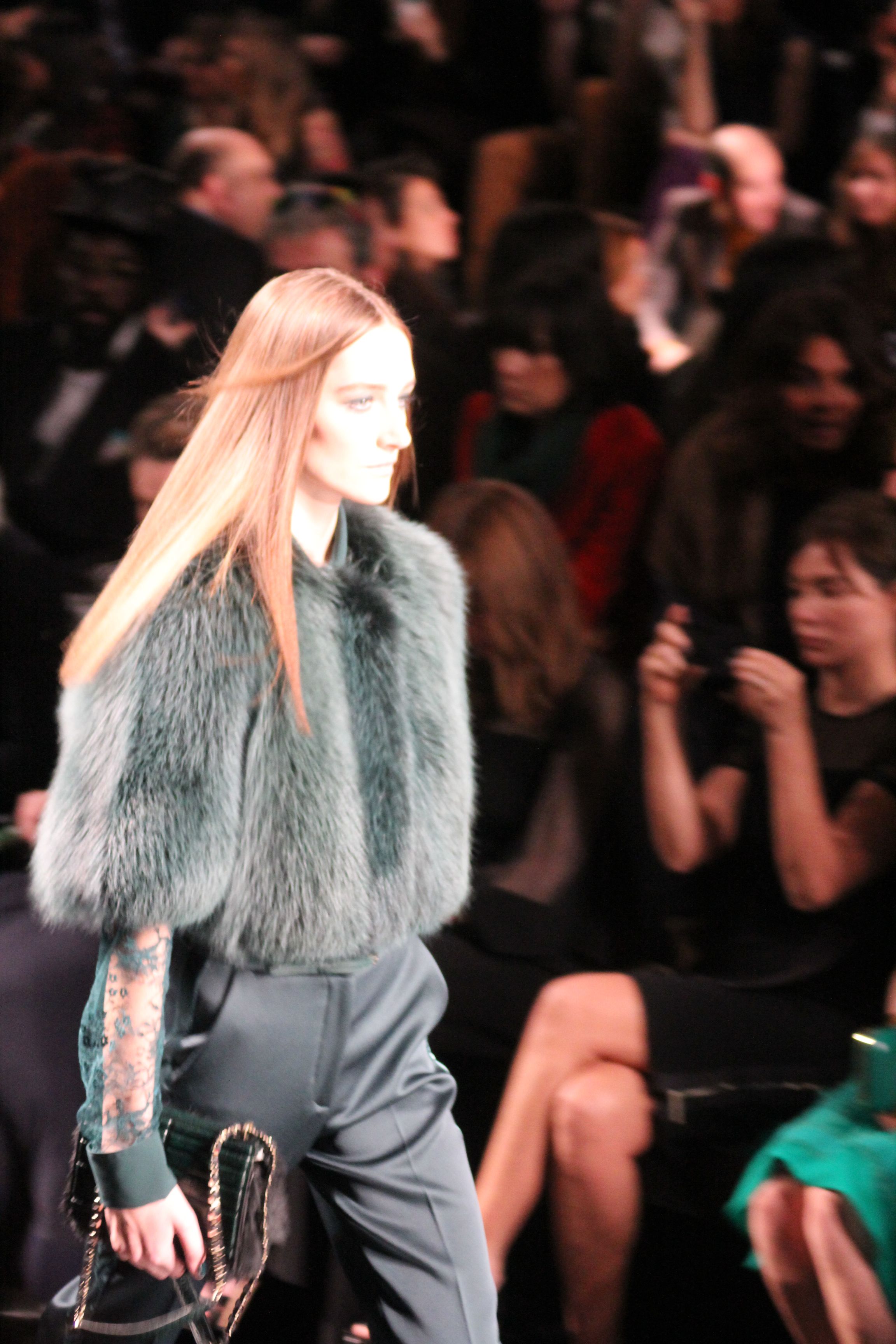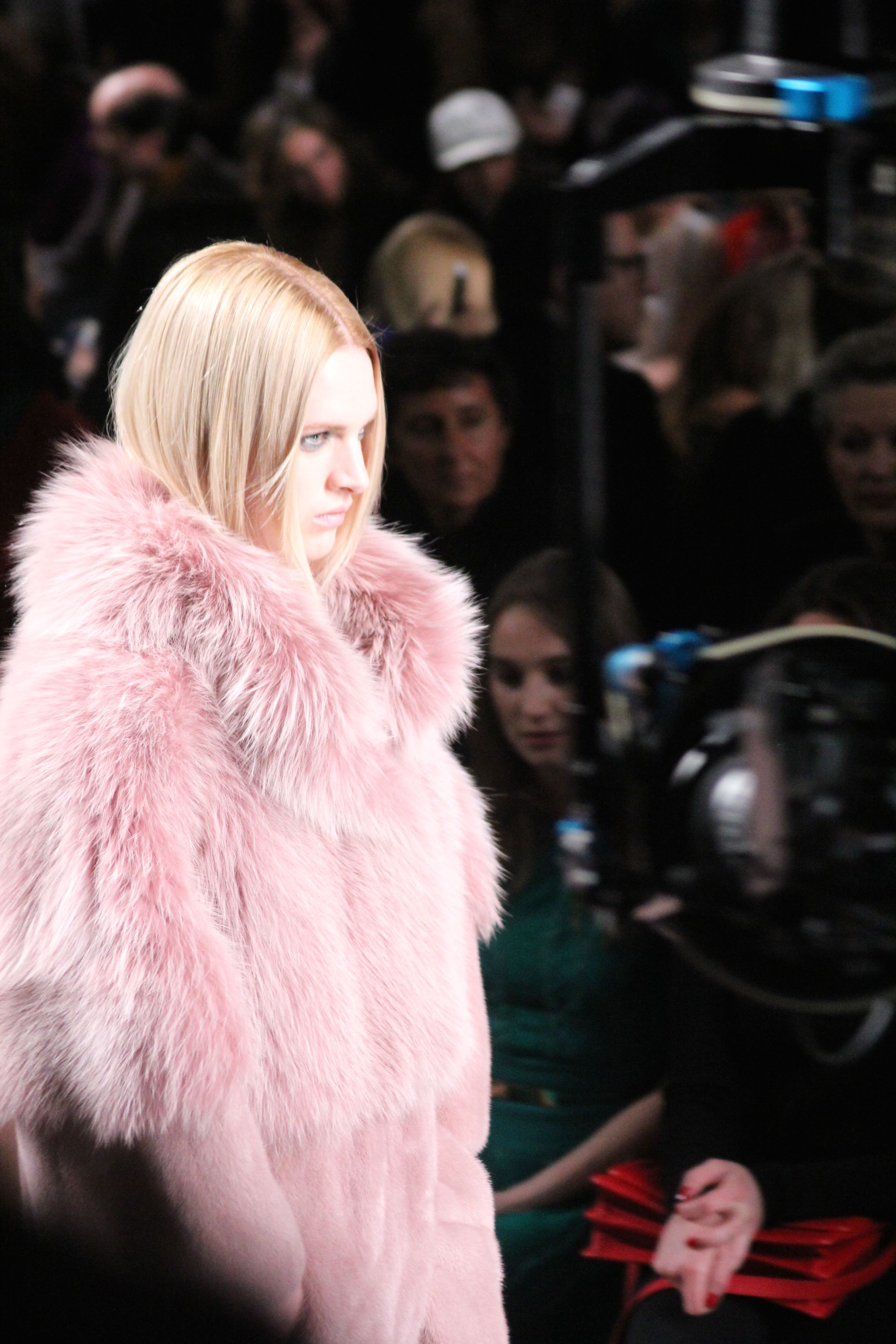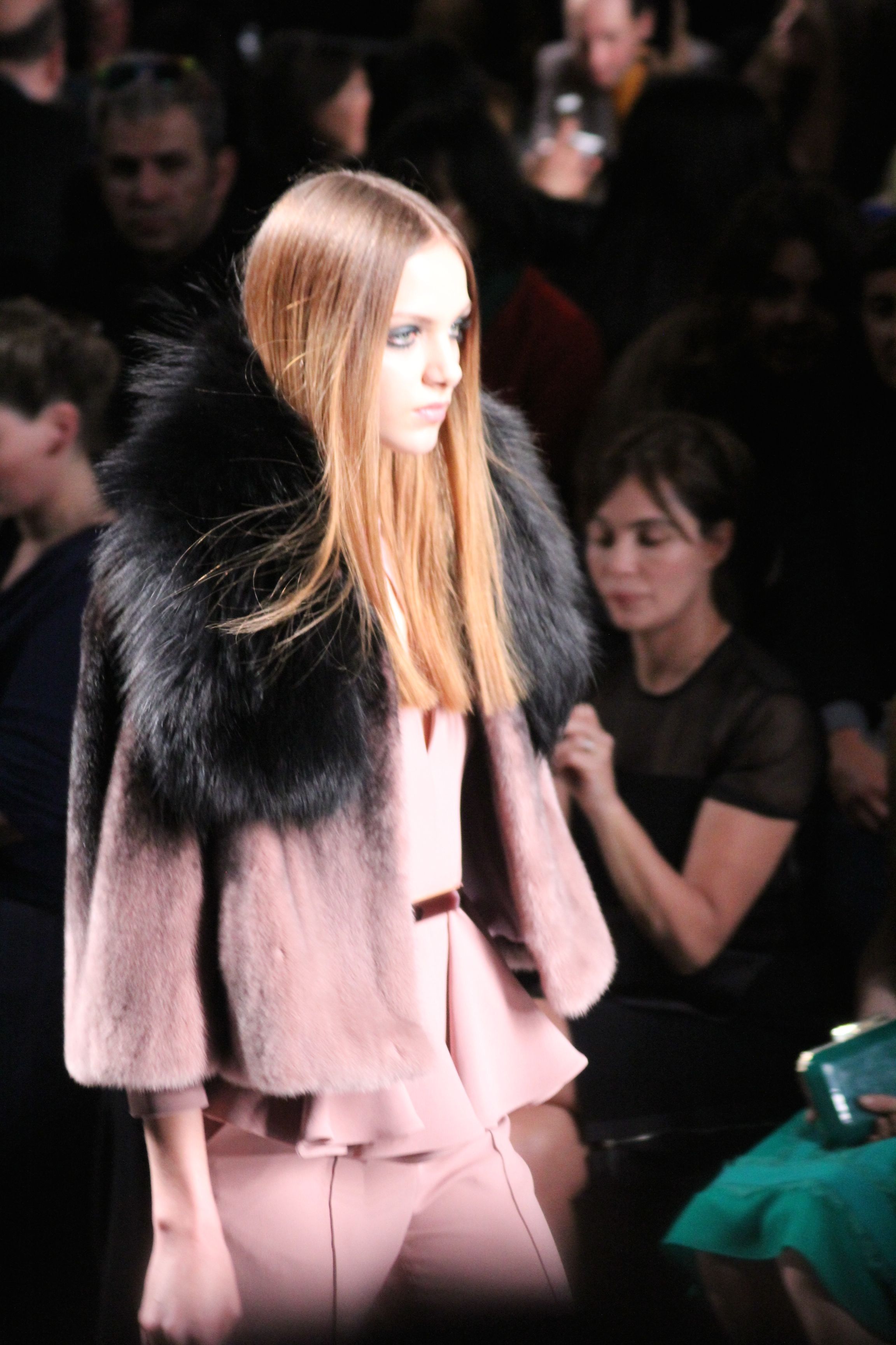 Dégradés ton sur ton, les silhouettes évoluent dans des jeux de matières précieuses : ici, un manteau en fourrure diapré et structuré se dessine de manière élégante et sensuelle. Là, un jeu de paillettes brodées parsème et illumine une robe vertigineuse.